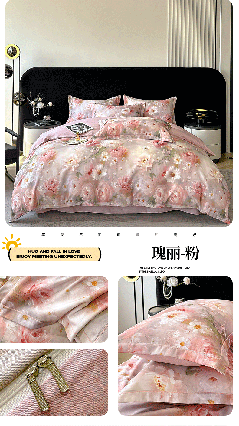 商品名称:喜四方 2025新款加厚天丝棉磨毛数码印花四件套 瑰丽-粉