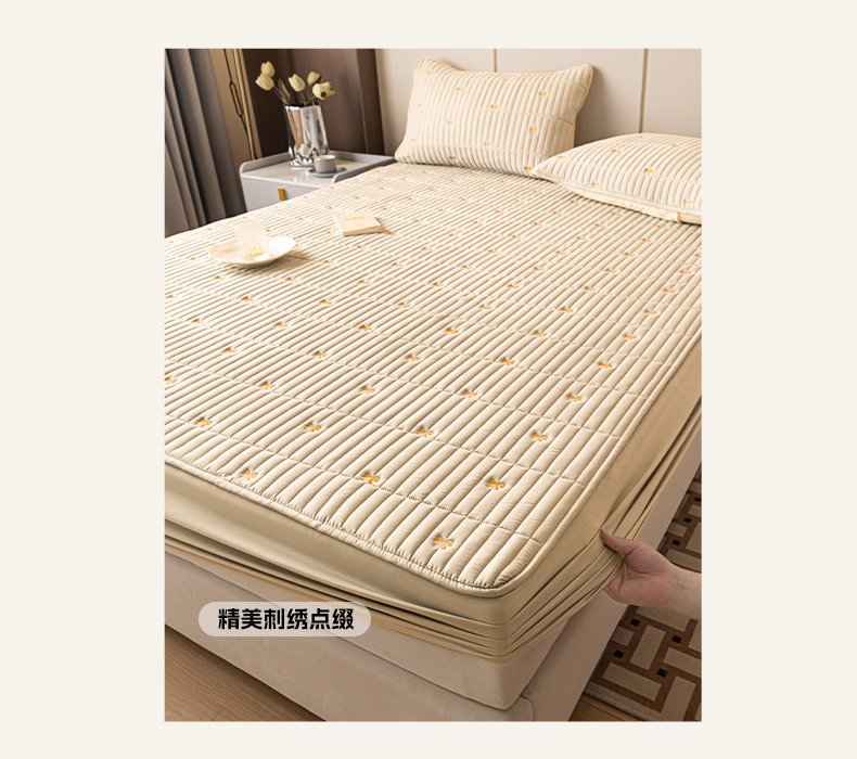 • 91家纺网 家纺一手货源 找家纺 暖季家纺 2025新款A类亲肤面料夹棉绣花床笠-防水款 小蝴蝶结-卡其-防水款