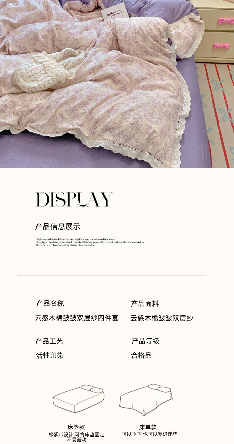 当前位置: 91家纺网 > 商品网购 > 床品套件 > 四件套 > 其它四件套 > 优尚佳生活馆 2025新款云感木棉皱皱双层纱全棉镂空花边四件套(提供买家秀) 午夜紫魅