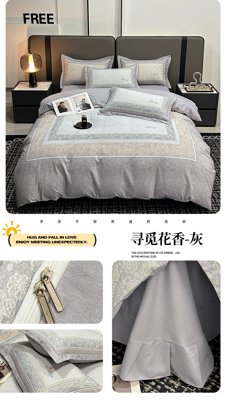 商品名称:喜四方 2025新款加厚全棉大版印花四件套 寻觅花香-灰