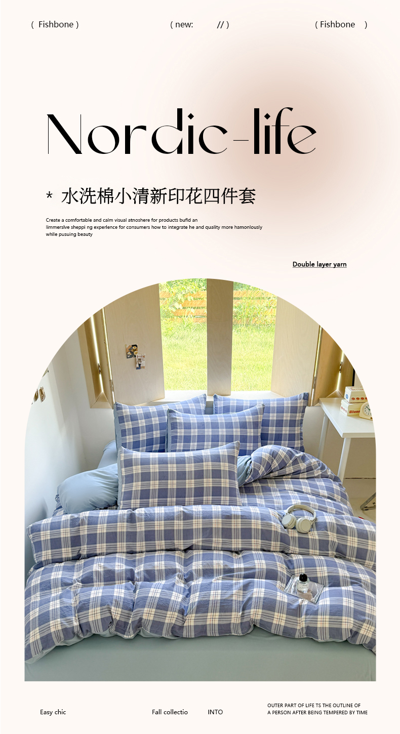(总)晚爱家纺(原晚安家居) 2025无印风四件套经典格子超柔水洗棉四件套