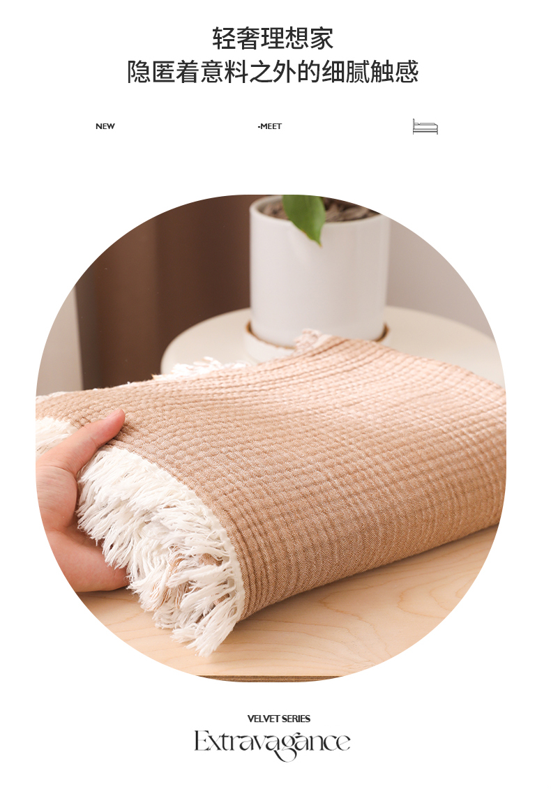 简宜家居(朝初家纺) 2025新款全棉100%棉四层纱流苏边毛毯子 流苏-焦糖褐