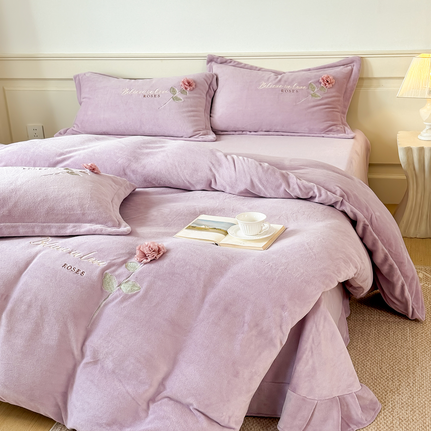 (总)恋尚羽家纺 2025新款韩版花边婴儿绒绣花大床裙四件套宝宝绒婴肤绒公主风韩式,大红色,豆沙色,粉色,湖蓝色,灰色,桔色,墨绿色,紫色