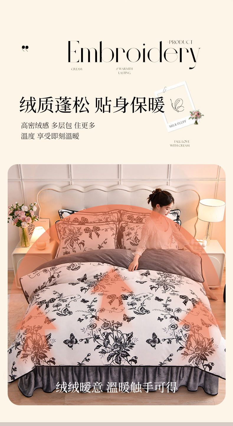 当前位置: 91家纺网 > 商品网购 > 床品套件 > 四件套 > 牛奶绒四件套 > 绒宴 2025新款8.5斤牛奶绒金貂法莱绒床裙款保暖四件套 似水流年