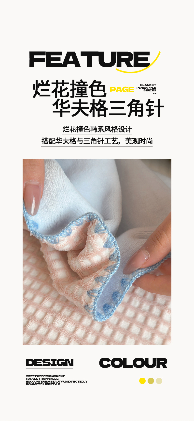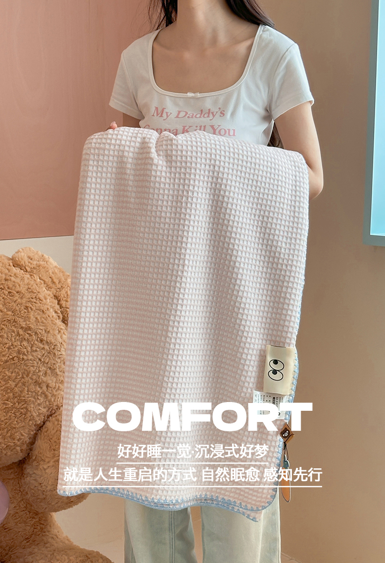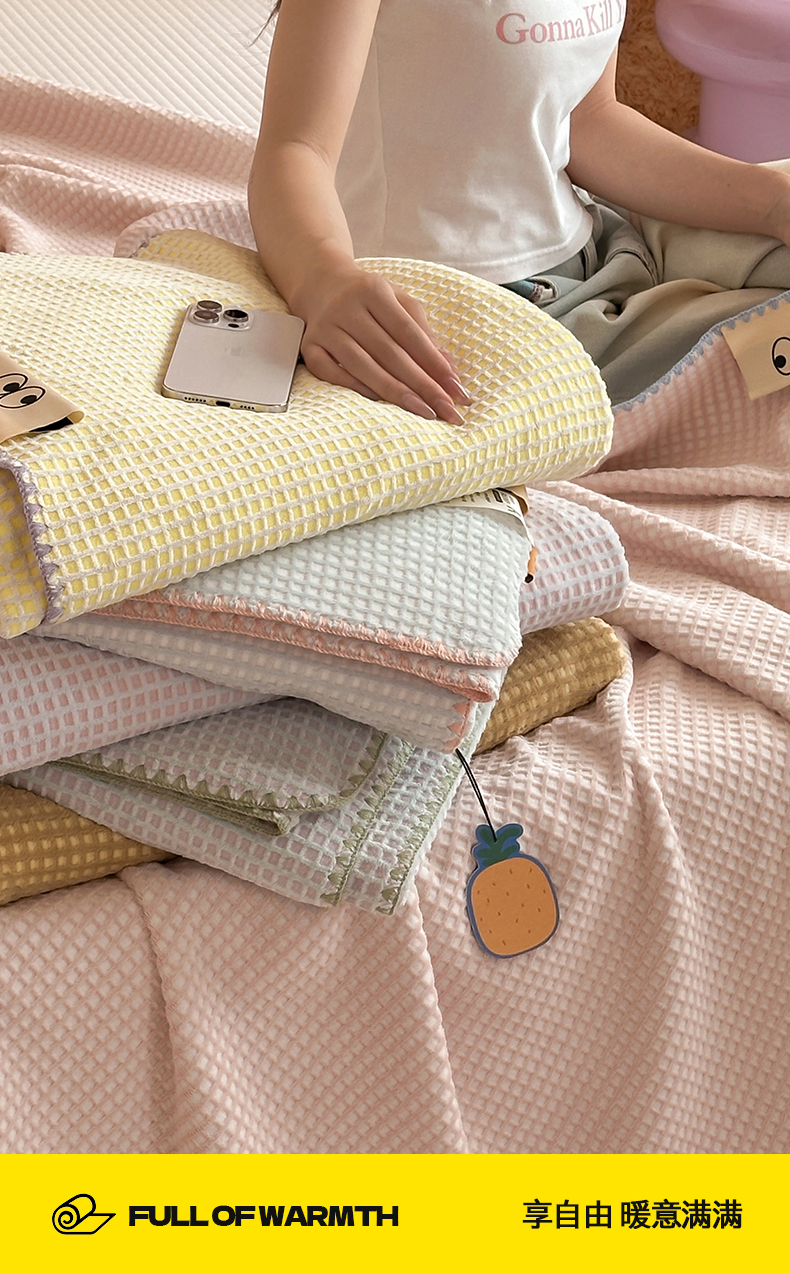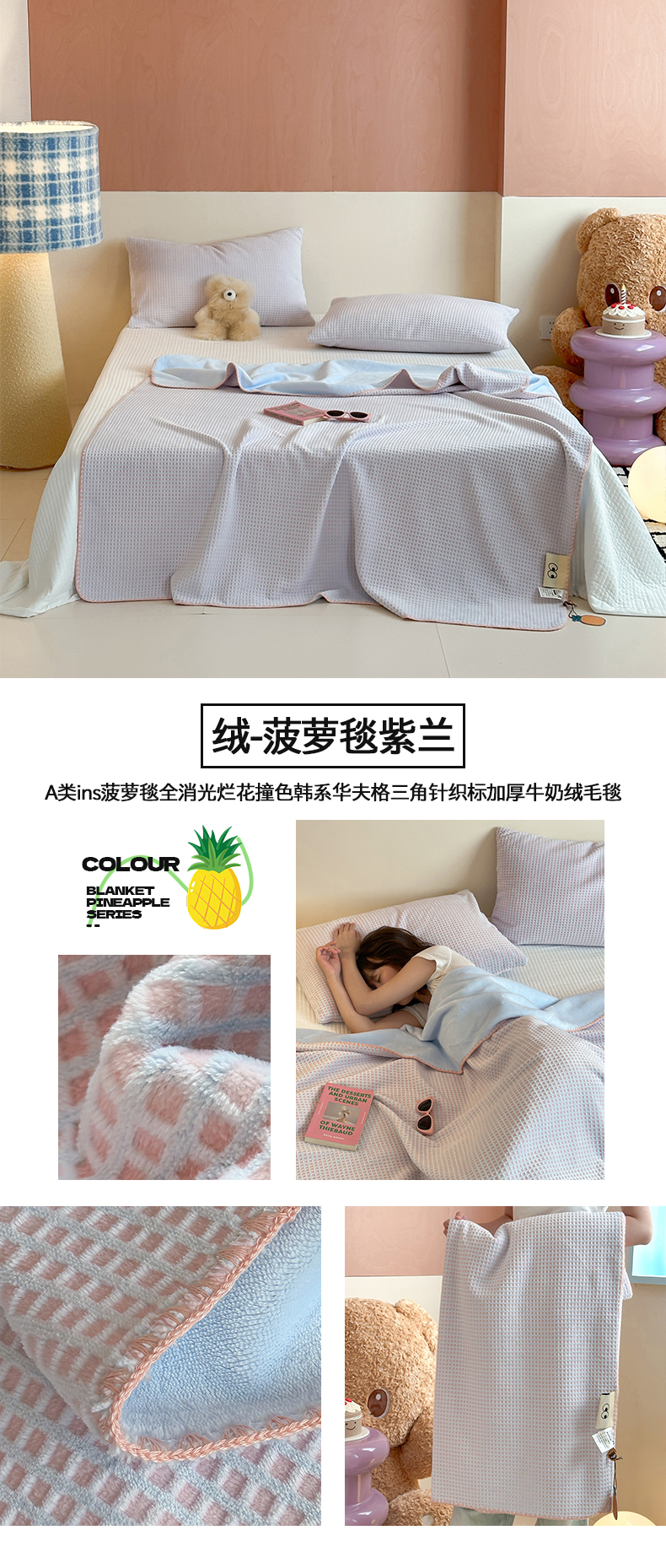 商品名称:桃子家居 2025新款A类ins菠萝毯全消光烂花撞色华夫格三角针工艺加厚牛奶绒毛毯多功能毯 绒-菠萝毯粉蓝