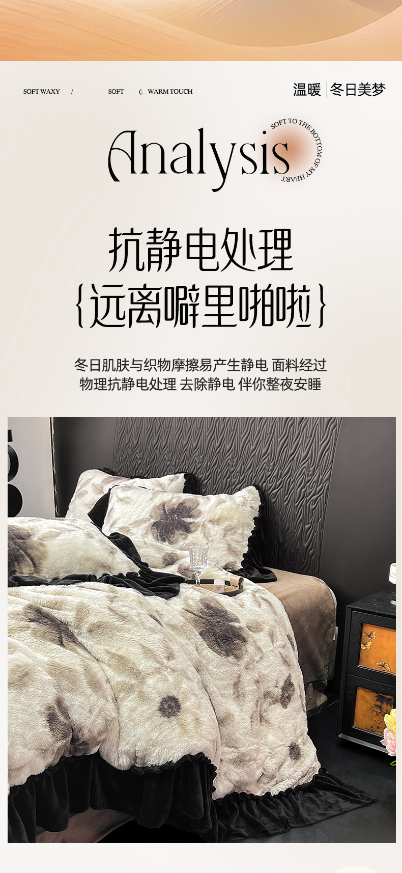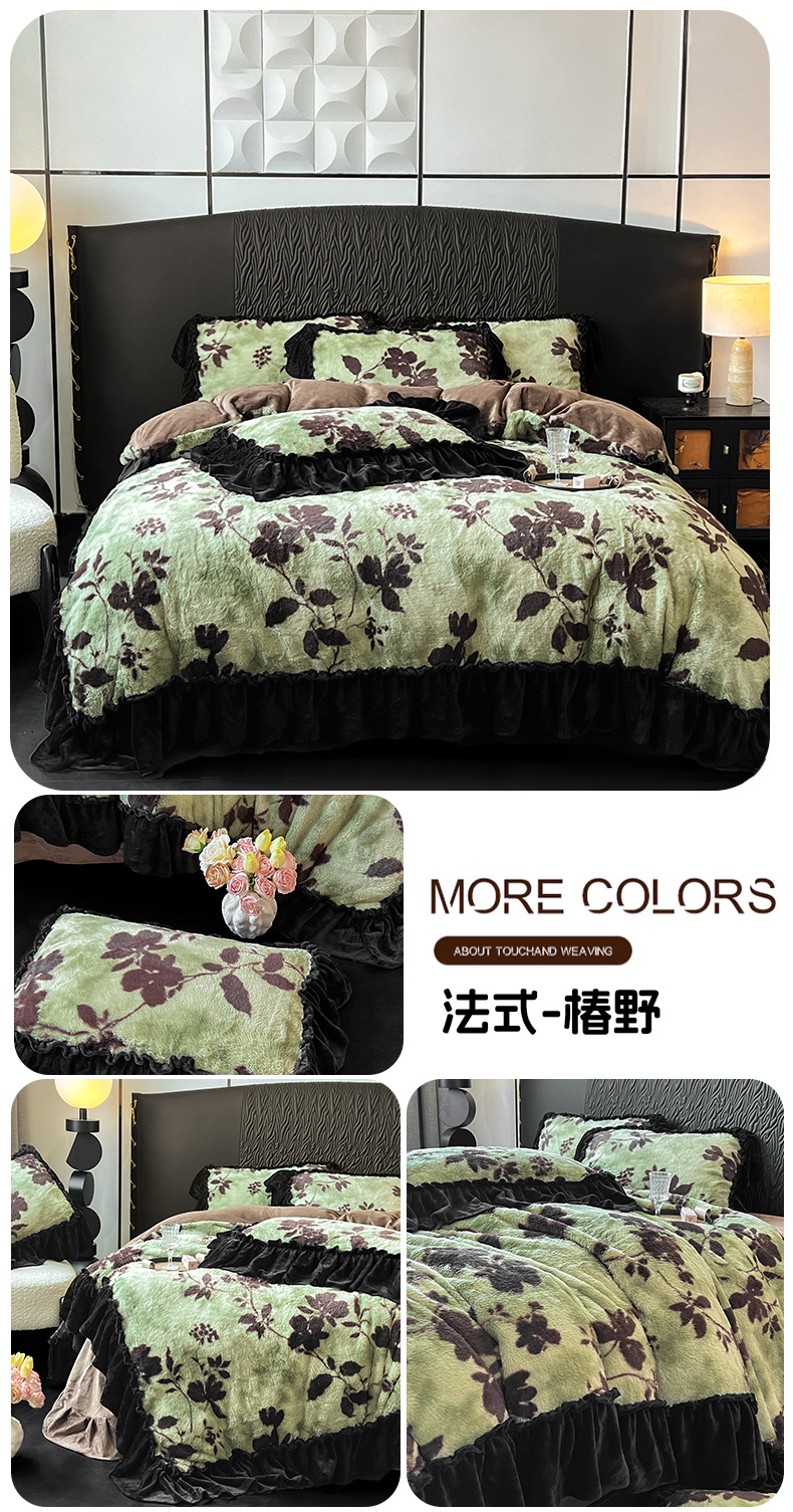 商品名称:创爱家纺 2025新款法式韩版花边兔毛绒印花四件套 法式花边-晚意