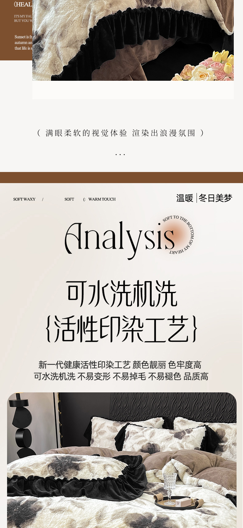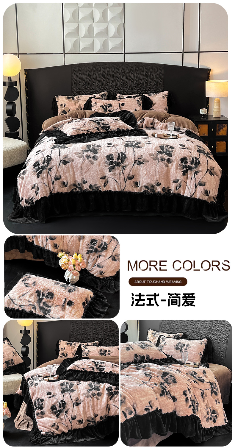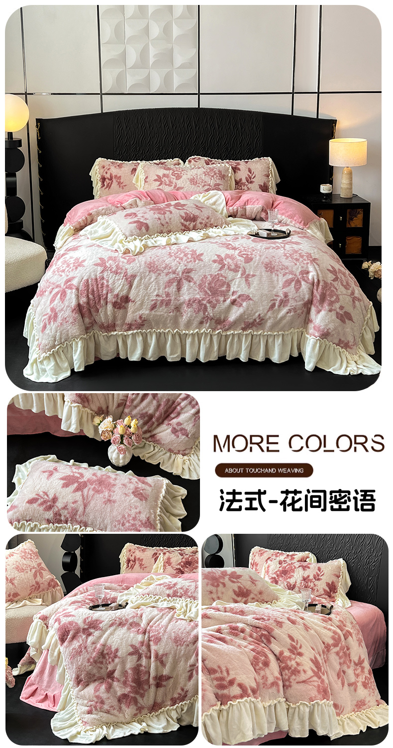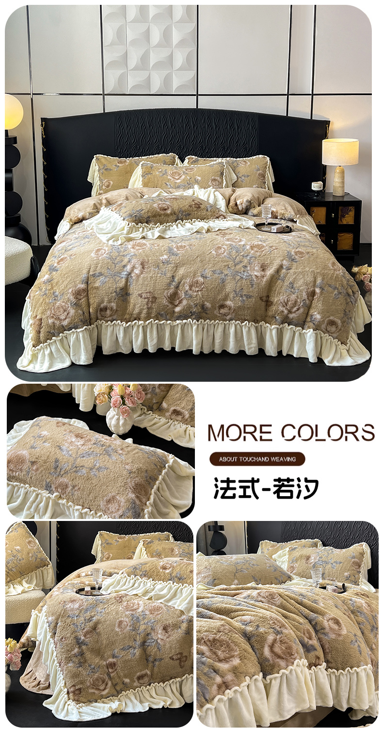 创爱家纺 2025新款法式韩版花边兔毛绒印花四件套 法式花边-晚意
