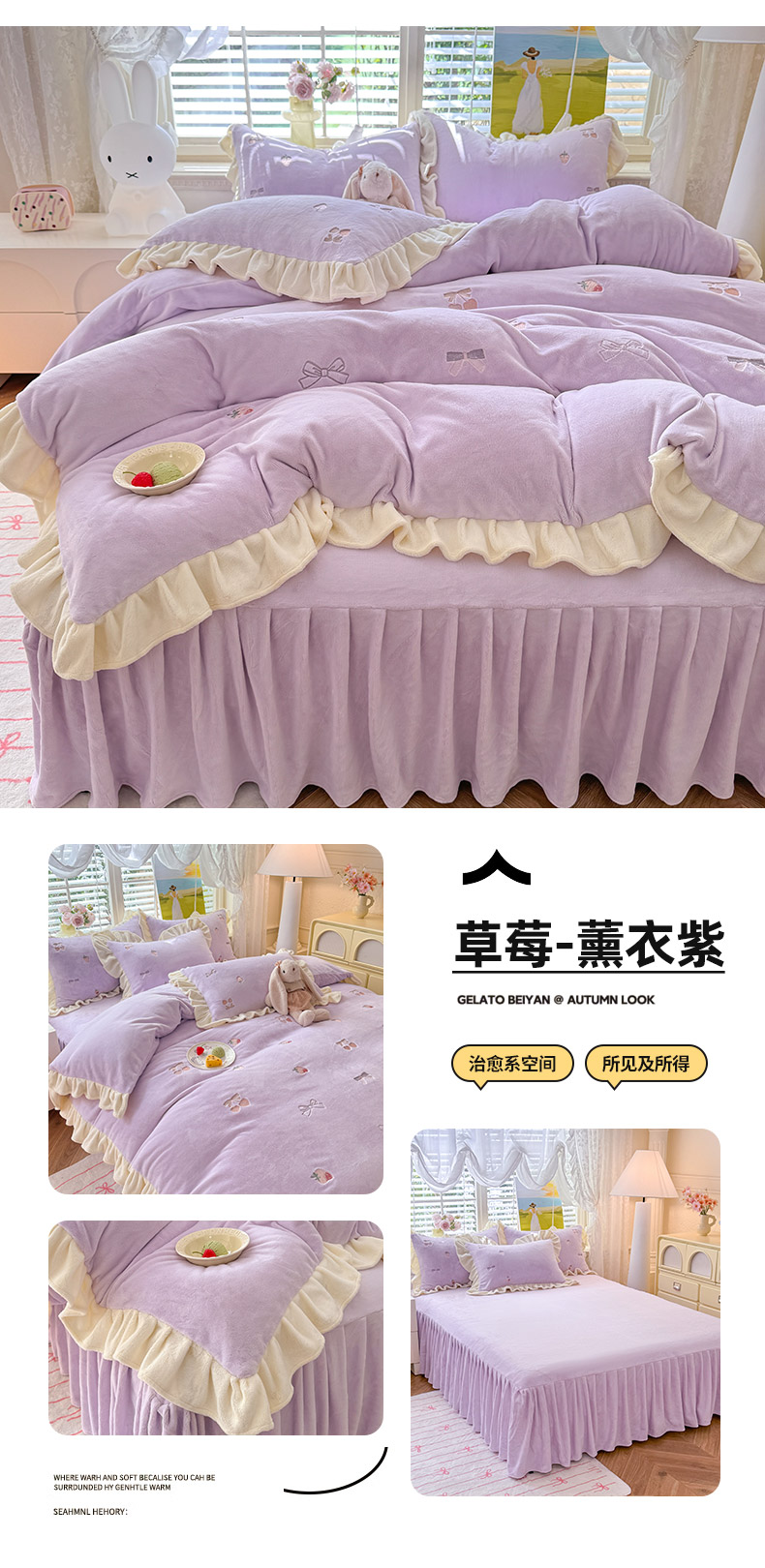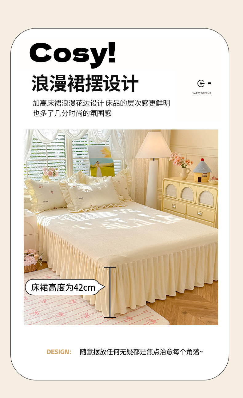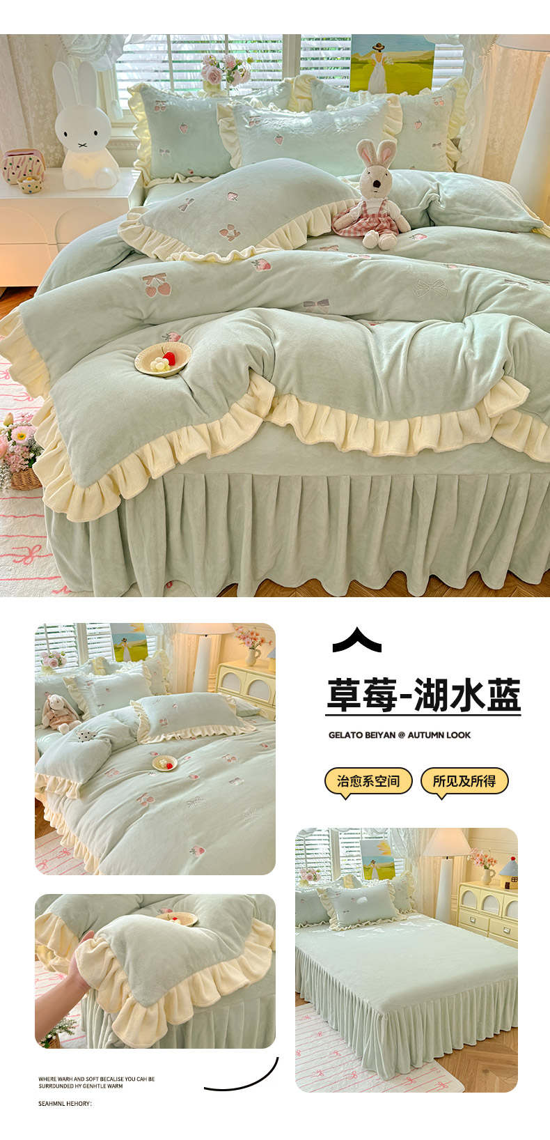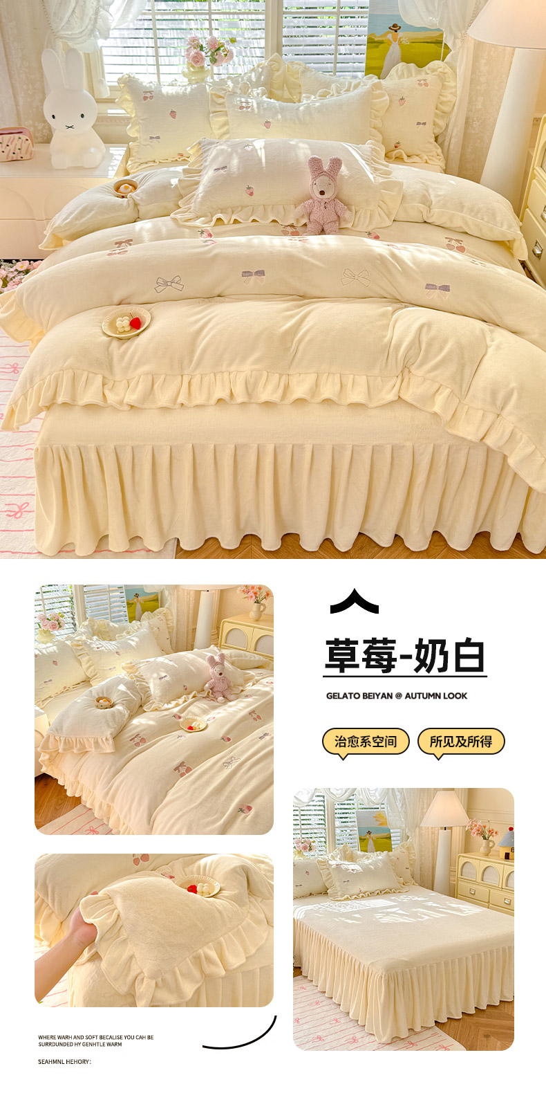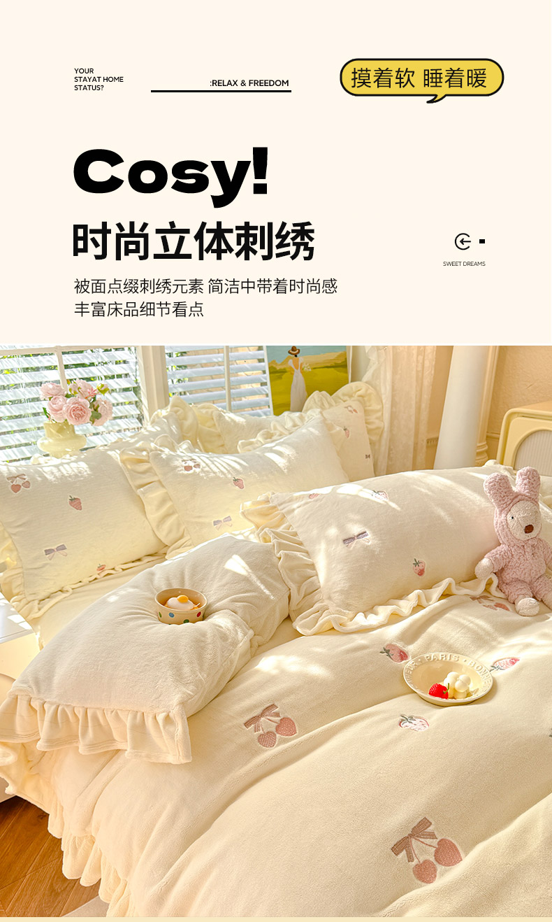 商品名称:绒世界 2025新款加厚牛奶绒刺绣床裙款四件套 草莓-落樱粉