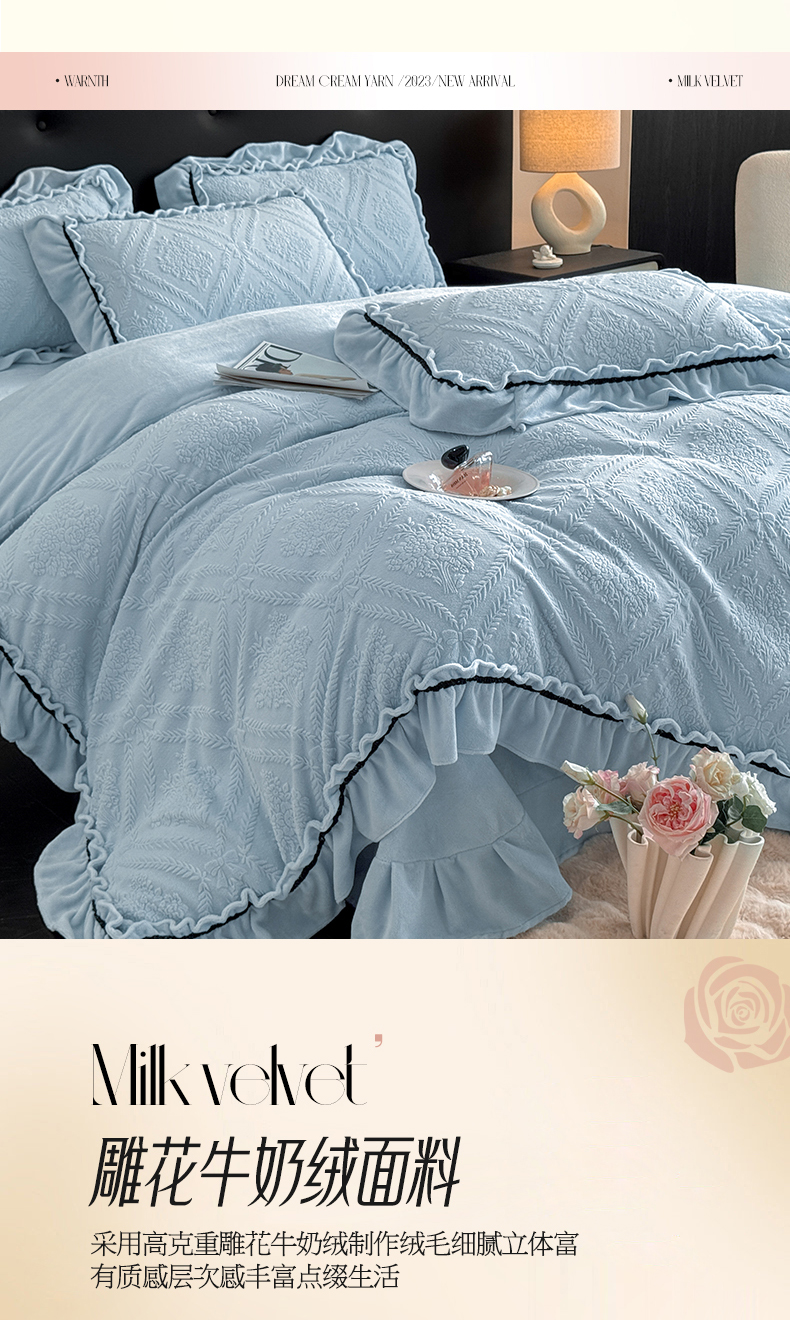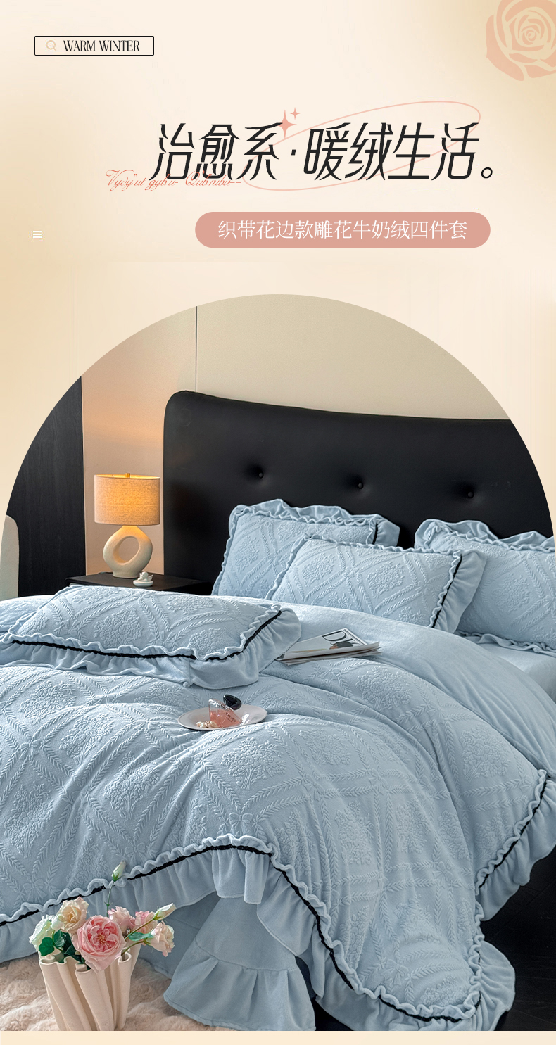 绘萱家居 2025新款新品爆款高密消光织带花边款雕花牛奶绒四件套 眷恋-兰