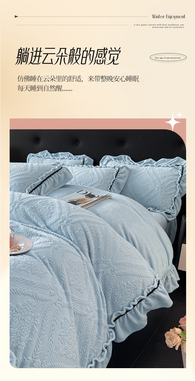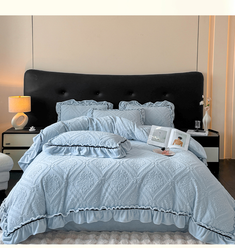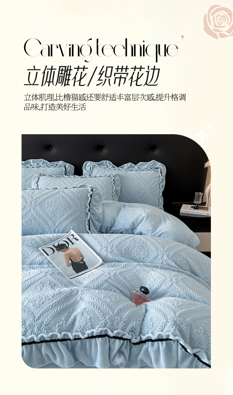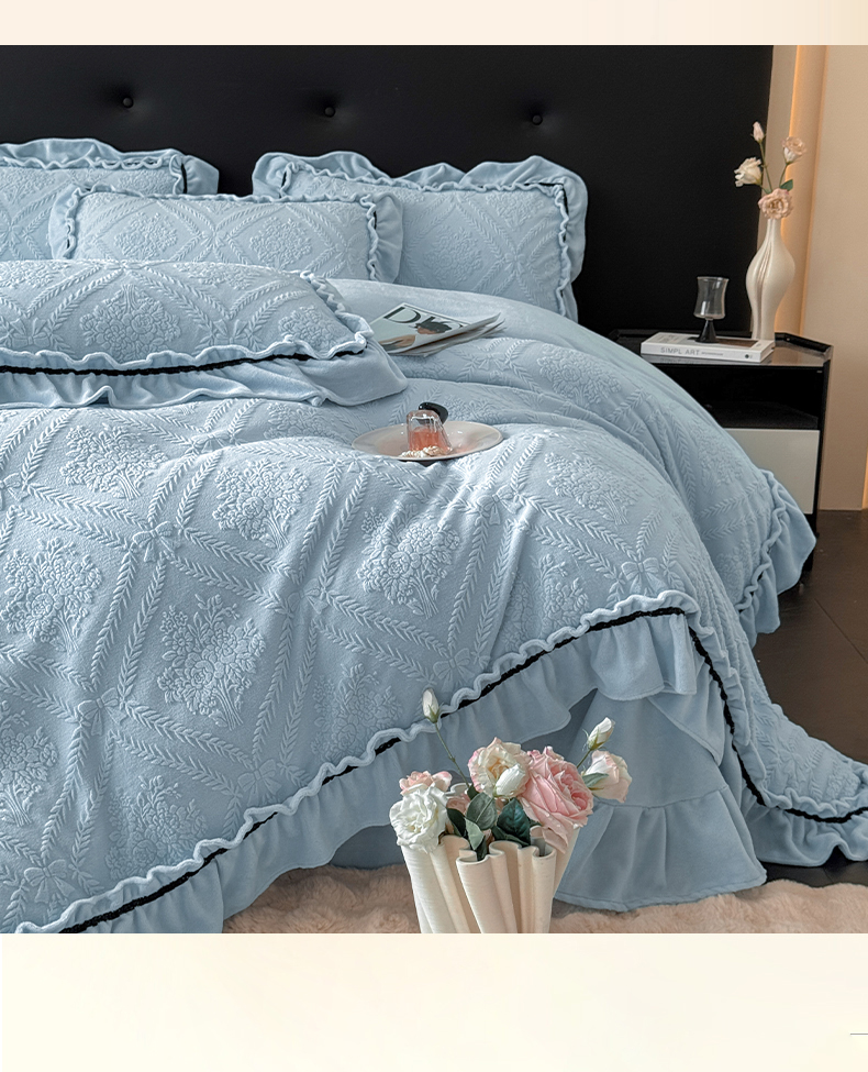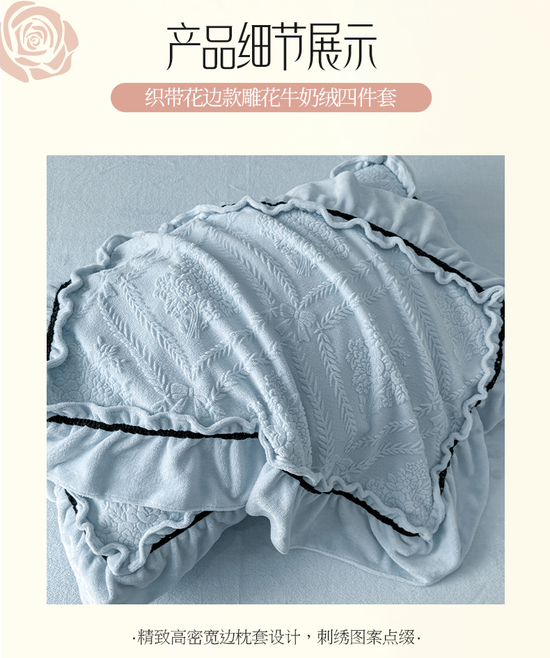 商品名称:绘萱家居 2025新款新品爆款高密消光织带花边款雕花牛奶绒四件套 眷恋-兰