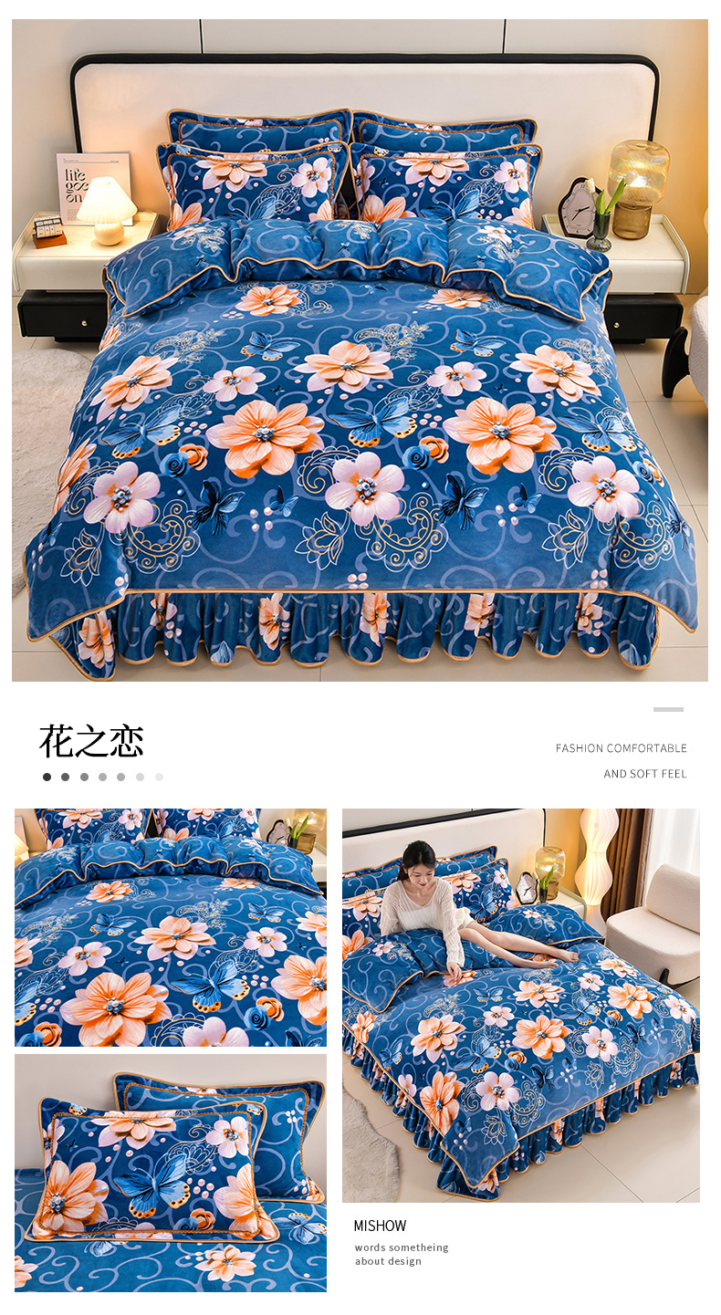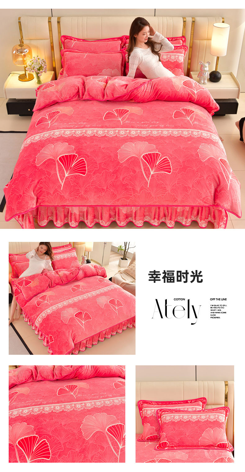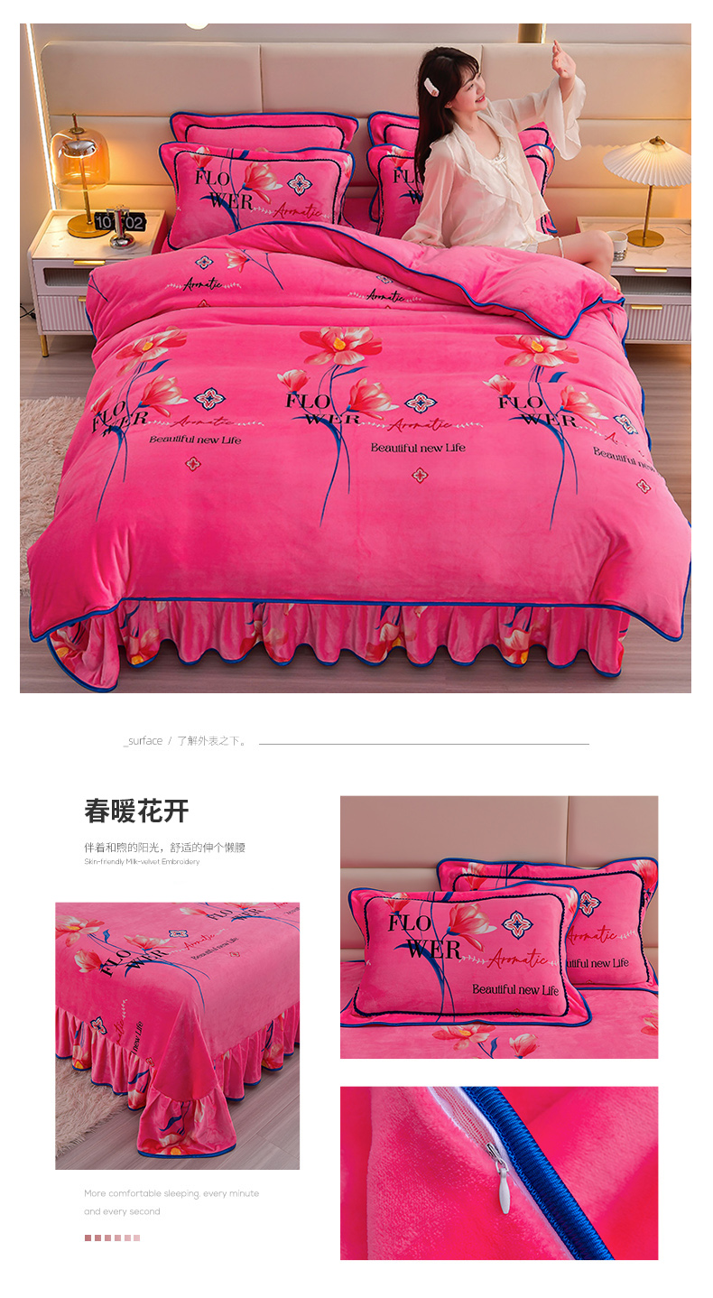 新8.5-9.5斤法莱绒四件套珊瑚牛奶金貂绒四件套床裙 春暖花开