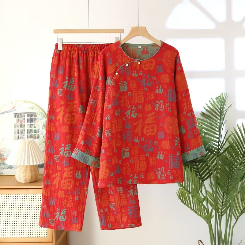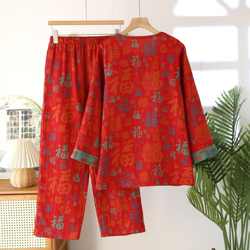 (总)双梦毛巾 2025新款色织复古无领珠扣九分女套红福