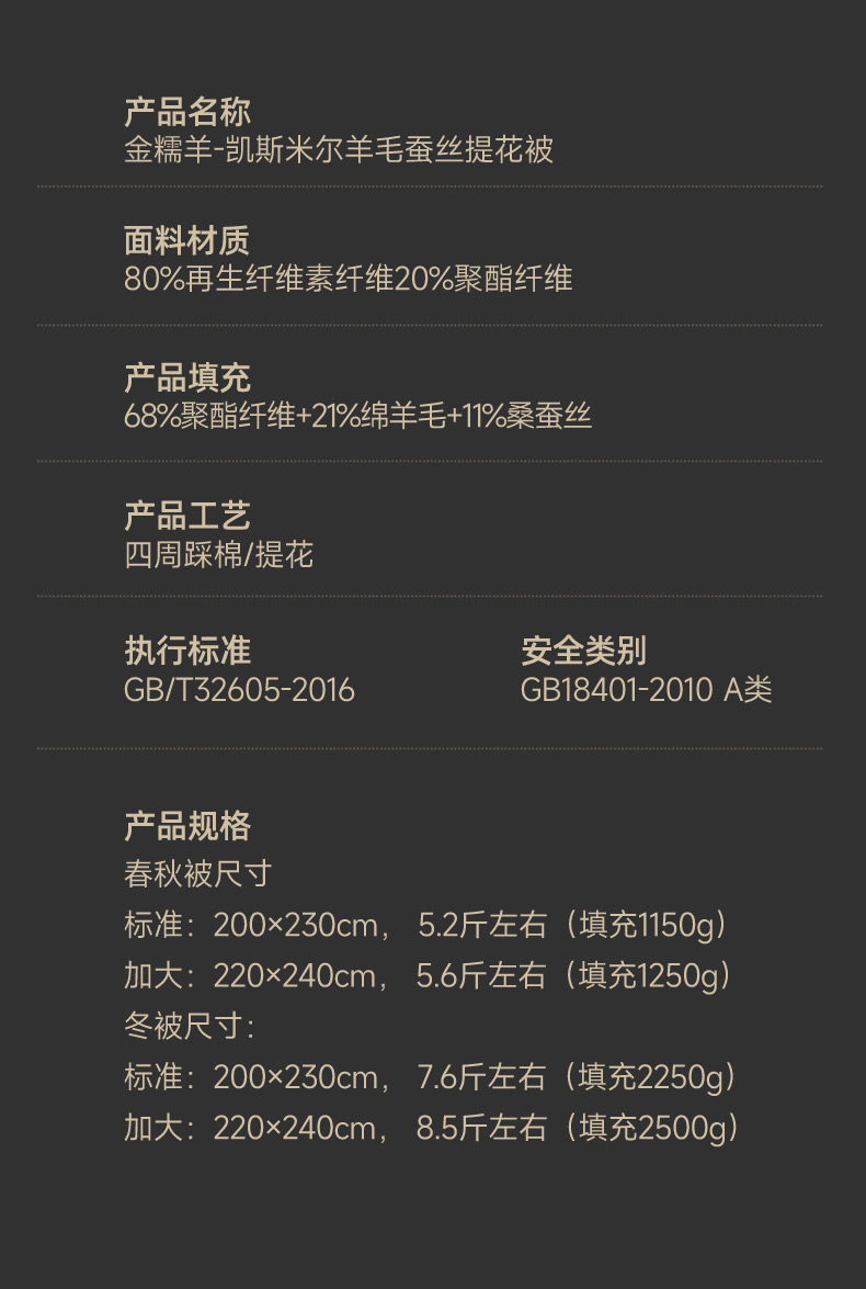 [{"sp_id":11,"sp_name":"\u989c\u8272\u5206\u7c7b","sp_format":2,"sp_list":[{"sp_value_id":1655,"sp_value_name":"\u6d45\u7c73\u767d","sp_value_image":{"id":999,"path":"https:\/\/img3.91jf.com\/ghelp\/2025\/20250910\/20250910095451_139113.jpg"},"sp_value_video":{"id":0,"img":"","path":"","time":0,"download_num":0,"play_num":0},"price":"255.00","storage":2000,"weight":"2.600","is_check_weight":0,"plus_price":"","sp_sort":0}]},{"sp_id":27,"sp_name":"\u5c3a\u5bf8","sp_format":1,"sp_list":[{"sp_value_id":302,"sp_value_name":"200*230cm\u6625\u79cb\u88ab-5.2\u65a4\u5de6\u53f3","sp_value_image":{"id":0,"path":""},"sp_value_video":{"id":0,"img":"","path":"","time":0,"download_num":0,"play_num":0},"price":"255.00","storage":500,"weight":"2.600","is_check_weight":0,"plus_price":"","sp_sort":5},{"sp_value_id":303,"sp_value_name":"220*240cm\u6625\u79cb\u88ab-5.6\u65a4\u5de6\u53f3","sp_value_image":{"id":0,"path":""},"sp_value_video":{"id":0,"img":"","path":"","time":0,"download_num":0,"play_num":0},"price":"275.00","storage":500,"weight":"2.800","is_check_weight":0,"plus_price":"","sp_sort":6},{"sp_value_id":304,"sp_value_name":"200*230cm\u51ac\u88ab-7.6\u65a4\u5de6\u53f3","sp_value_image":{"id":0,"path":""},"sp_value_video":{"id":0,"img":"","path":"","time":0,"download_num":0,"play_num":0},"price":"305.00","storage":500,"weight":"3.800","is_check_weight":0,"plus_price":"","sp_sort":7},{"sp_value_id":305,"sp_value_name":"220*240cm\u51ac\u88ab-8.5\u65a4\u5de6\u53f3","sp_value_image":{"id":0,"path":""},"sp_value_video":{"id":0,"img":"","path":"","time":0,"download_num":0,"play_num":0},"price":"325.00","storage":500,"weight":"4.250","is_check_weight":0,"plus_price":"","sp_sort":8}]}]