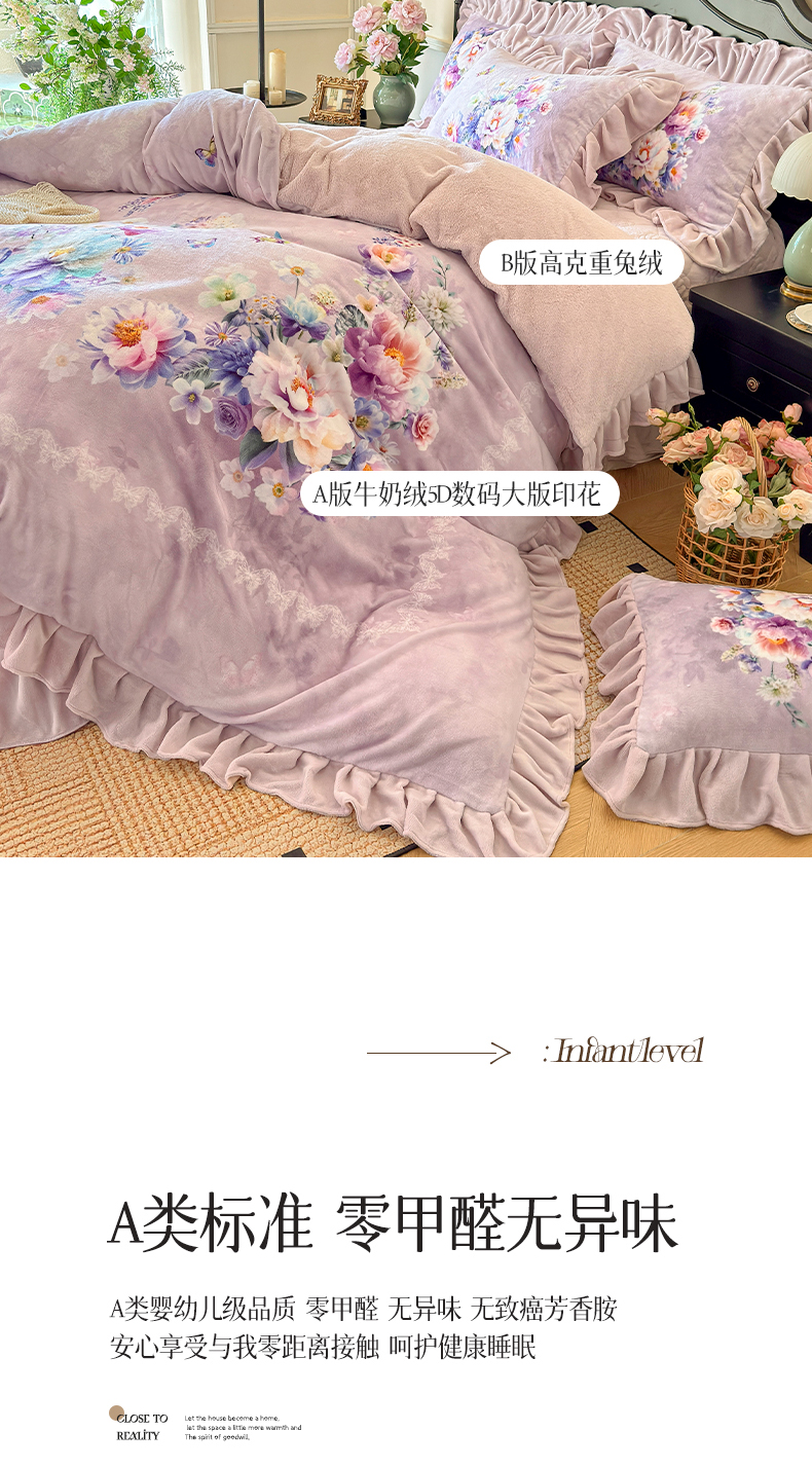 商品名称:宜凡家纺 2025新款牛奶绒5D数码大板印花床盖四件套 浪漫花舞 紫