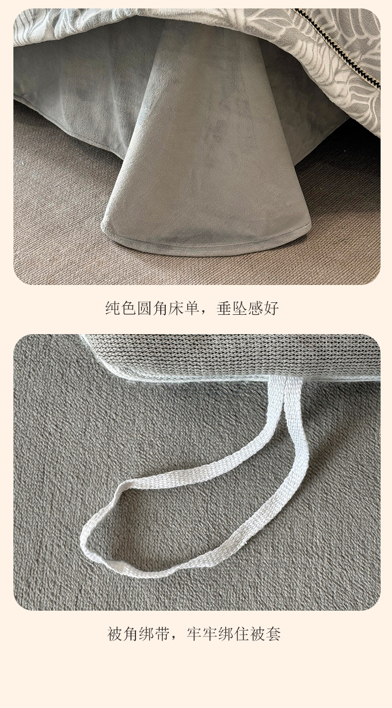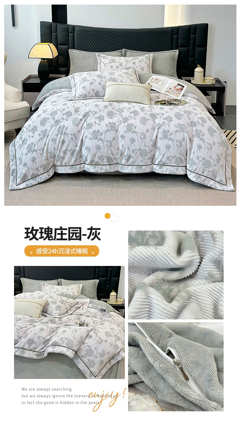 商品名称:好阁家纺 2025新款轻奢织带雕花牛奶绒四件套 玫瑰庄园-灰