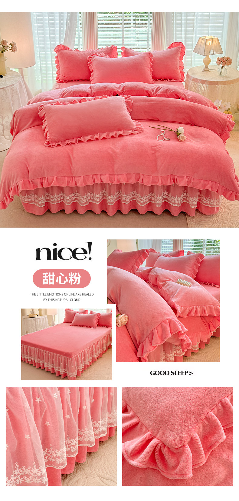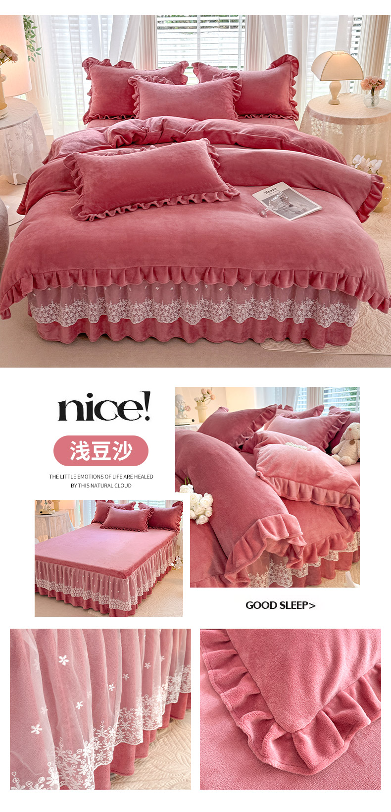 当前位置: 91家纺网 > 商品网购 > 床品套件 > 四件套 > 牛奶绒四件套 > 优家居 2025秋冬高克重牛奶绒床裙款四件套纯色蕾丝边花边刺绣法式公主风床裙款被套 清新绿