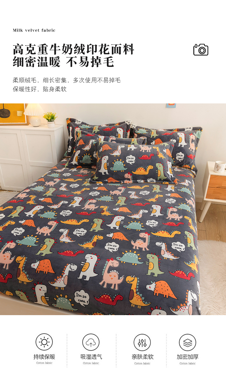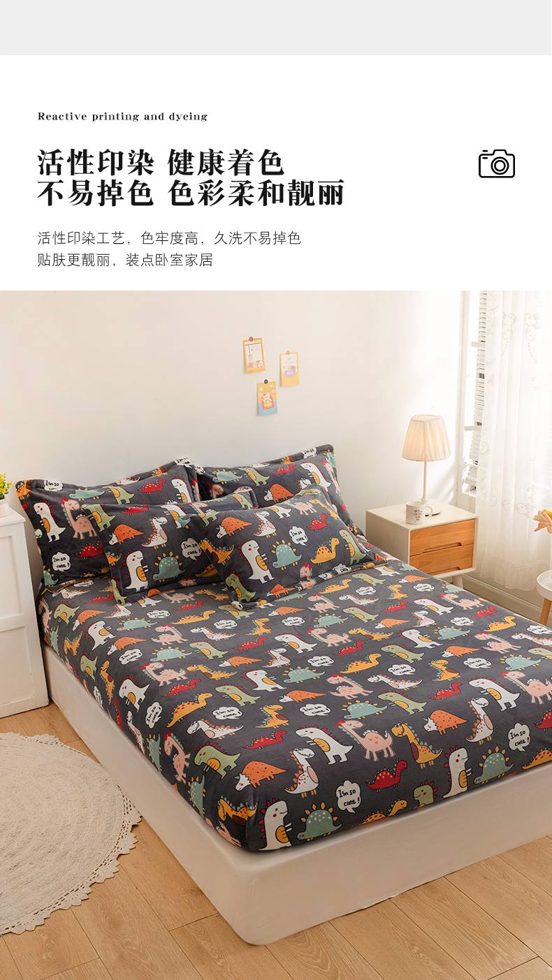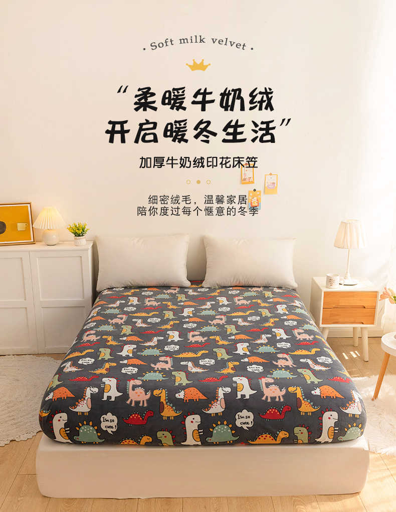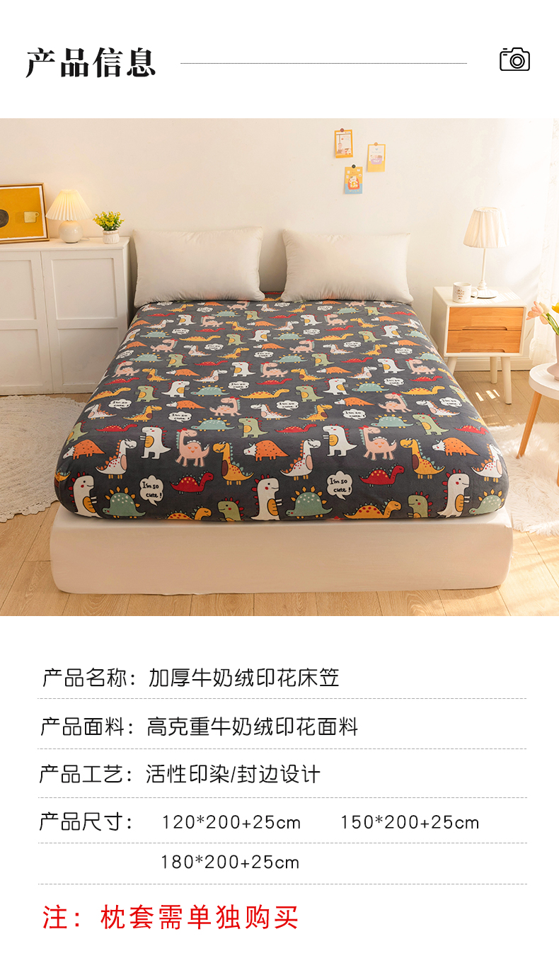 商品名称:金盛纺 2025新款高克重牛奶绒印花系列单床笠(可定制) 恐龙王国