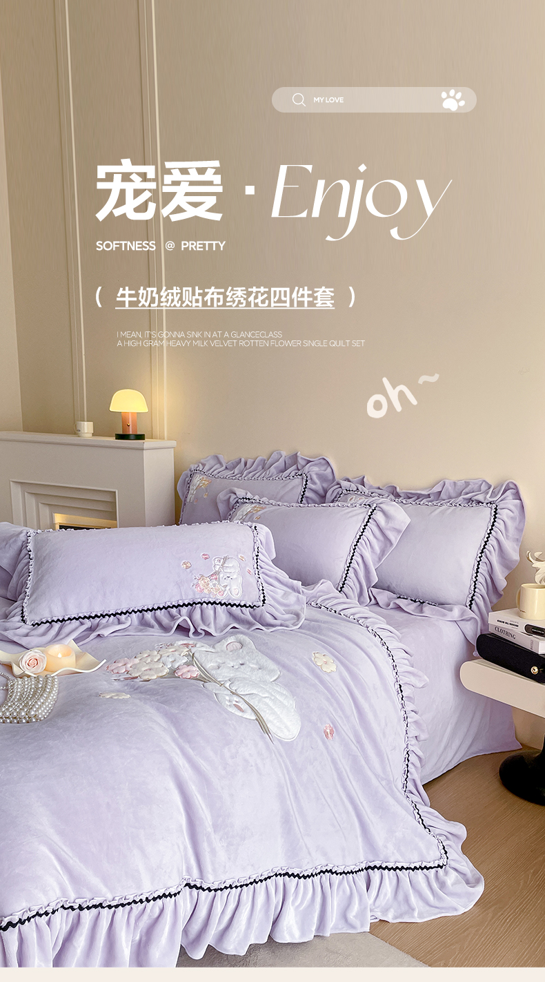 畅畅家纺 2025新款轻奢高档冬季工艺款牛奶绒毛巾绣床单床笠四件套 梦境-浅紫