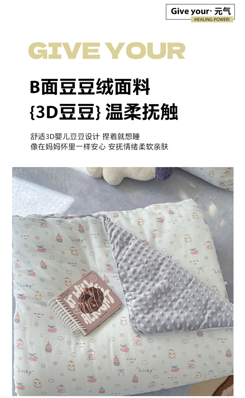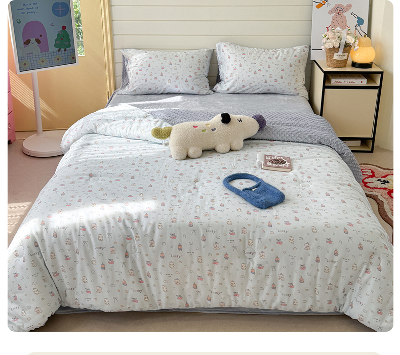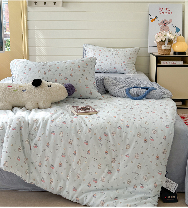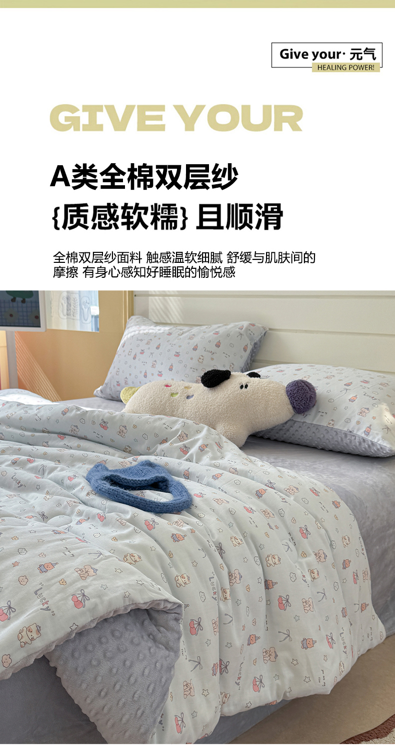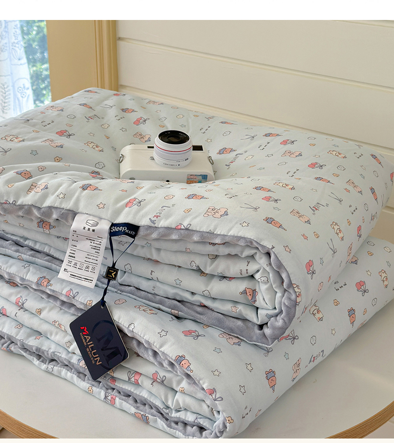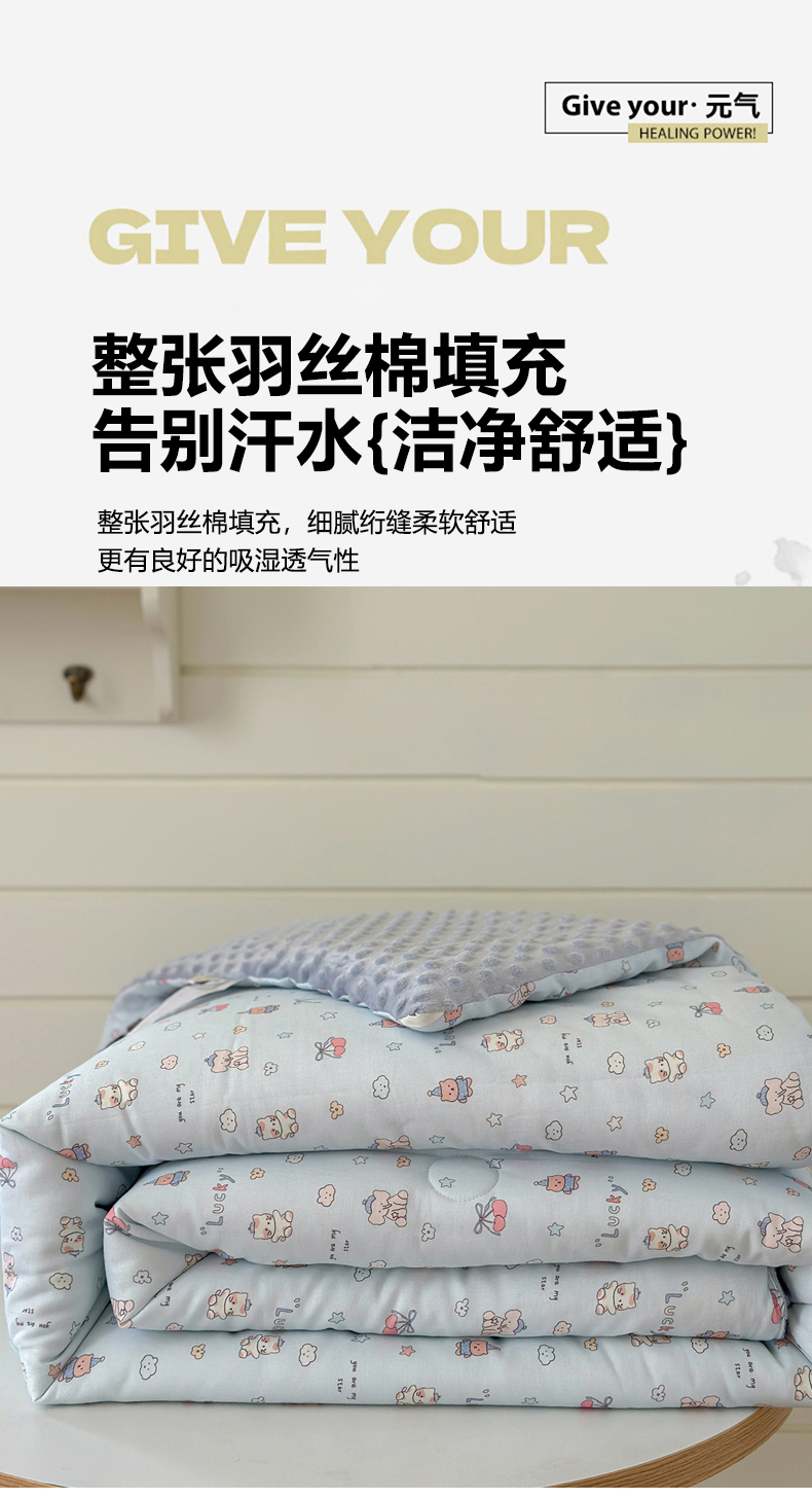 • 91家纺网 家纺一手货源 找家纺 麦伦家居 2025新款全棉双层纱3D豆豆被系列被子被芯(可配四件套) 皮皮象蓝