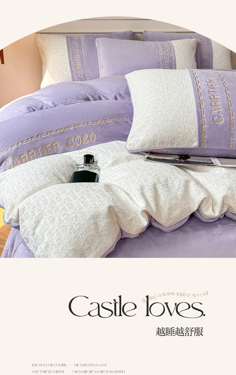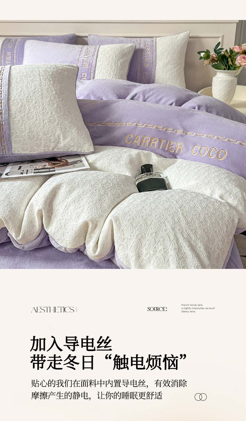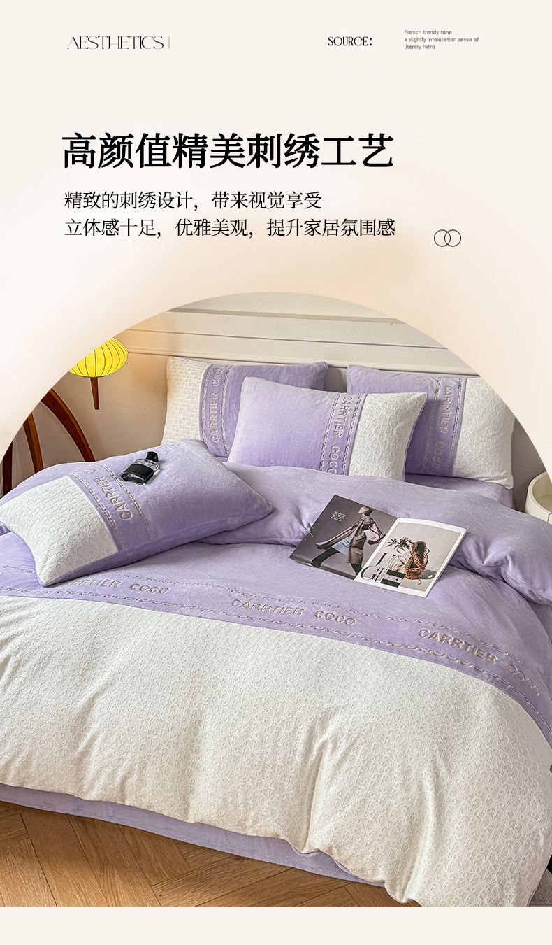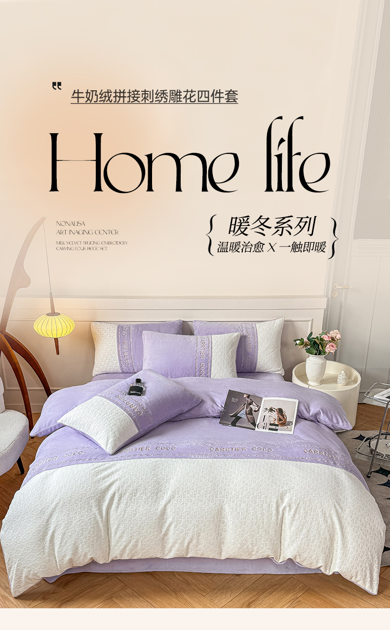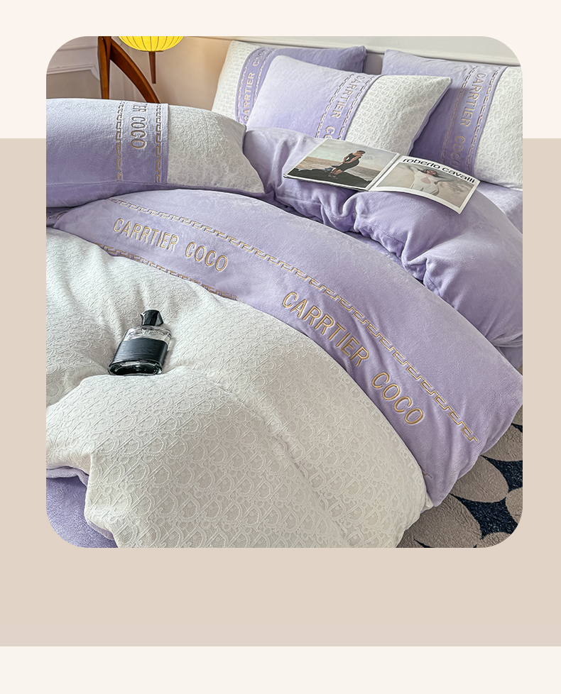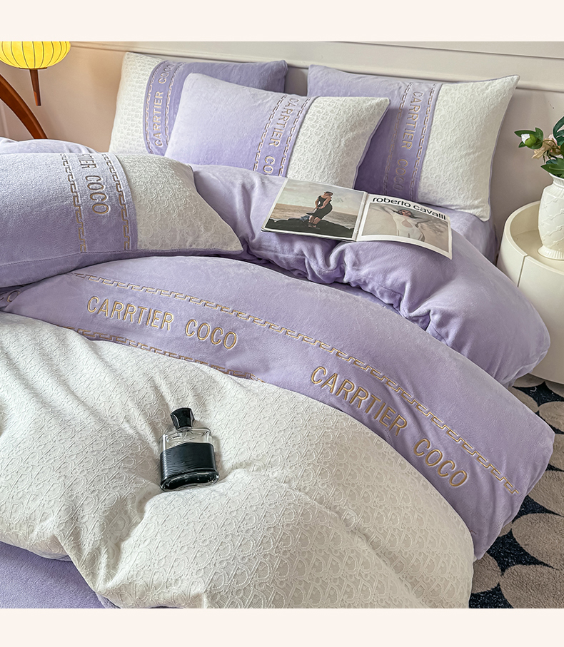 当前位置: 91家纺网 > 商品网购 > 床品套件 > 四件套 > 牛奶绒四件套 > 灰鲸 2025新款牛奶绒拼接刺绣雕花套件-露娜 露娜-风铃紫