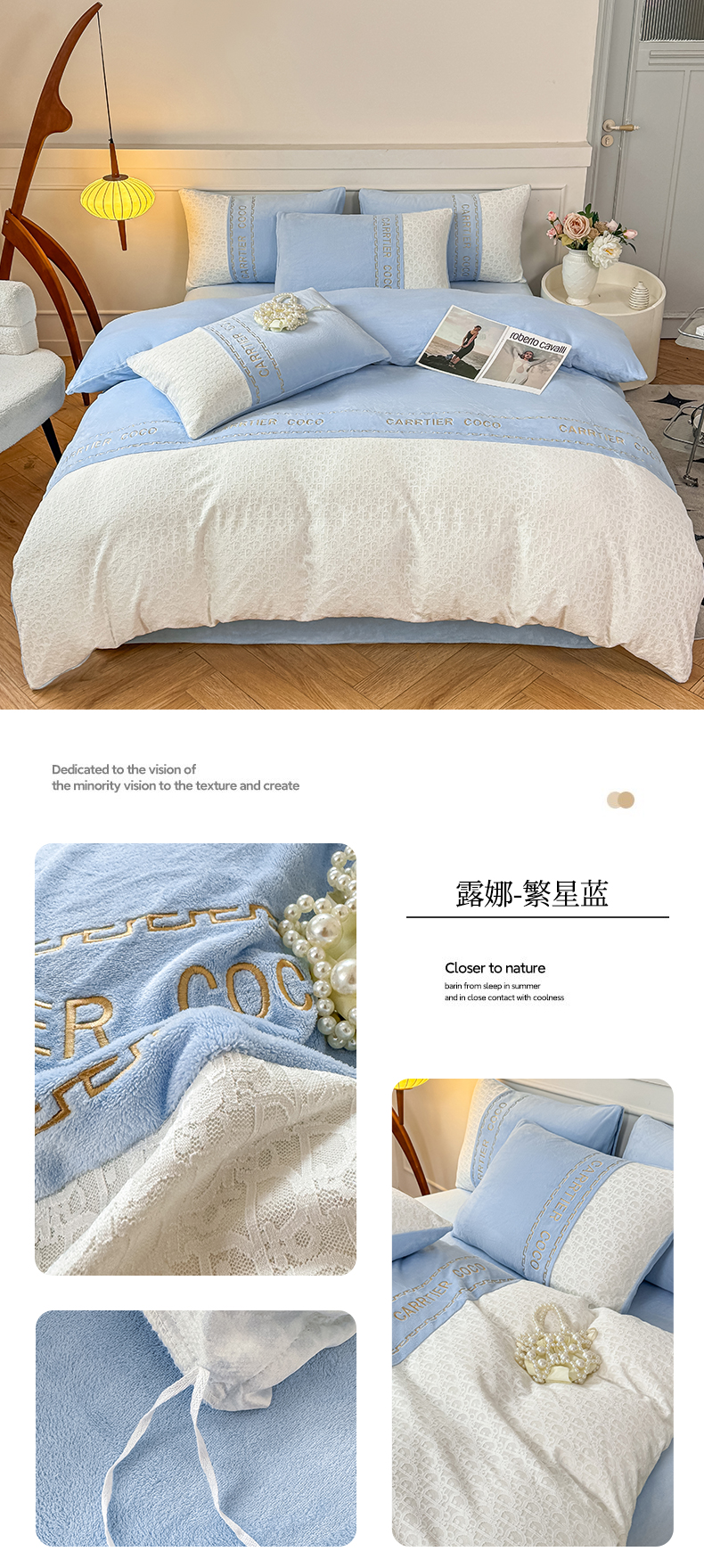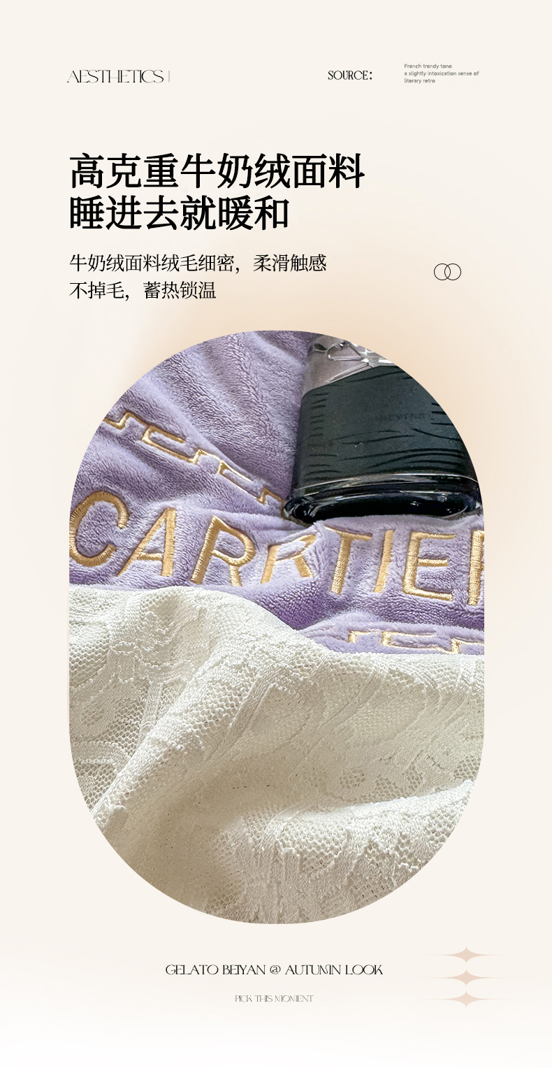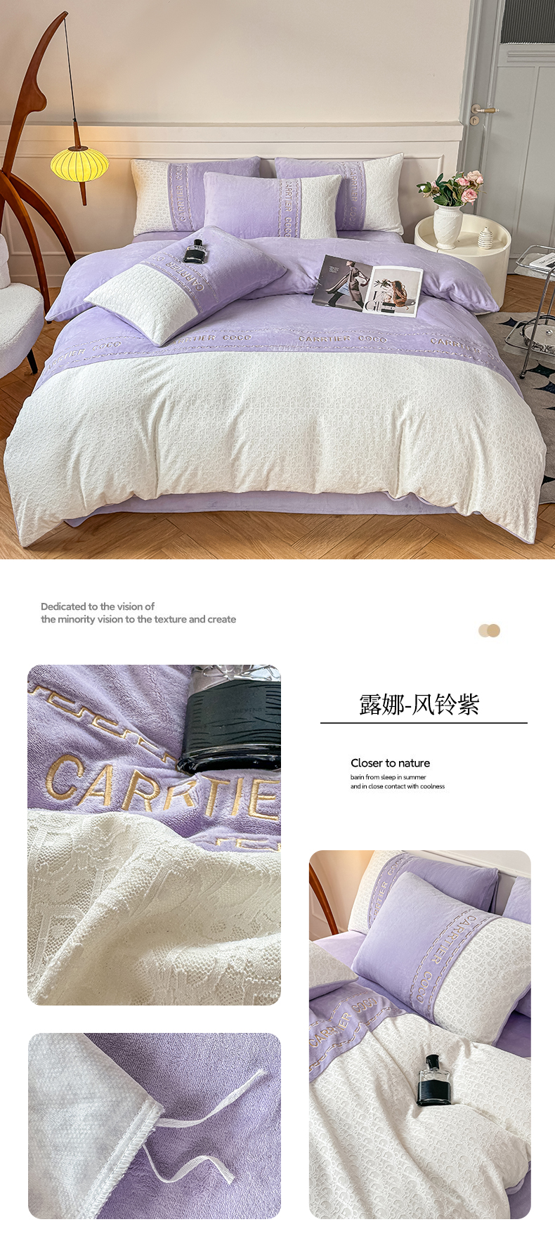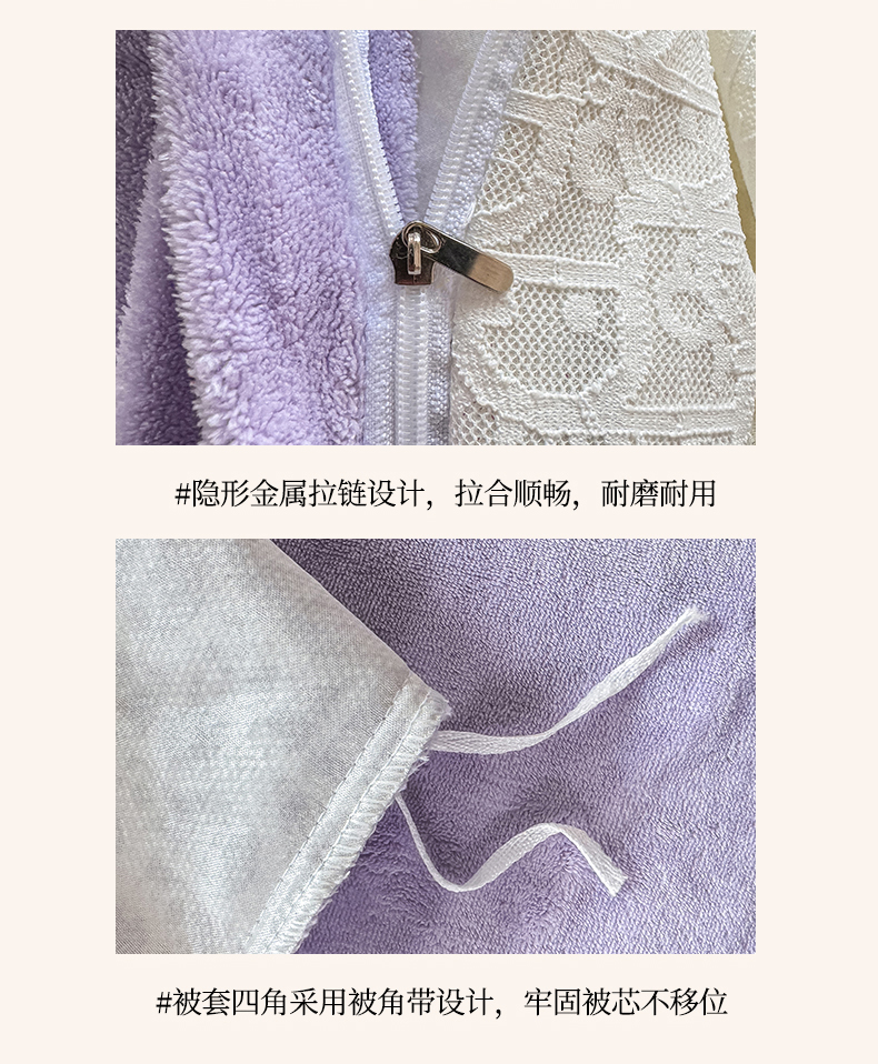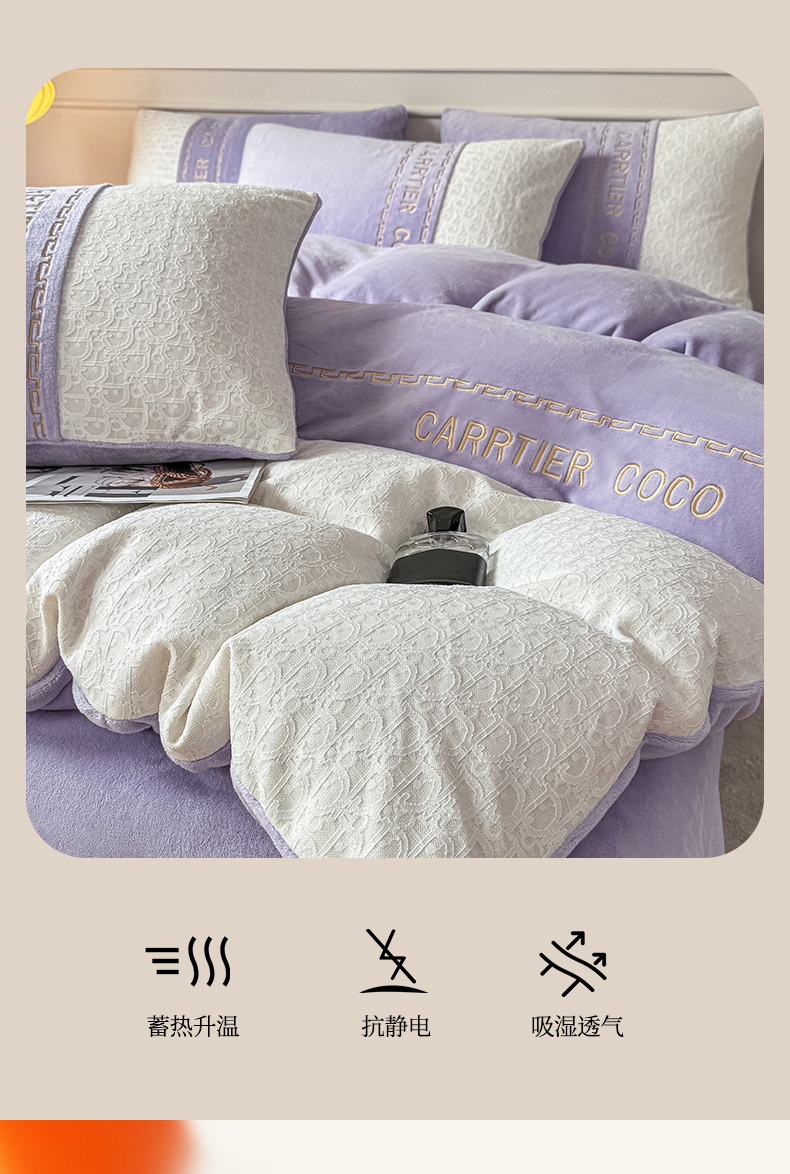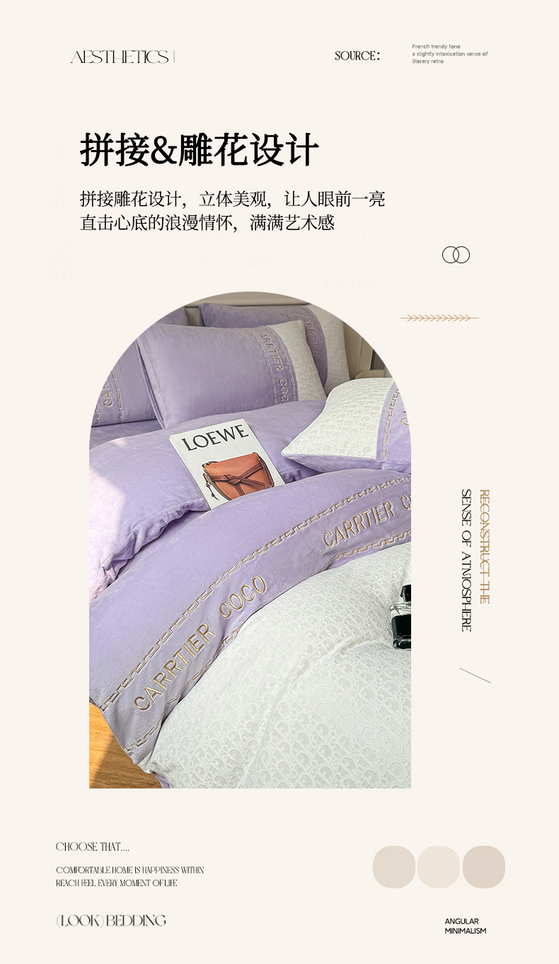 当前位置: 91家纺网 > 商品网购 > 床品套件 > 四件套 > 牛奶绒四件套 > 灰鲸 2025新款牛奶绒拼接刺绣雕花套件-露娜 露娜-风铃紫