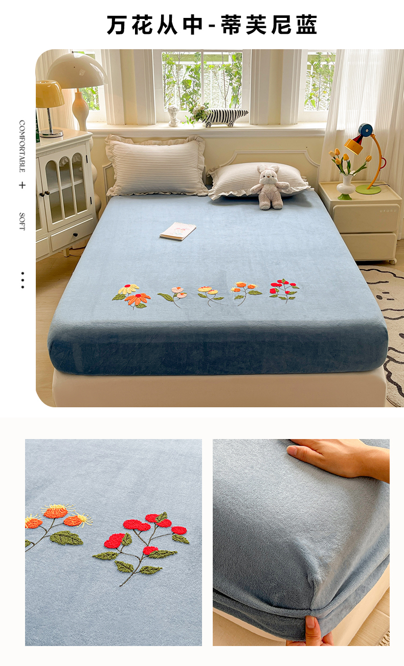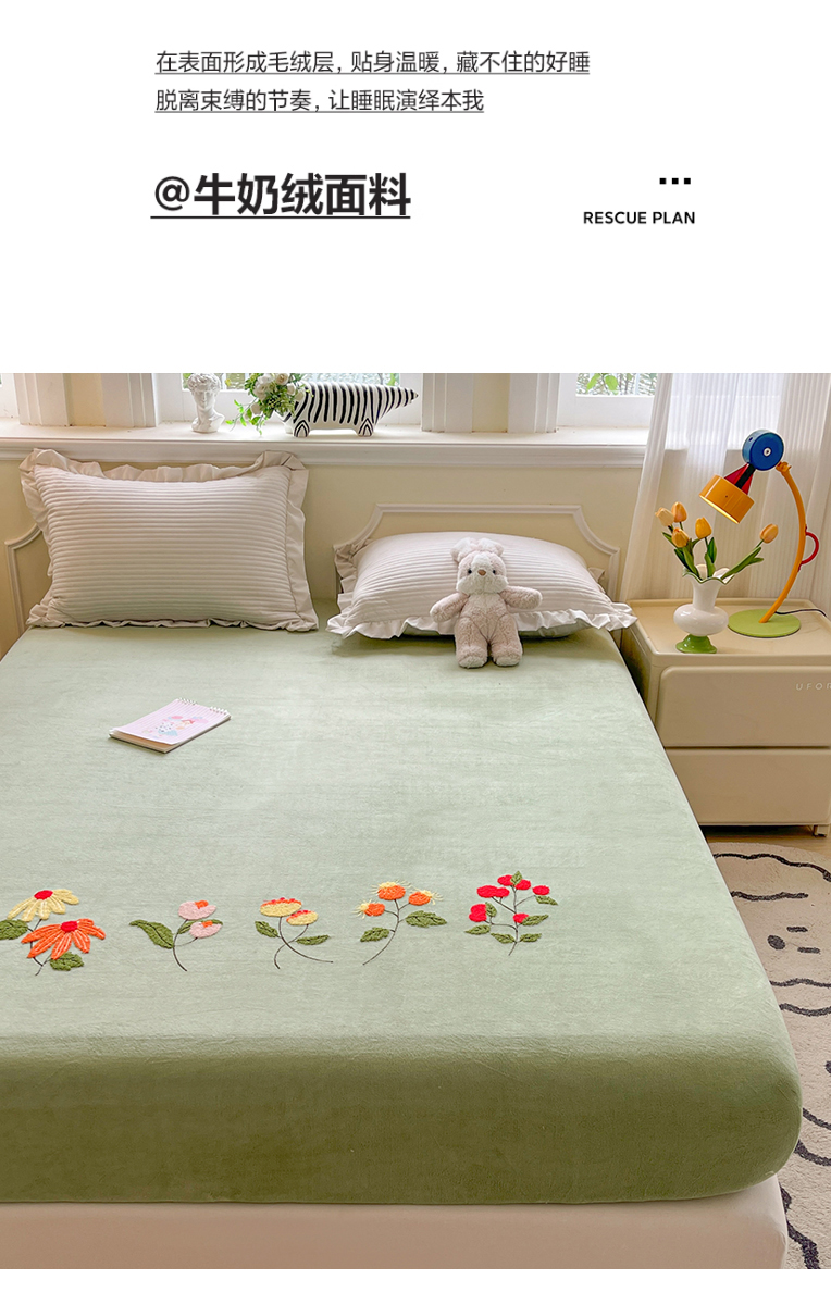 子钦家纺 2025秋冬新款加厚牛奶绒毛巾绣床笠 万花丛中-豆绿