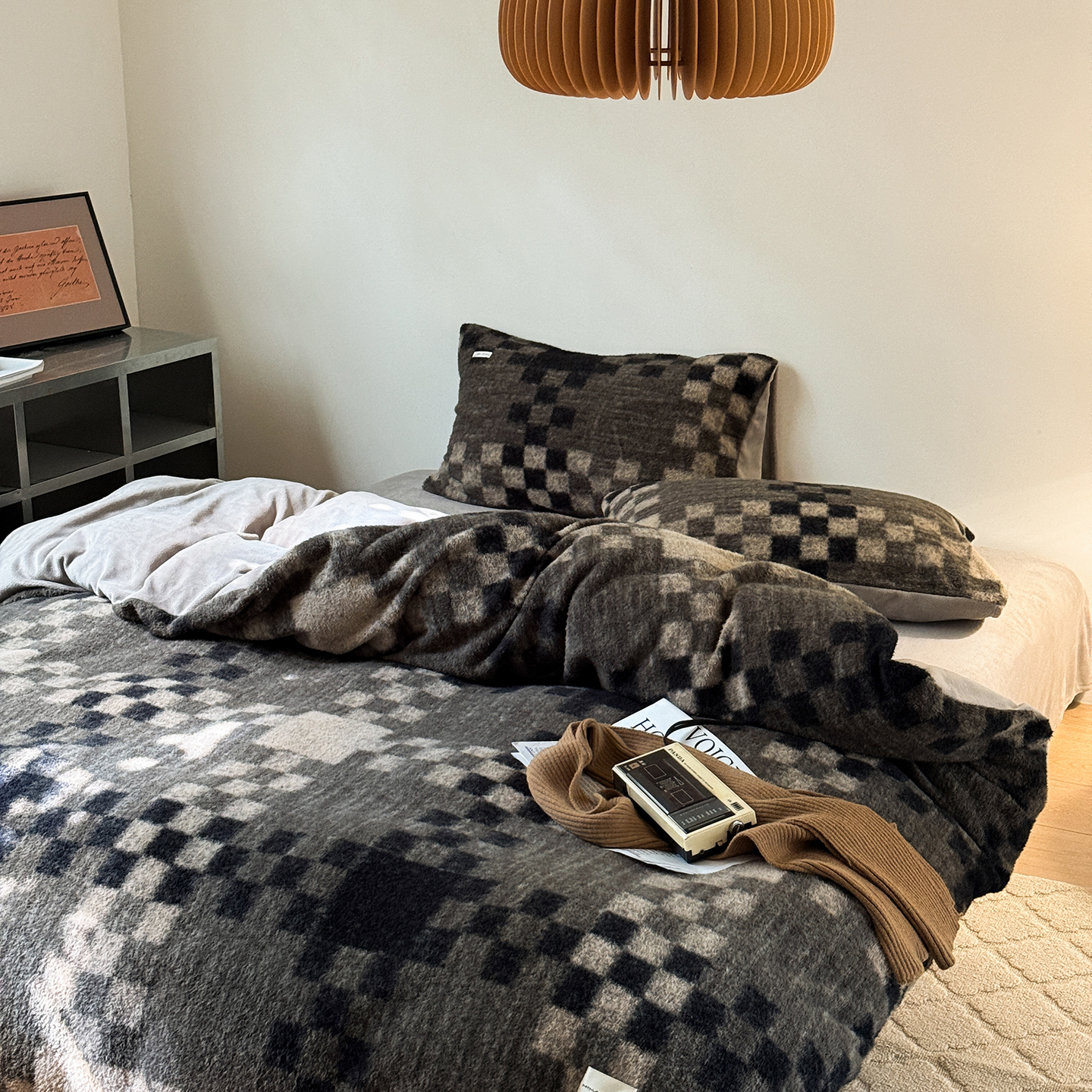 (总)小春日和 2025新款纯棉棉麻民宿中性风四件套高端全棉人字纹条纹被套加大纯色床单1.8床笠男士四件套,木笙-黑,木笙-米