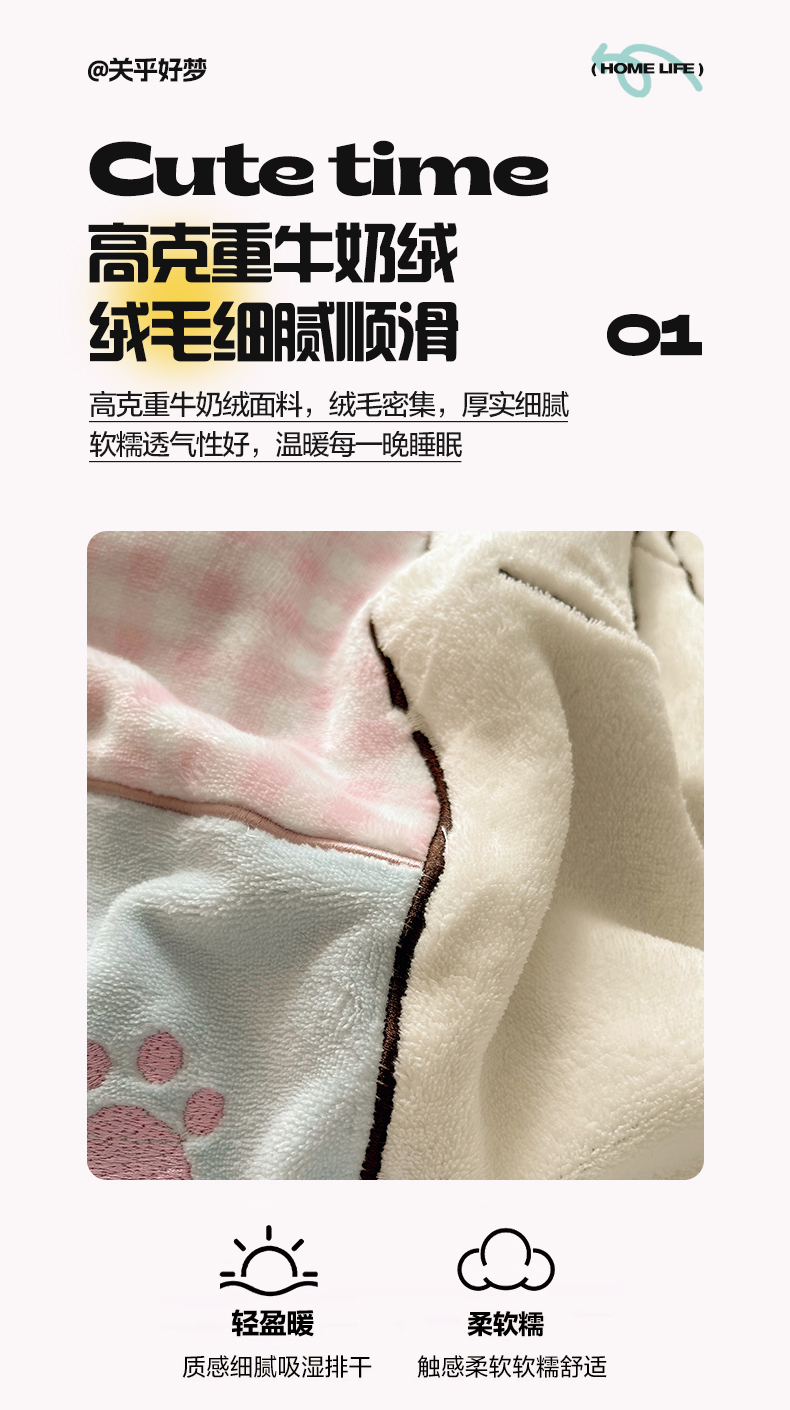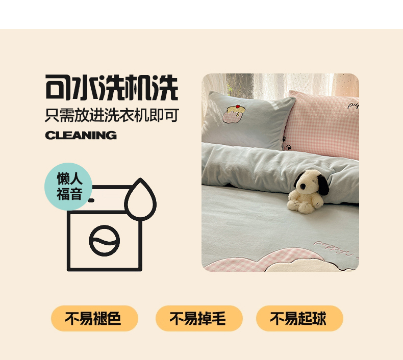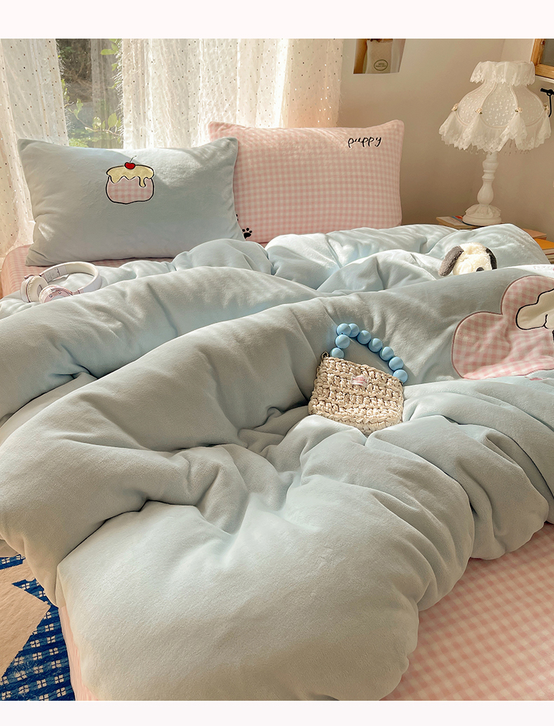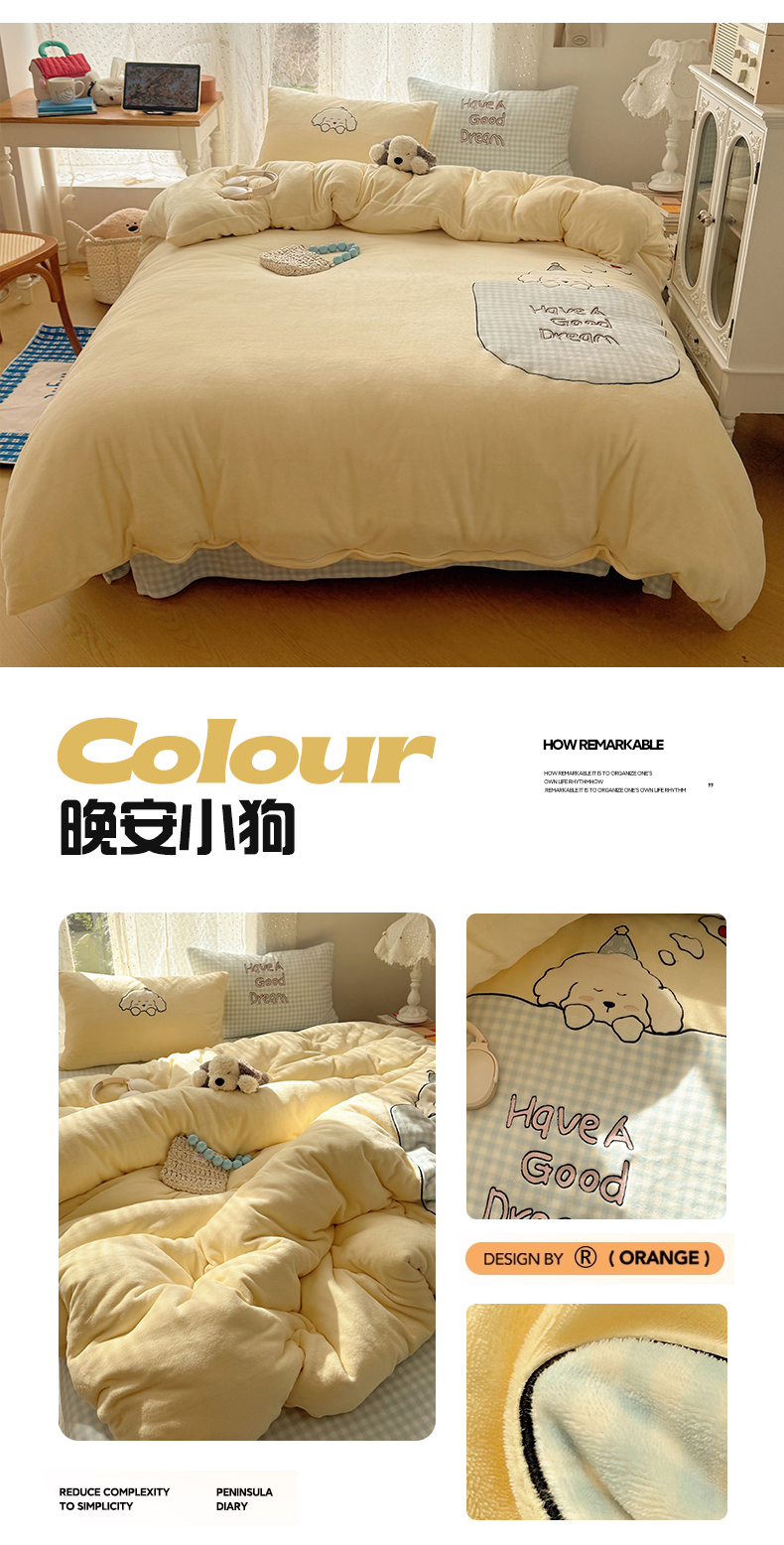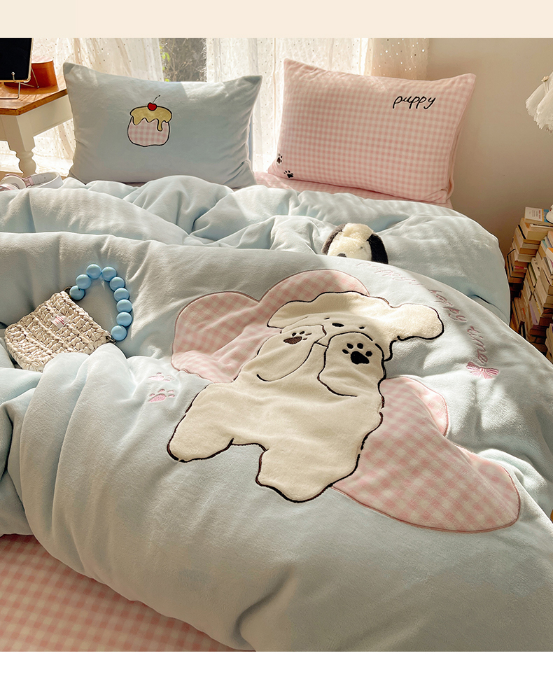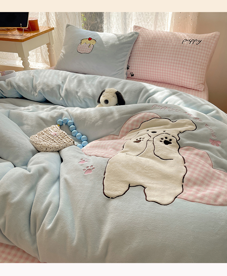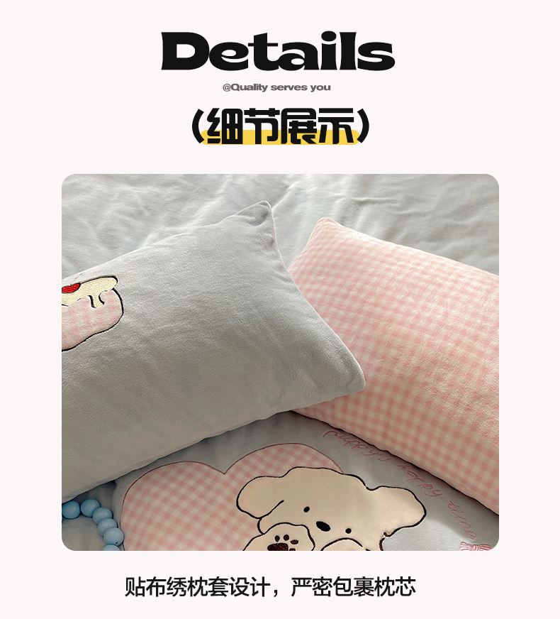 (总)轻奢坊 2025新款牛奶绒ins可爱贴布绣四件套,爱心乖狗,洛丽塔猫,苹果黑猫,晚安小狗,笑脸红格,笑脸咖格