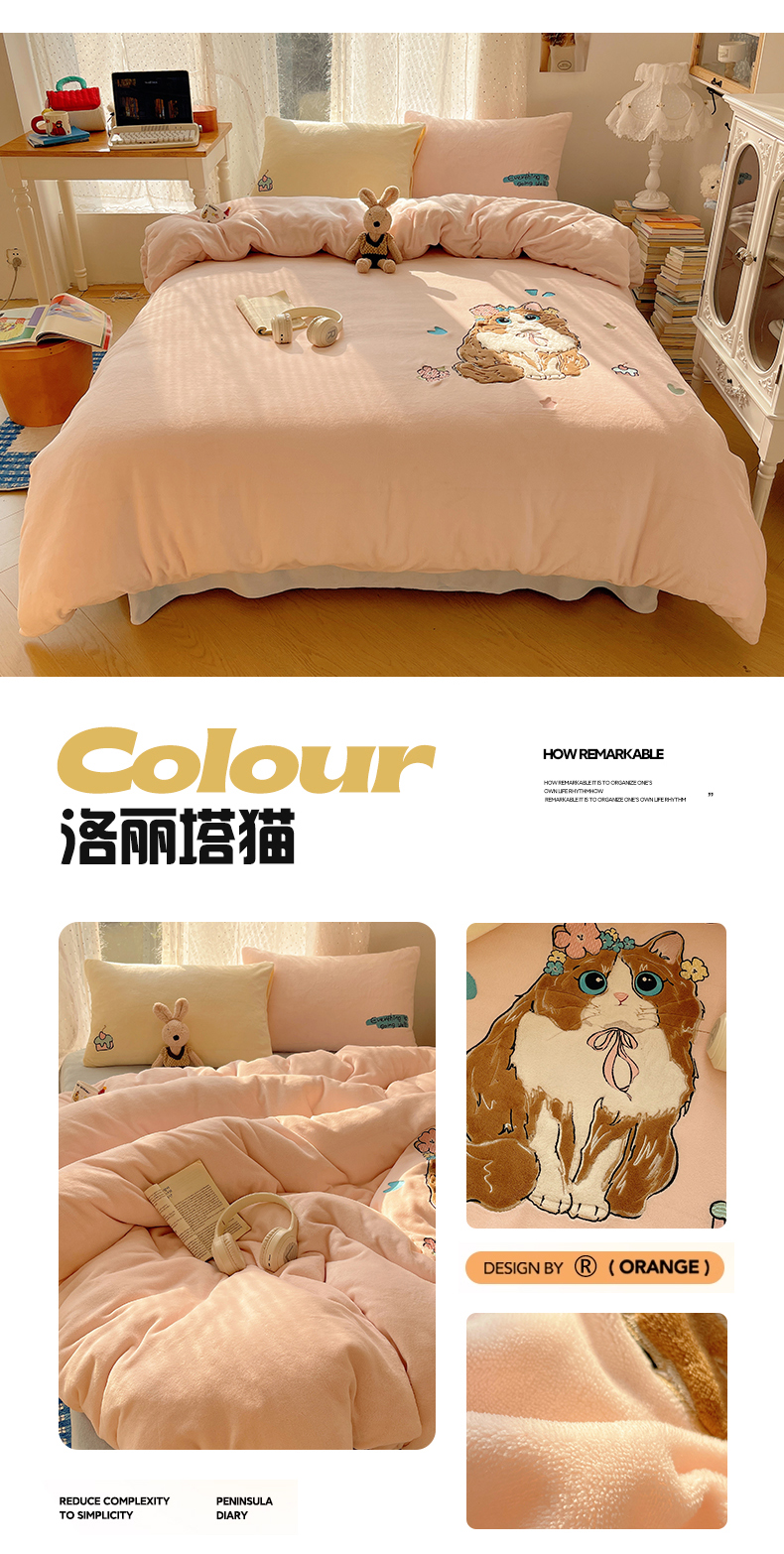 轻奢坊 2025新款牛奶绒ins可爱贴布绣四件套 洛丽塔猫