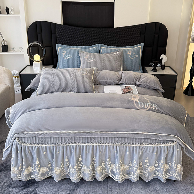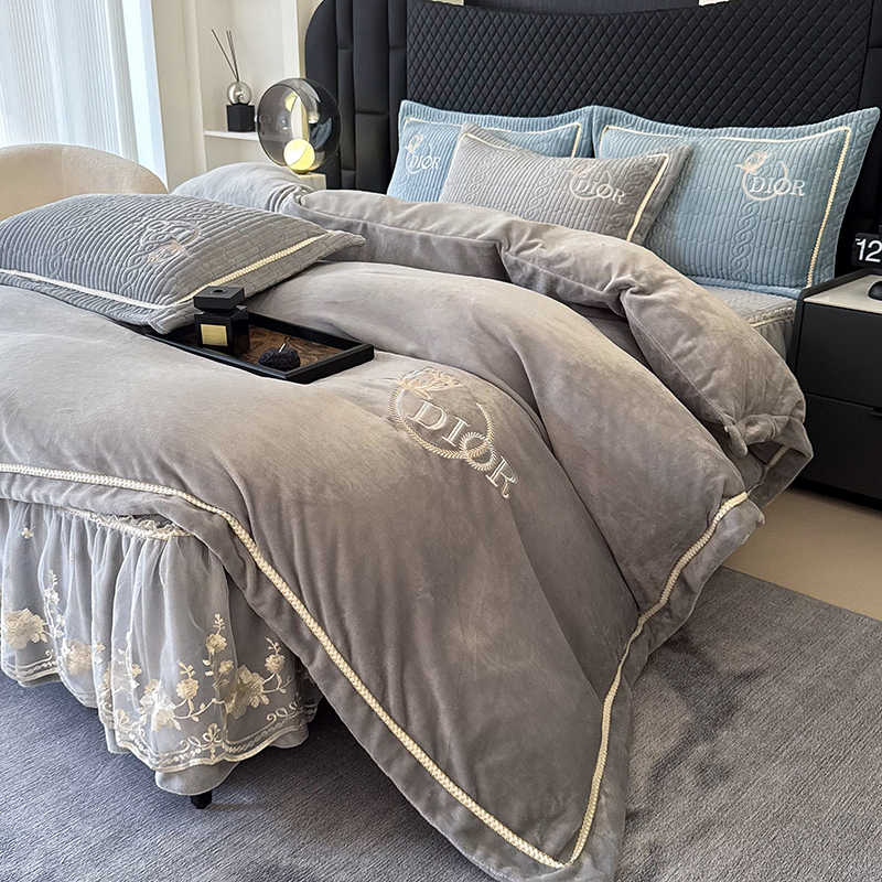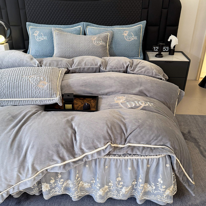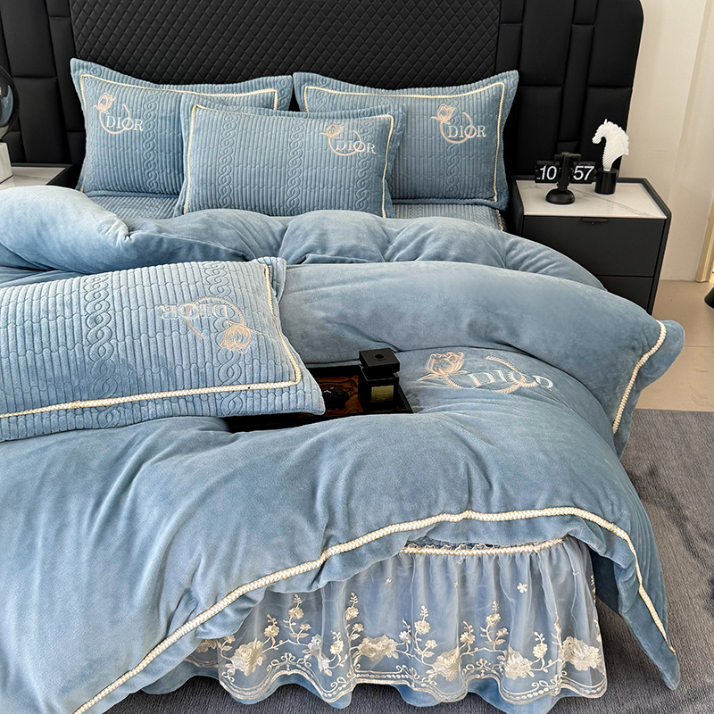 优姿家纺 2025新款牛奶绒花边绣花床盖四件套 花漾时光-雾霾蓝