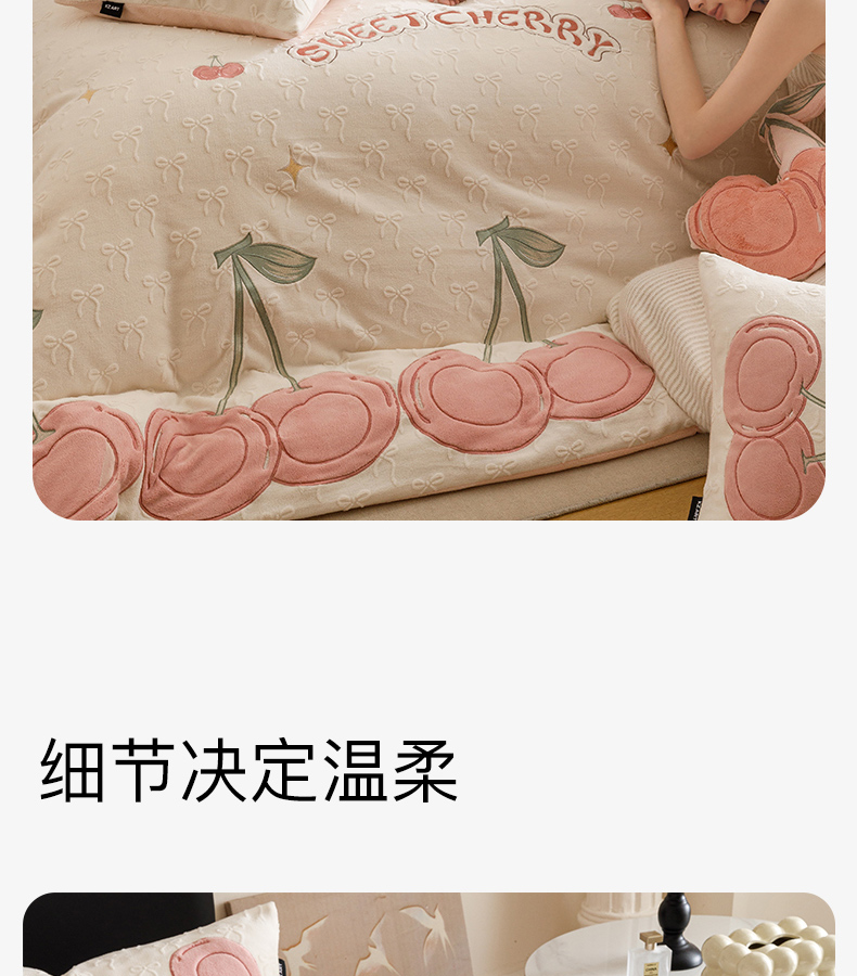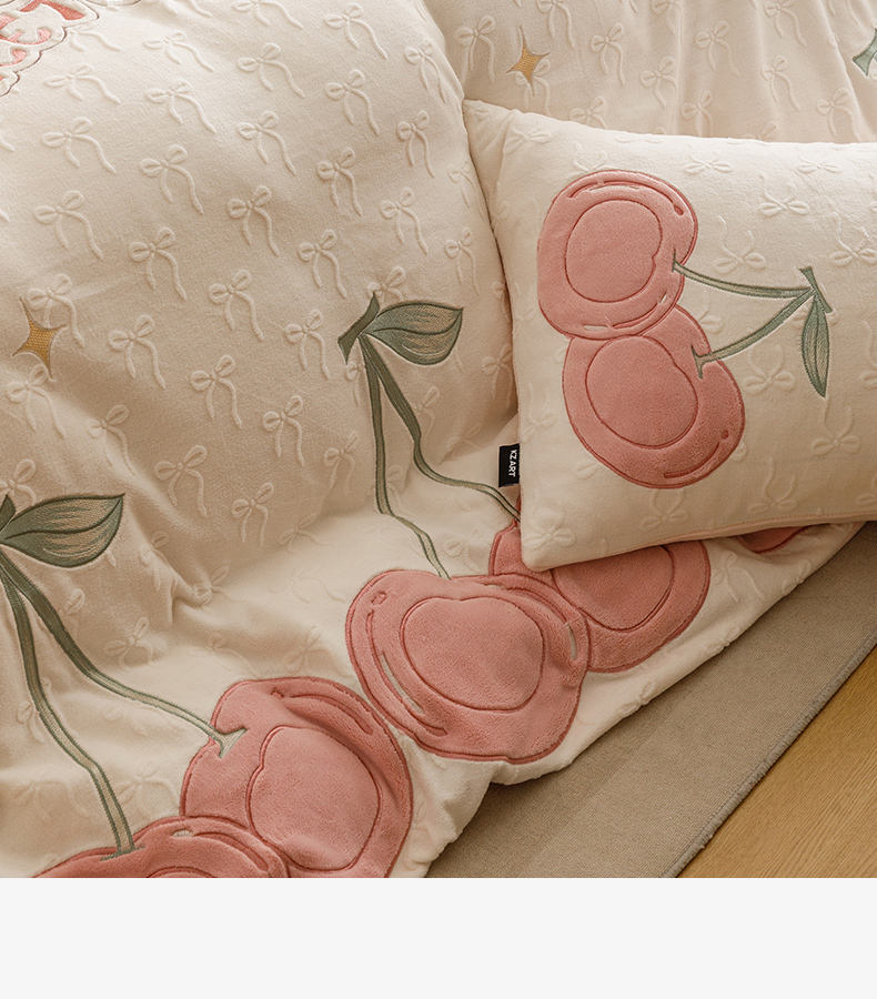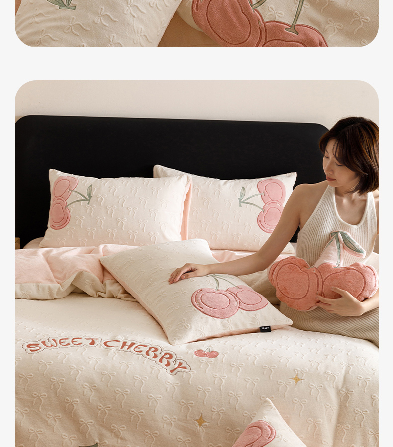 卡姿家纺 2025秋冬德国奶芙绒提花甜美风—樱桃可颂 樱桃可颂-奶白