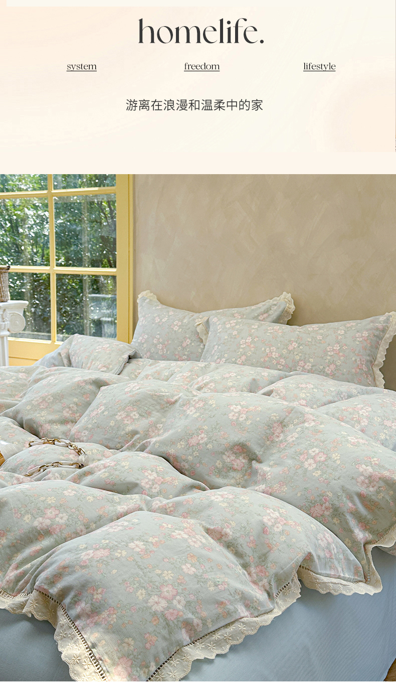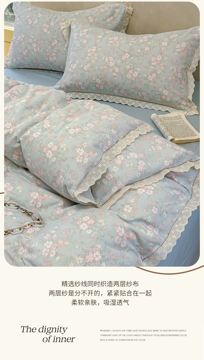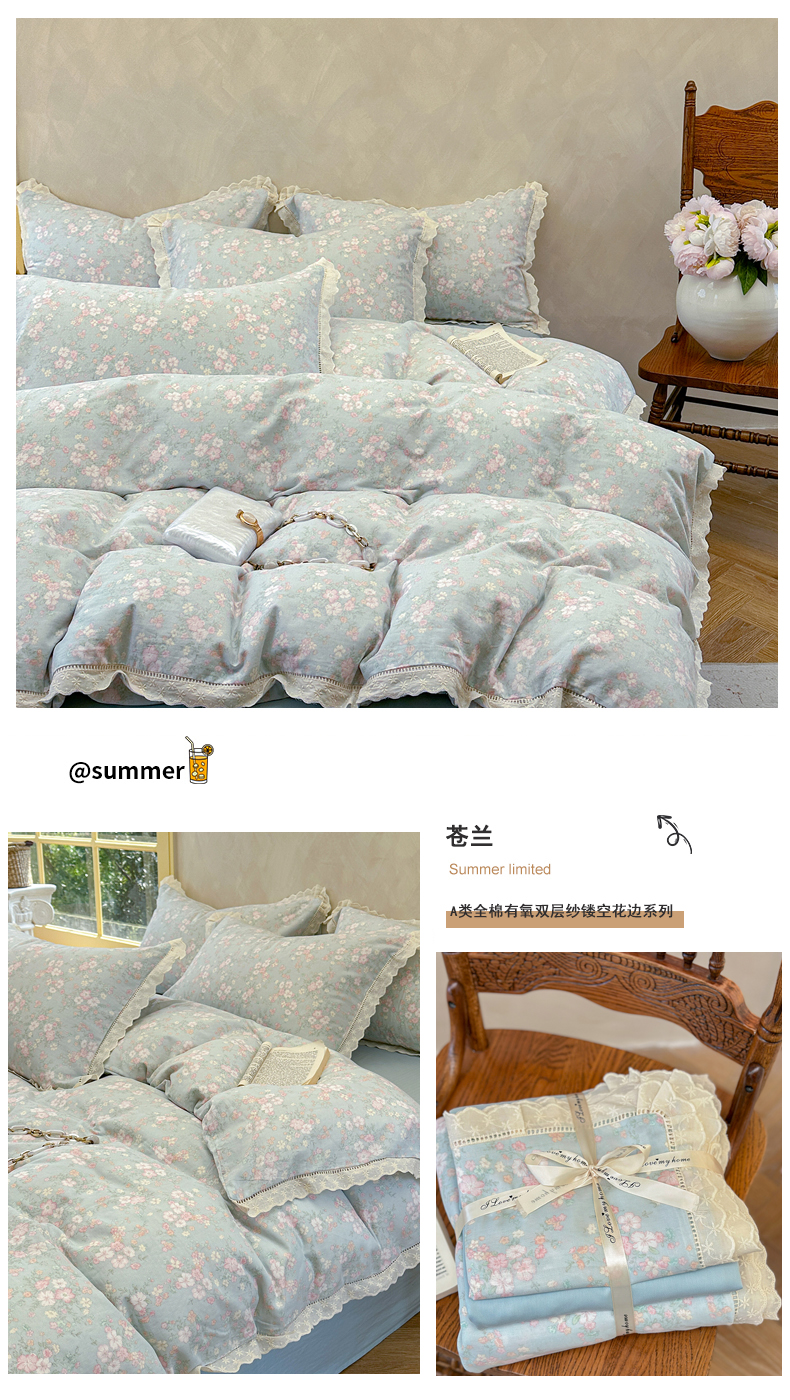 当前位置: 91家纺网 > 商品网购 > 床品套件 > 四件套 > 双层纱四件套 > 麦伦家居 2025新款A类全棉有氧双层纱印花系列四件套-镂空系列 苍兰