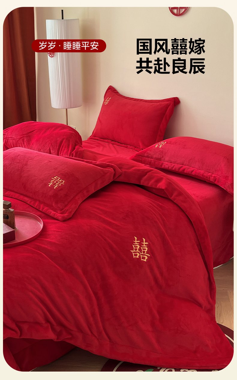 (总)欧乐蒂 2025新款高克重牛奶绒刺绣四件套-家家有喜,家家有喜-红,家家有喜-金