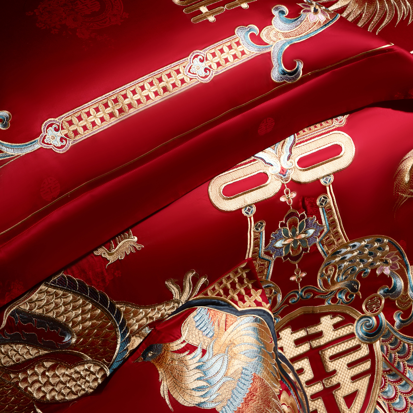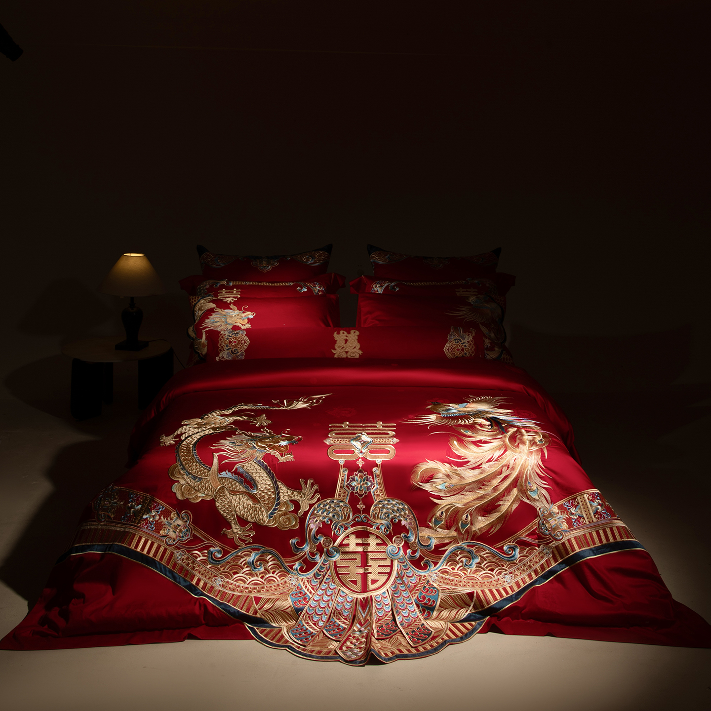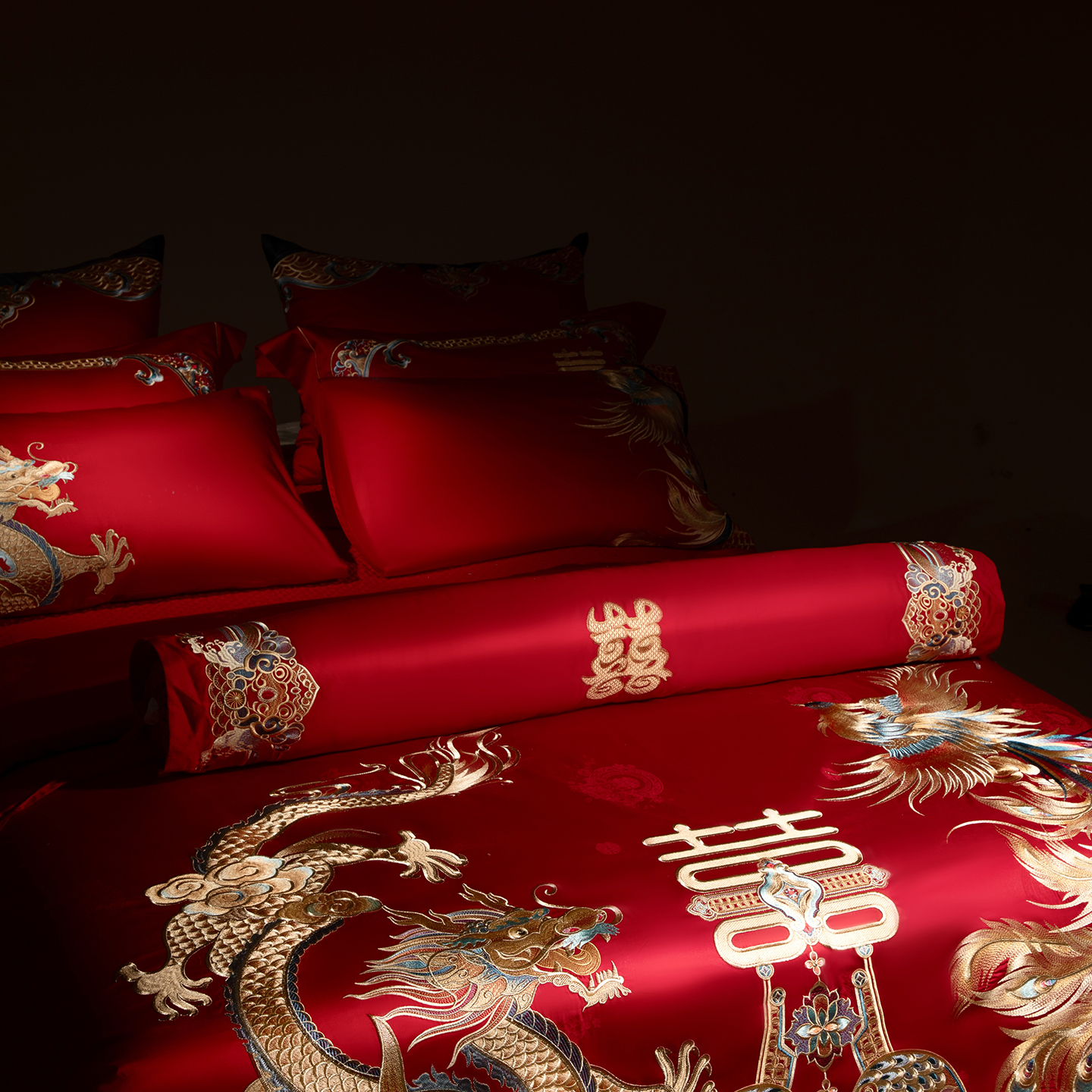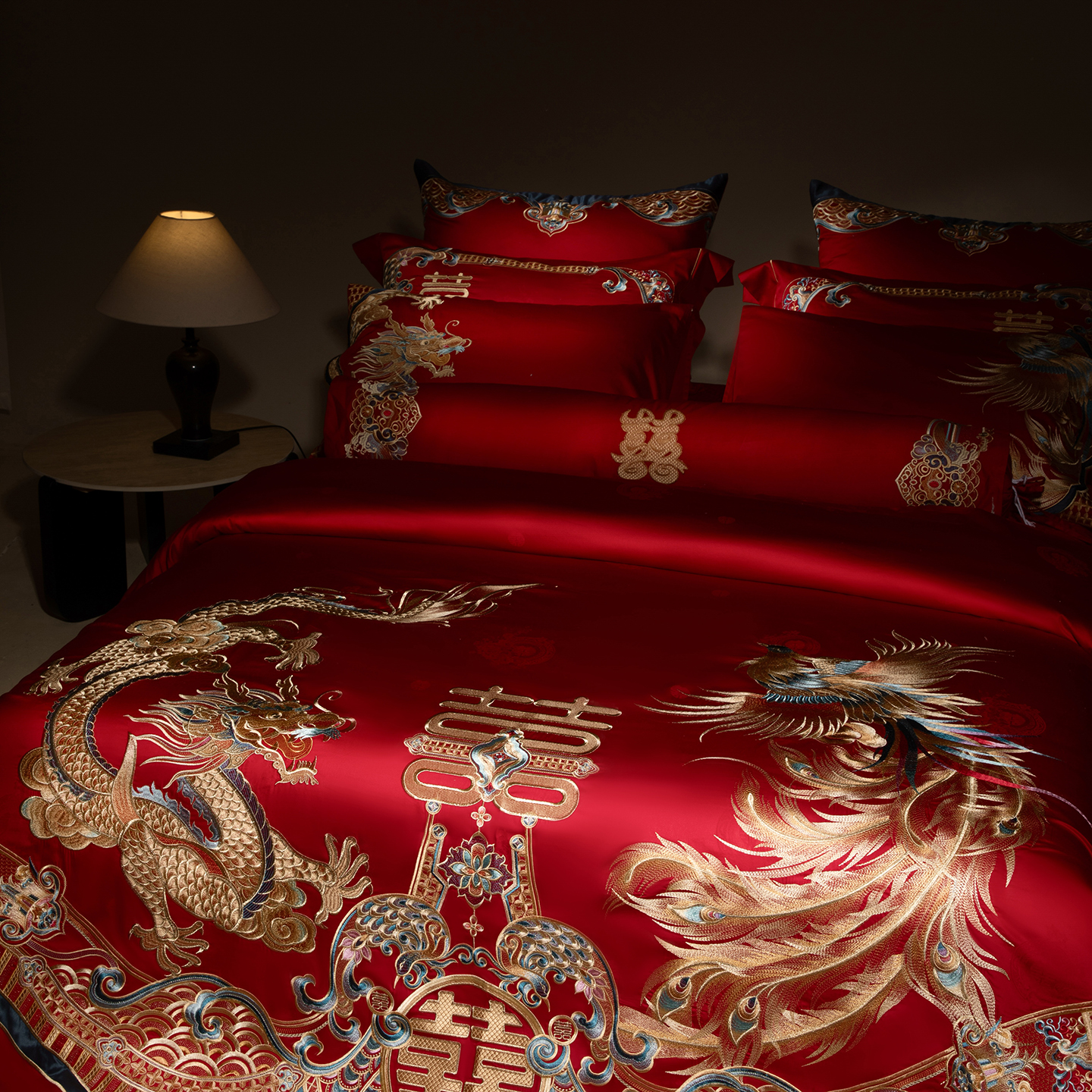 当前位置: 91家纺网 > 商品网购 > 床品套件 > 四件套 > 婚庆四件套 > (总)佳汐蓝家纺 2025新款100支贡缎提花全棉刺绣婚庆四件套-龙威凤彩