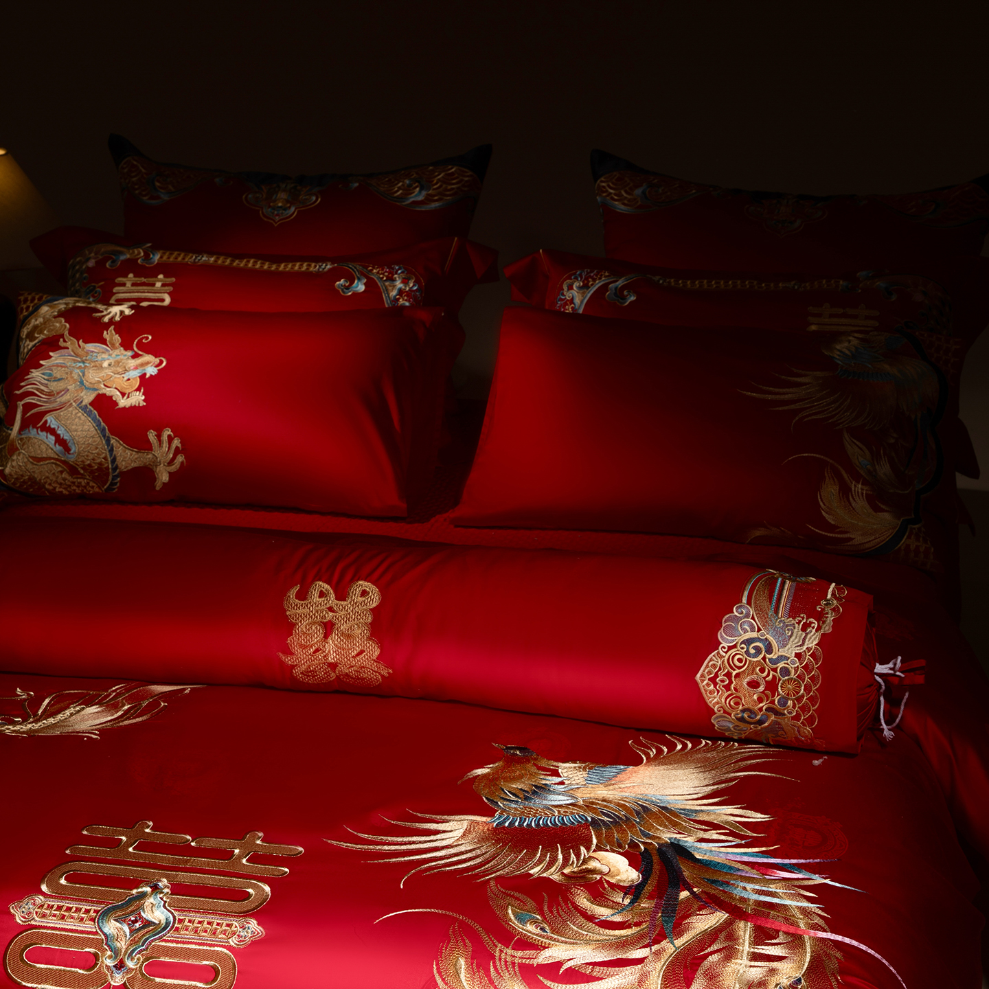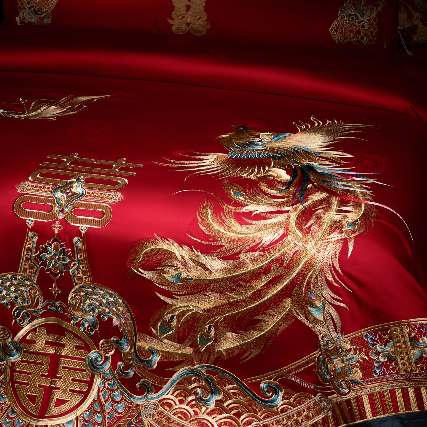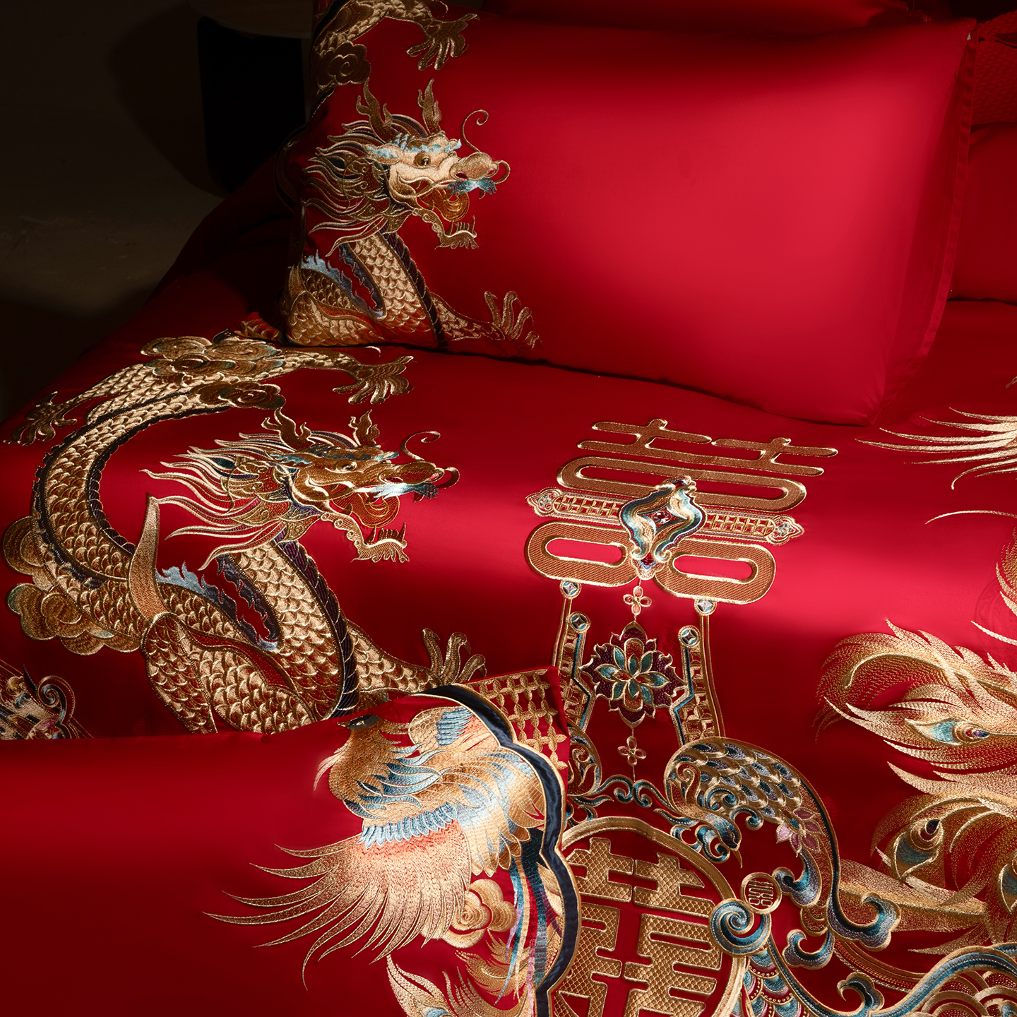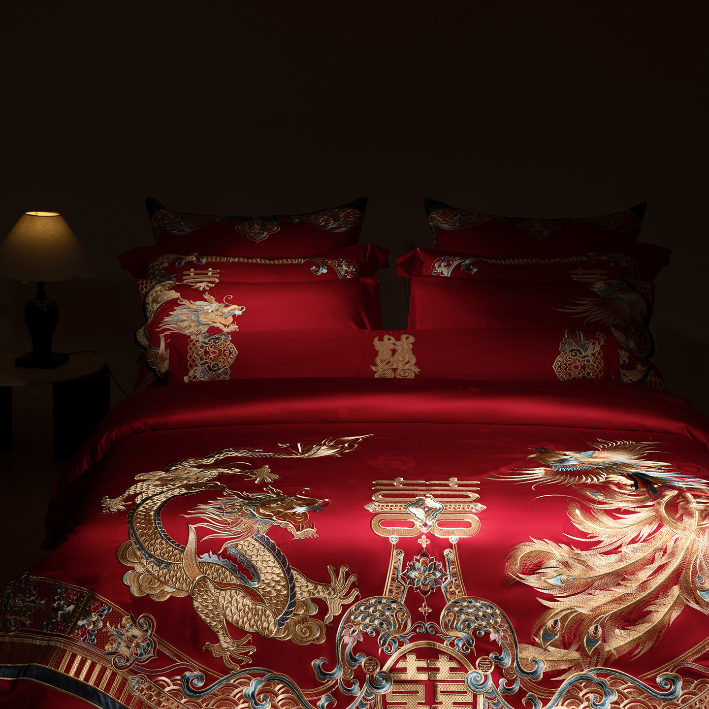 当前位置: 91家纺网 > 商品网购 > 床品套件 > 四件套 > 婚庆四件套 > (总)佳汐蓝家纺 2025新款100支贡缎提花全棉刺绣婚庆四件套-龙威凤彩