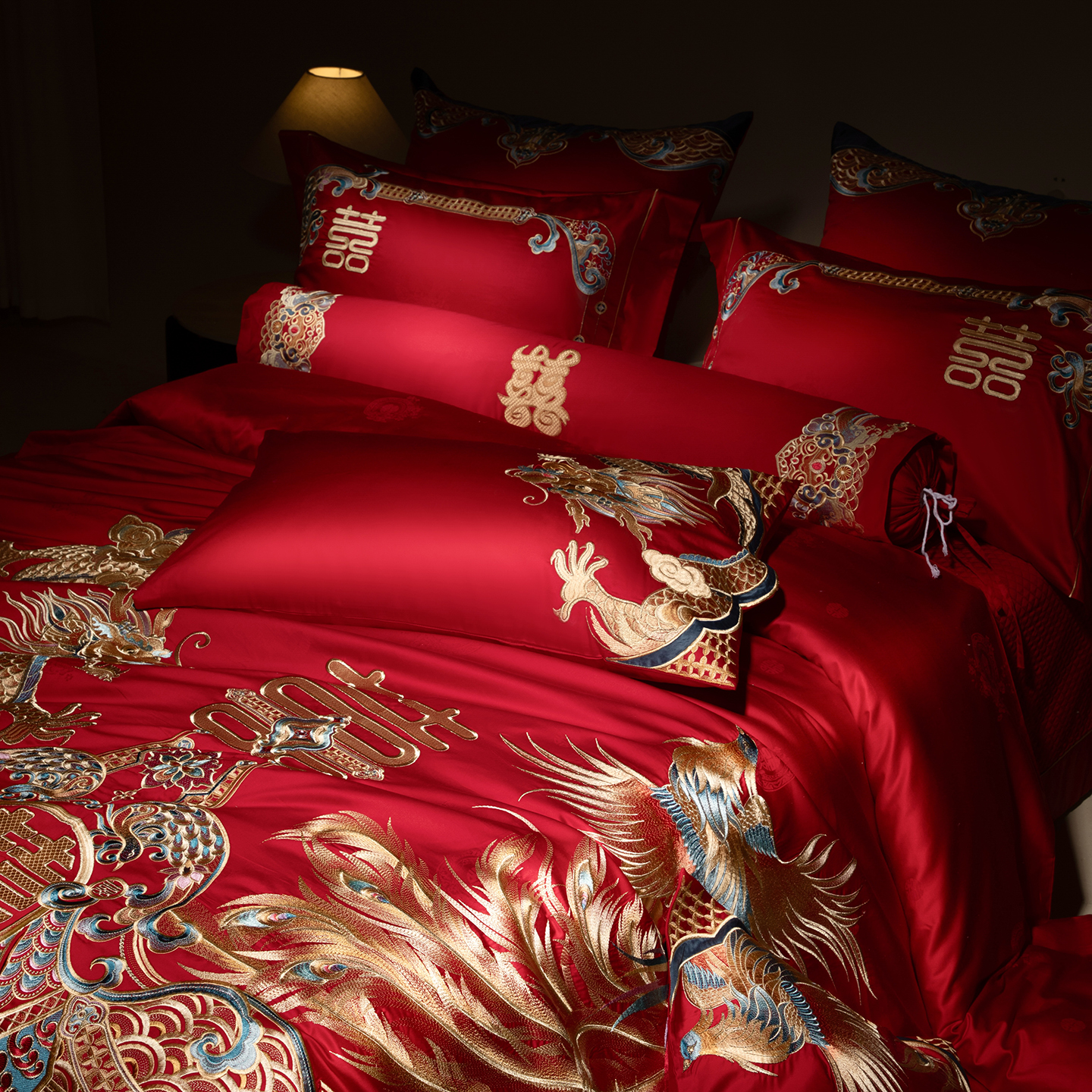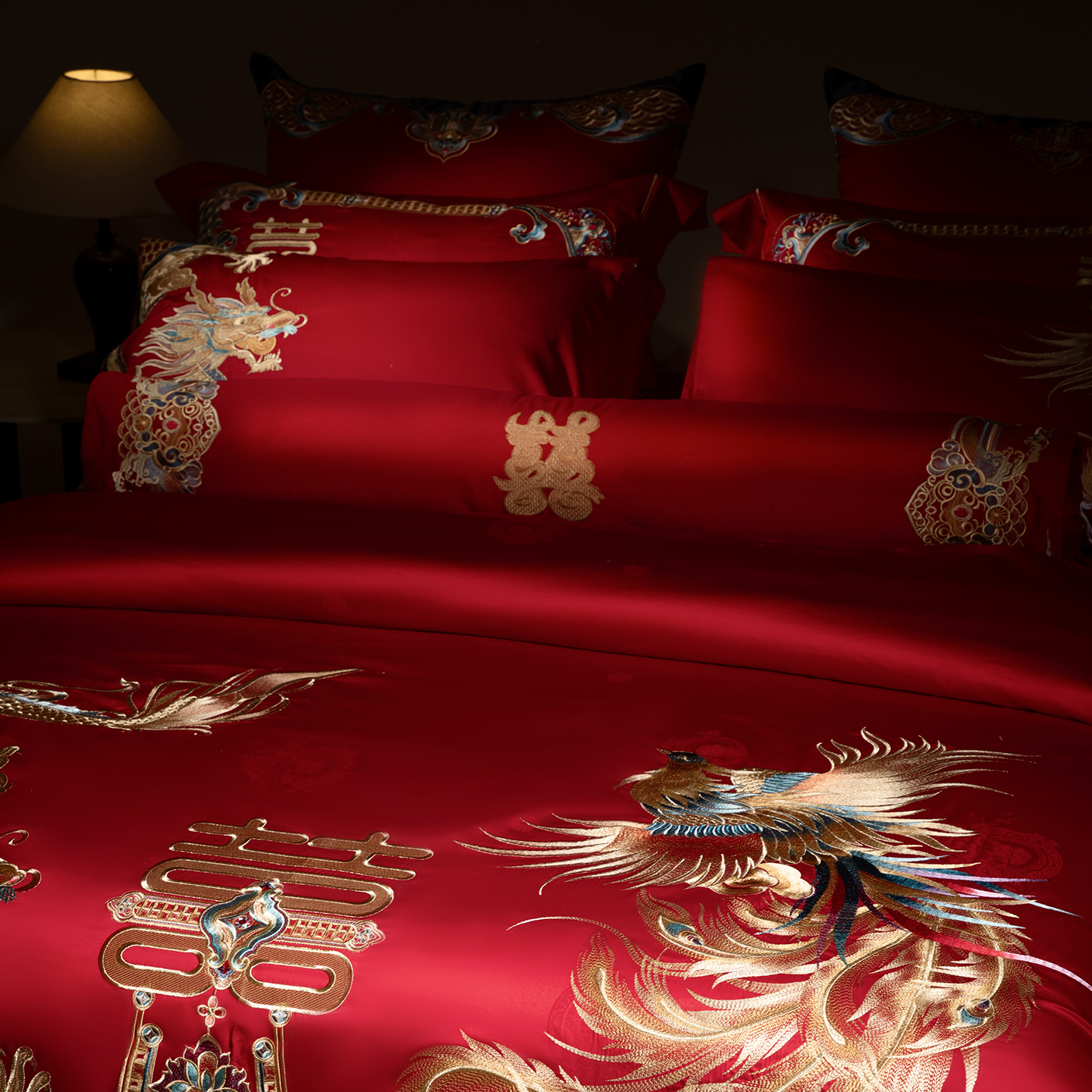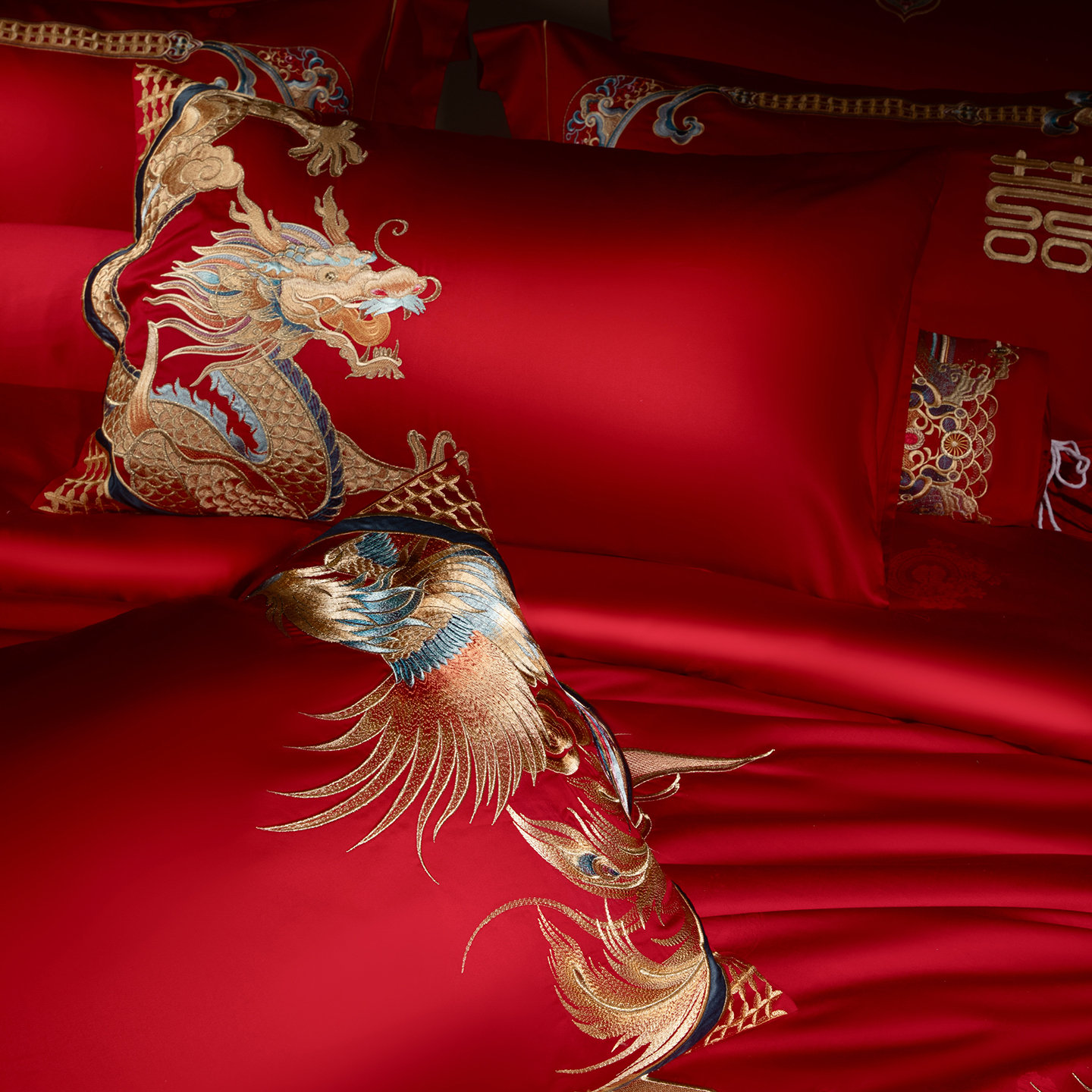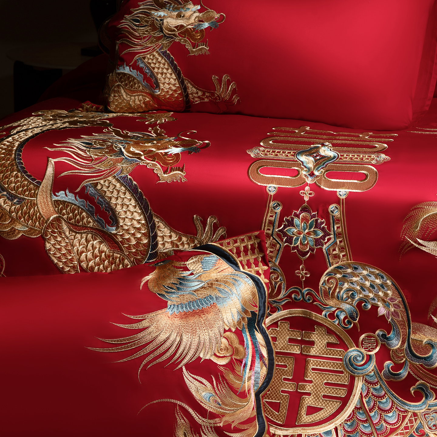 当前位置: 91家纺网 > 商品网购 > 床品套件 > 四件套 > 婚庆四件套 > (总)佳汐蓝家纺 2025新款100支贡缎提花全棉刺绣婚庆四件套-龙威凤彩