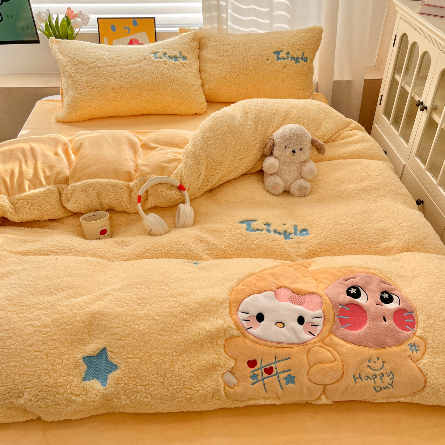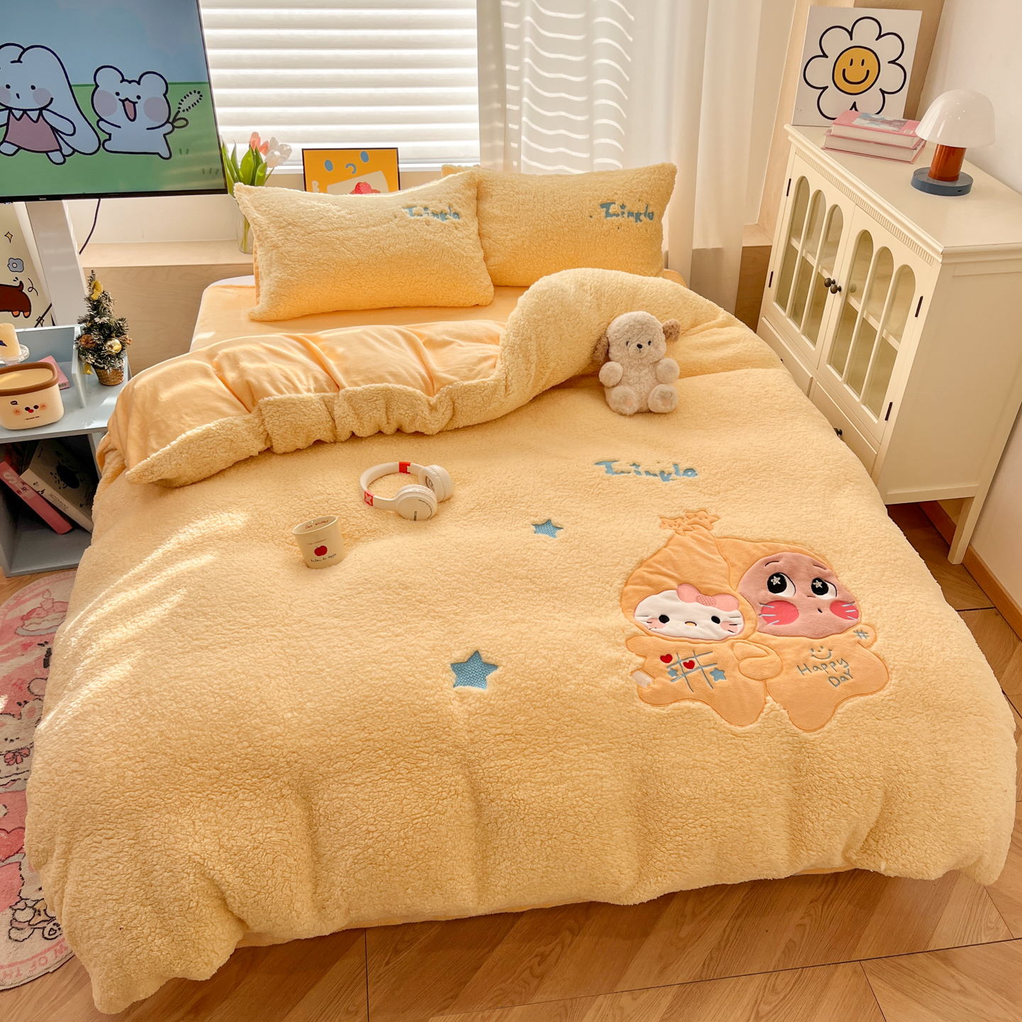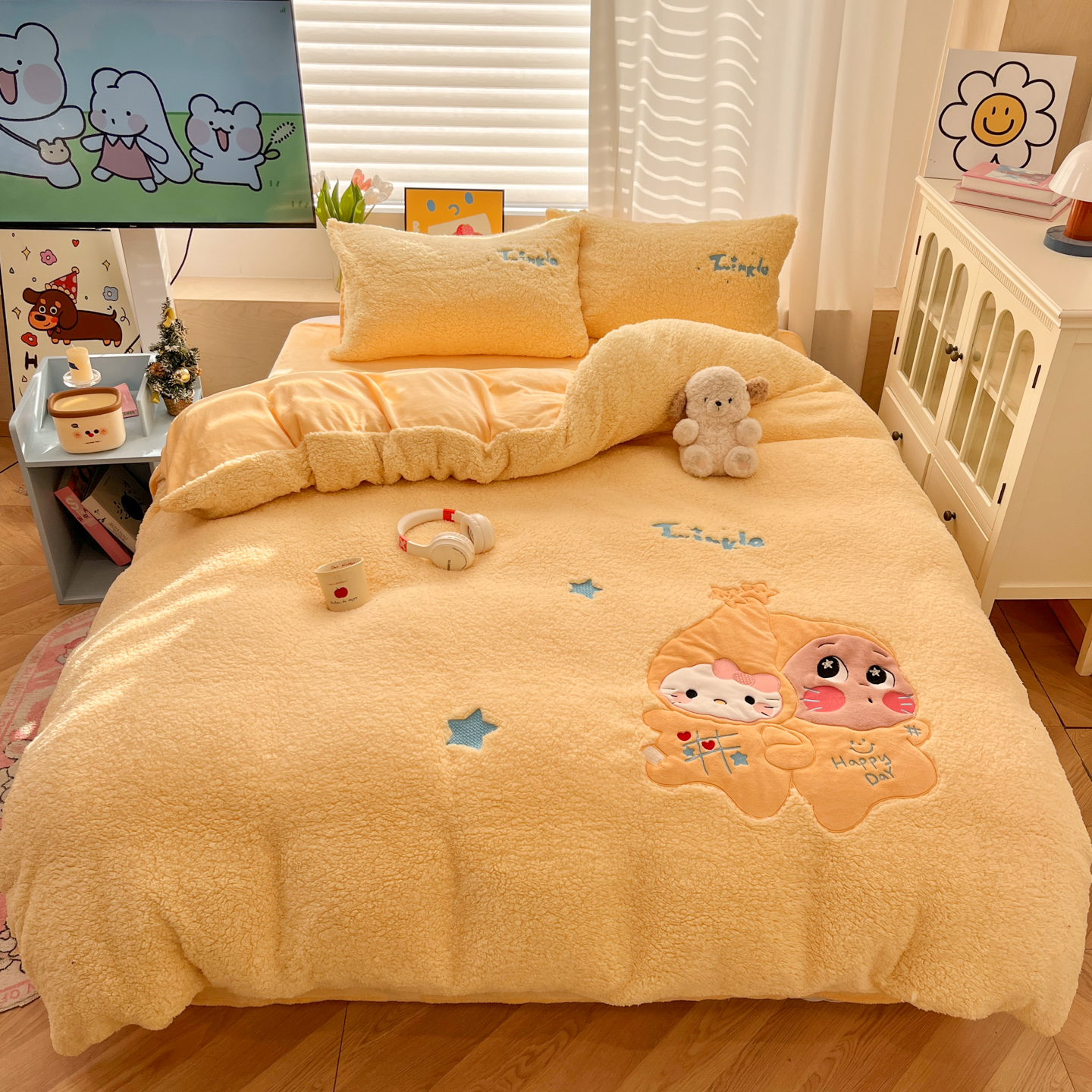 色鬼布艺高端家居主号 2025新款秋冬加厚素色大朵羊驼绒贴布刺绣220g全消光牛奶绒四件套-暖宝 暖宝-黄猫