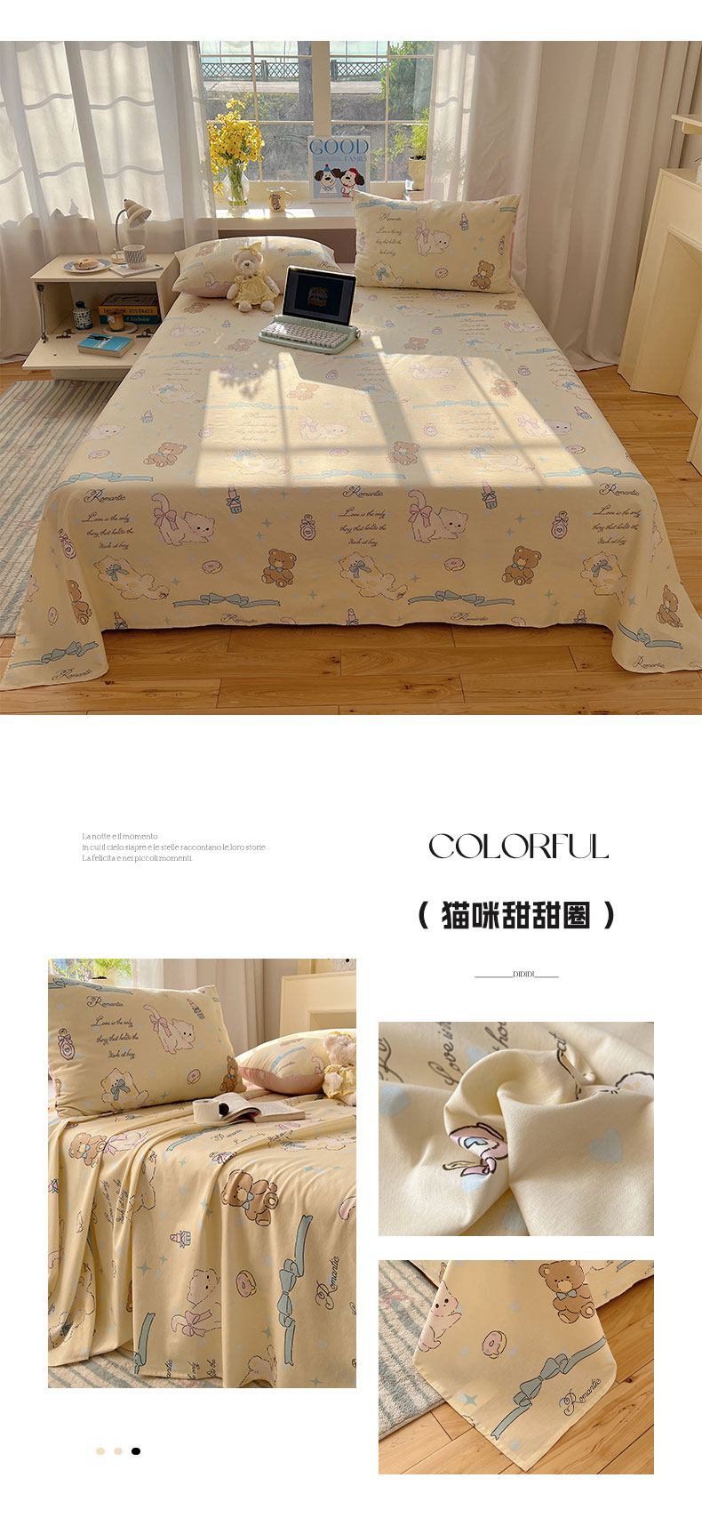商品名称:六巷胡同 2026新款40支全棉13070卡通单品床单 卡哇伊猫咪