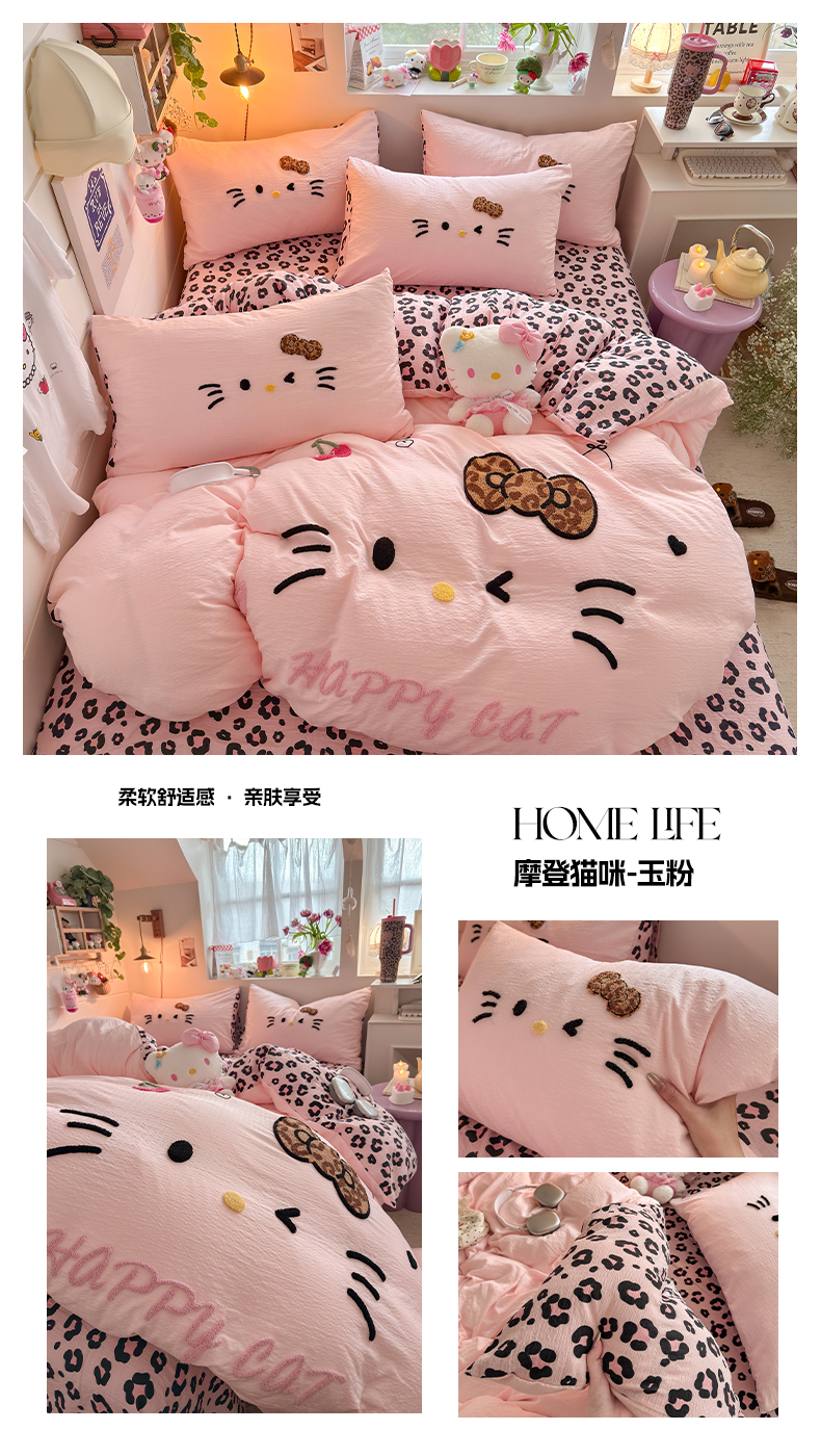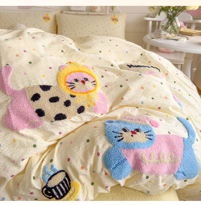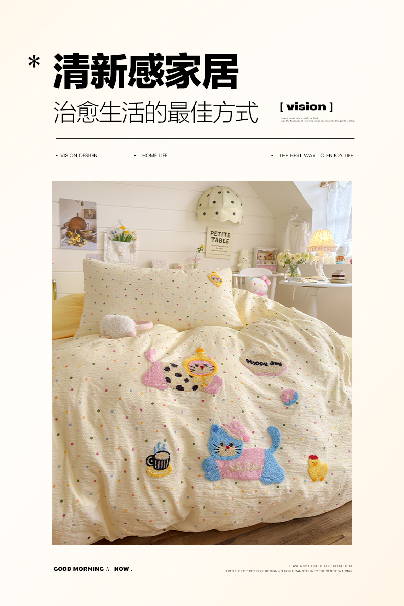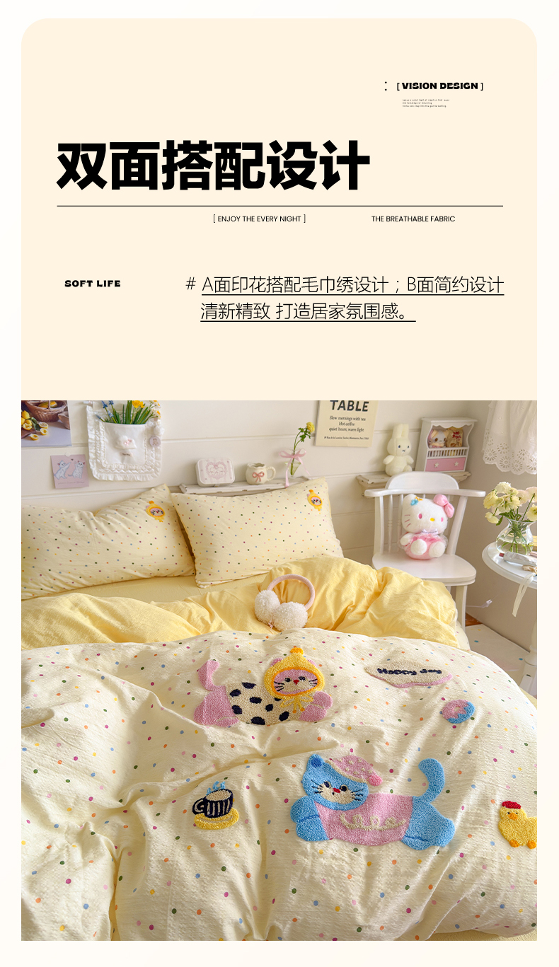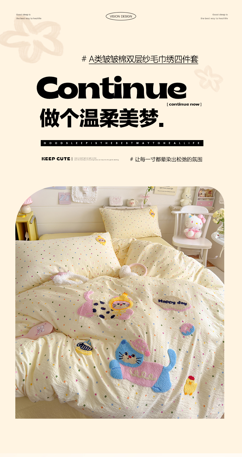 当前位置: 91家纺网 > 商品网购 > 床品套件 > 四件套 > 其它四件套 > 卡斯诺家纺馆 2026新款皱皱棉双层纱毛巾绣四件套(下载文件包含买家秀) 快乐猫咪