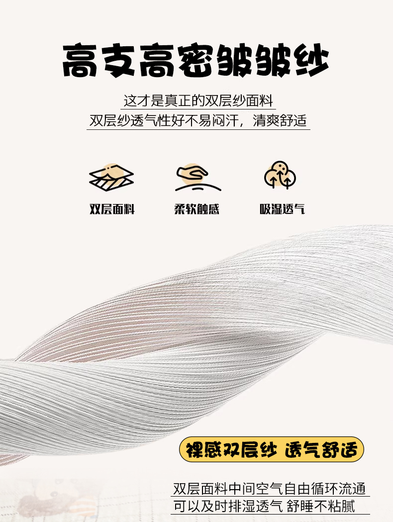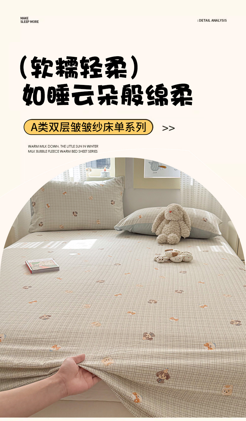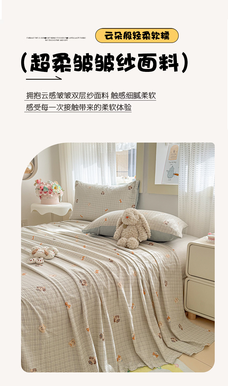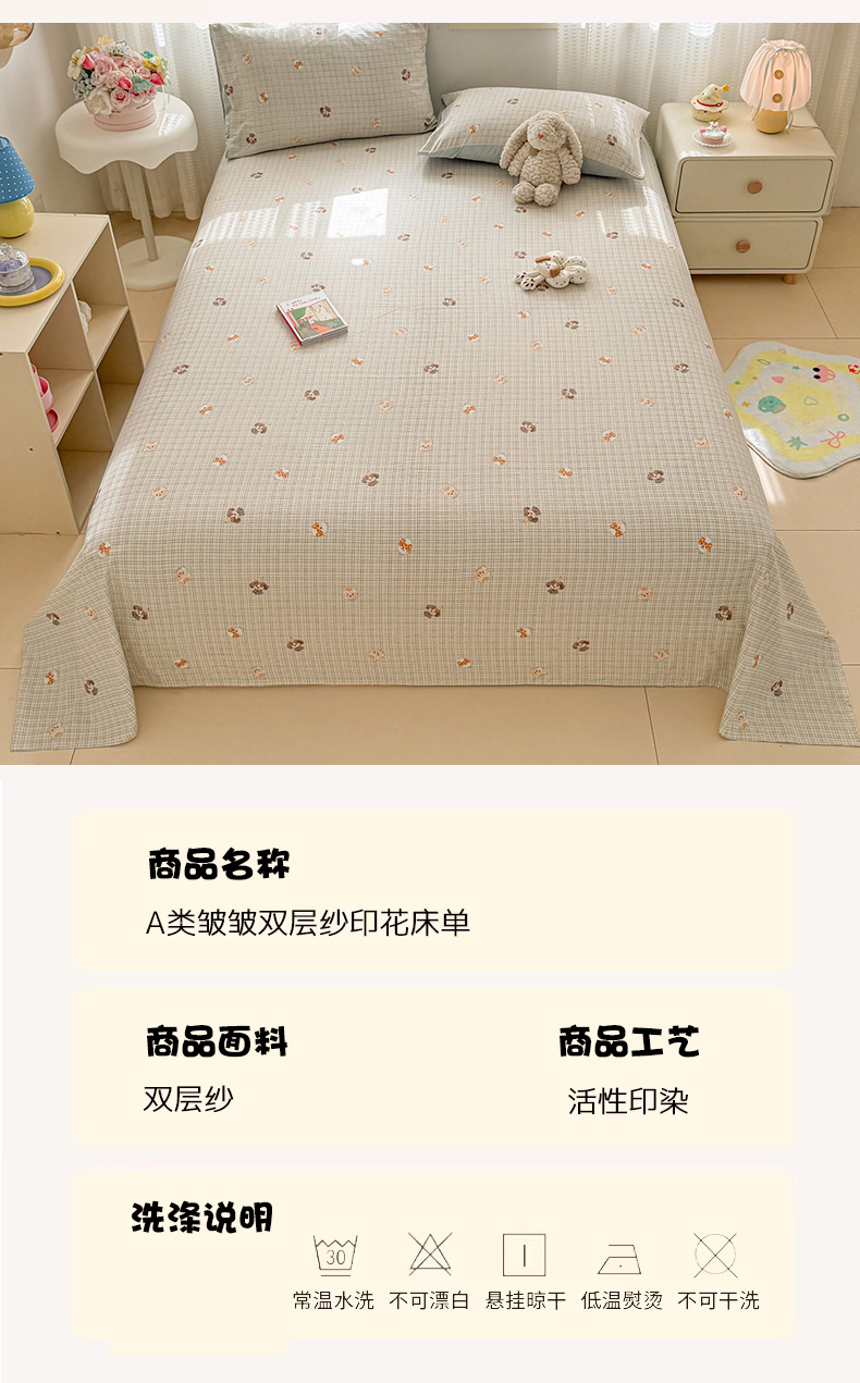 • 91家纺网 家纺一手货源 找家纺 丽美人家纺 2026新款A类皱皱双层纱印花单床单床单单件 格仔萌宠