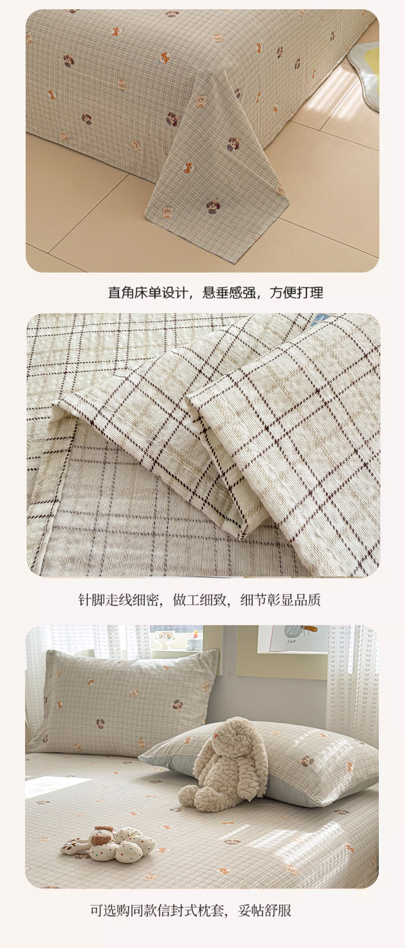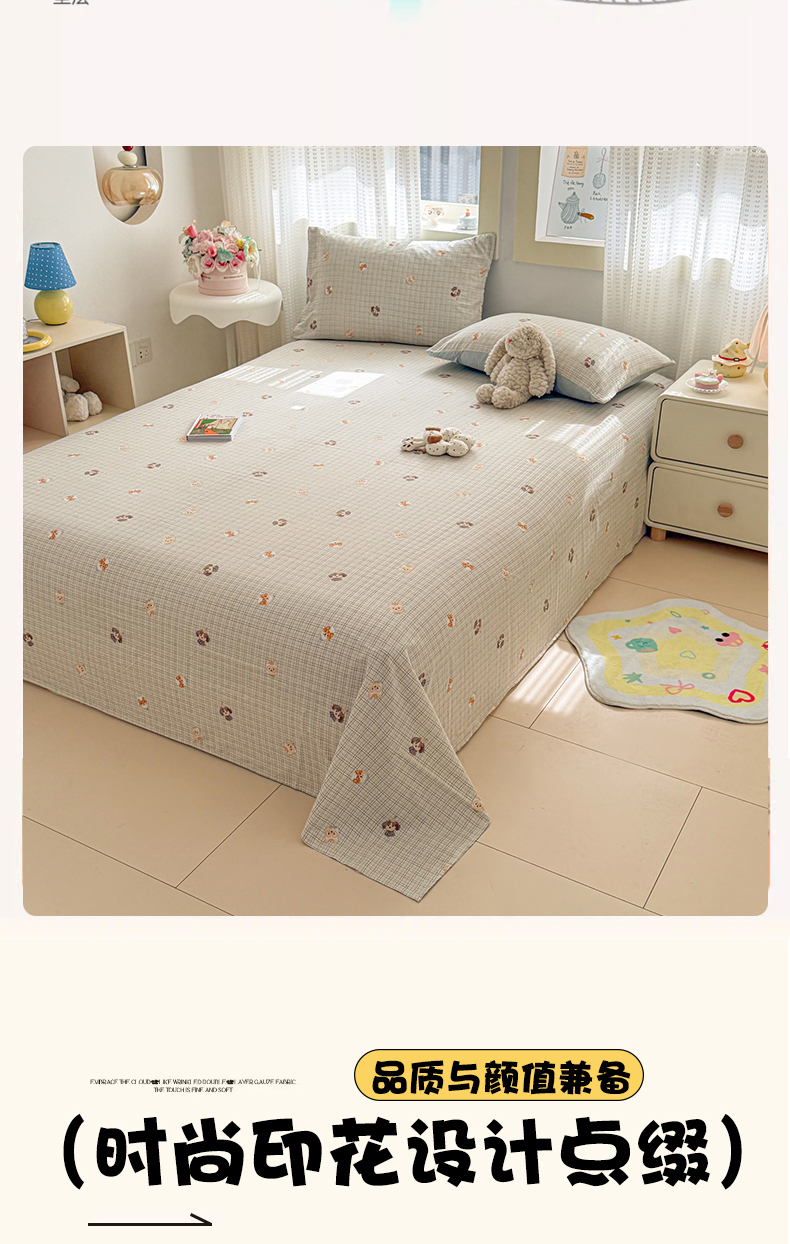 丽美人家纺 2026新款A类皱皱双层纱印花单床单床单单件 格仔萌宠