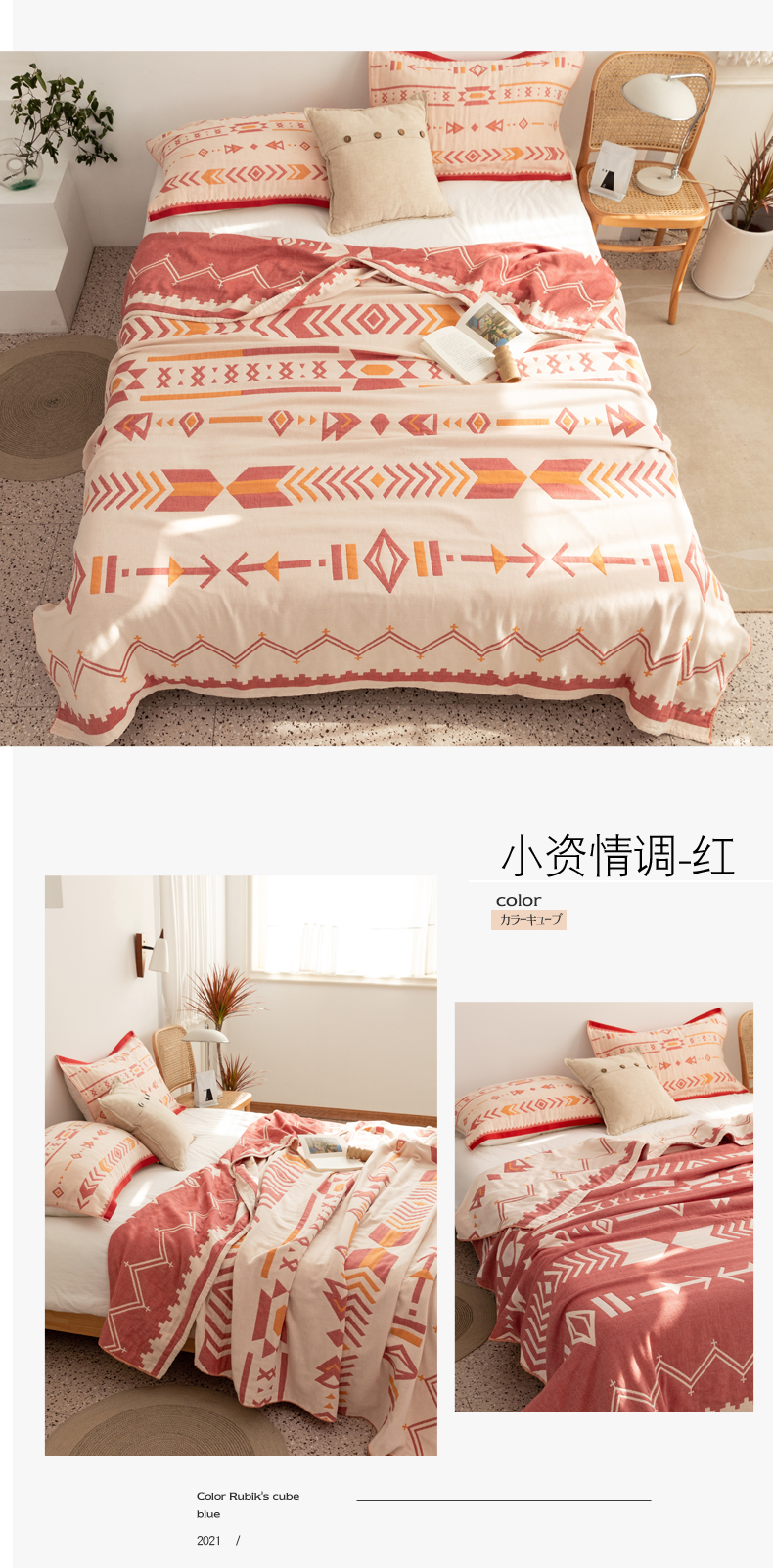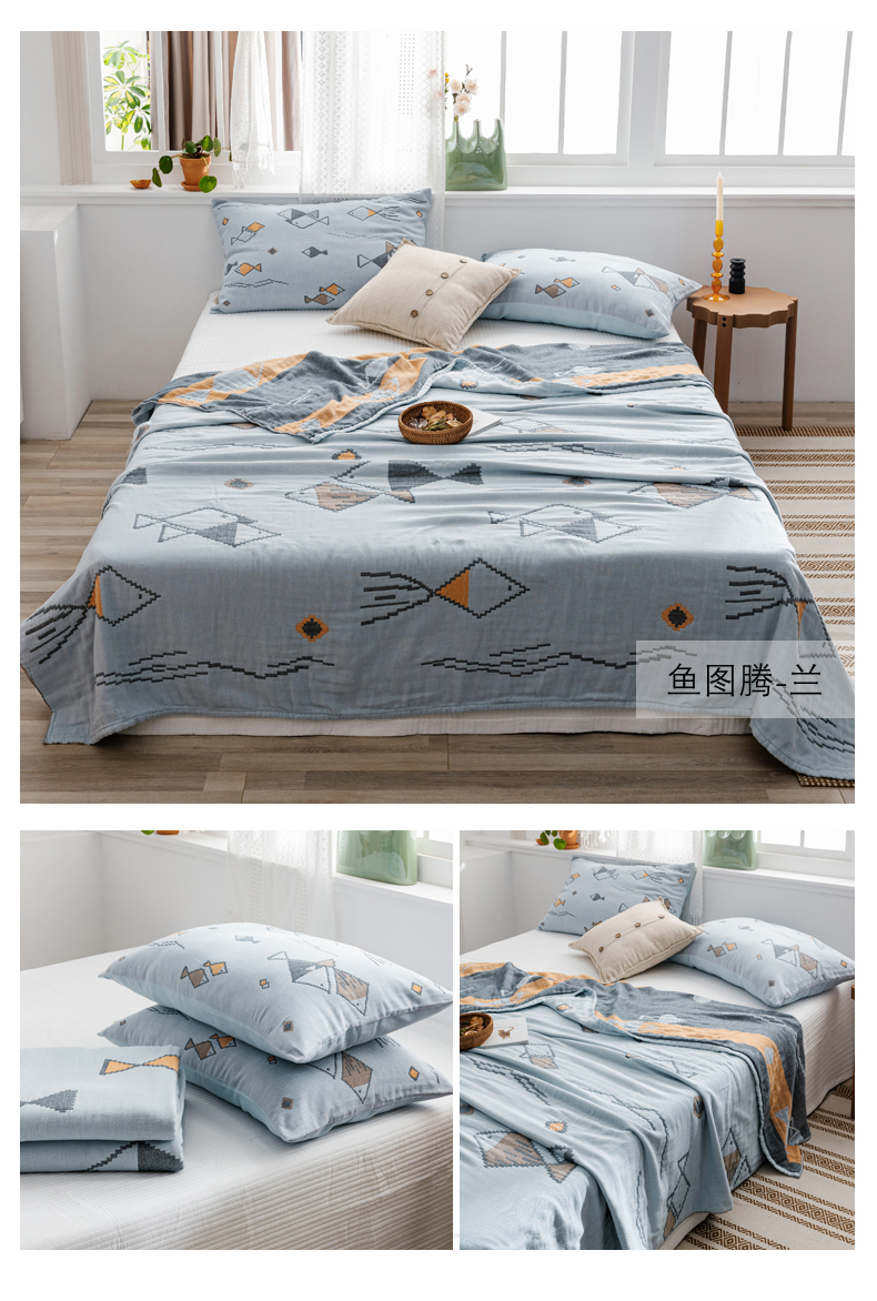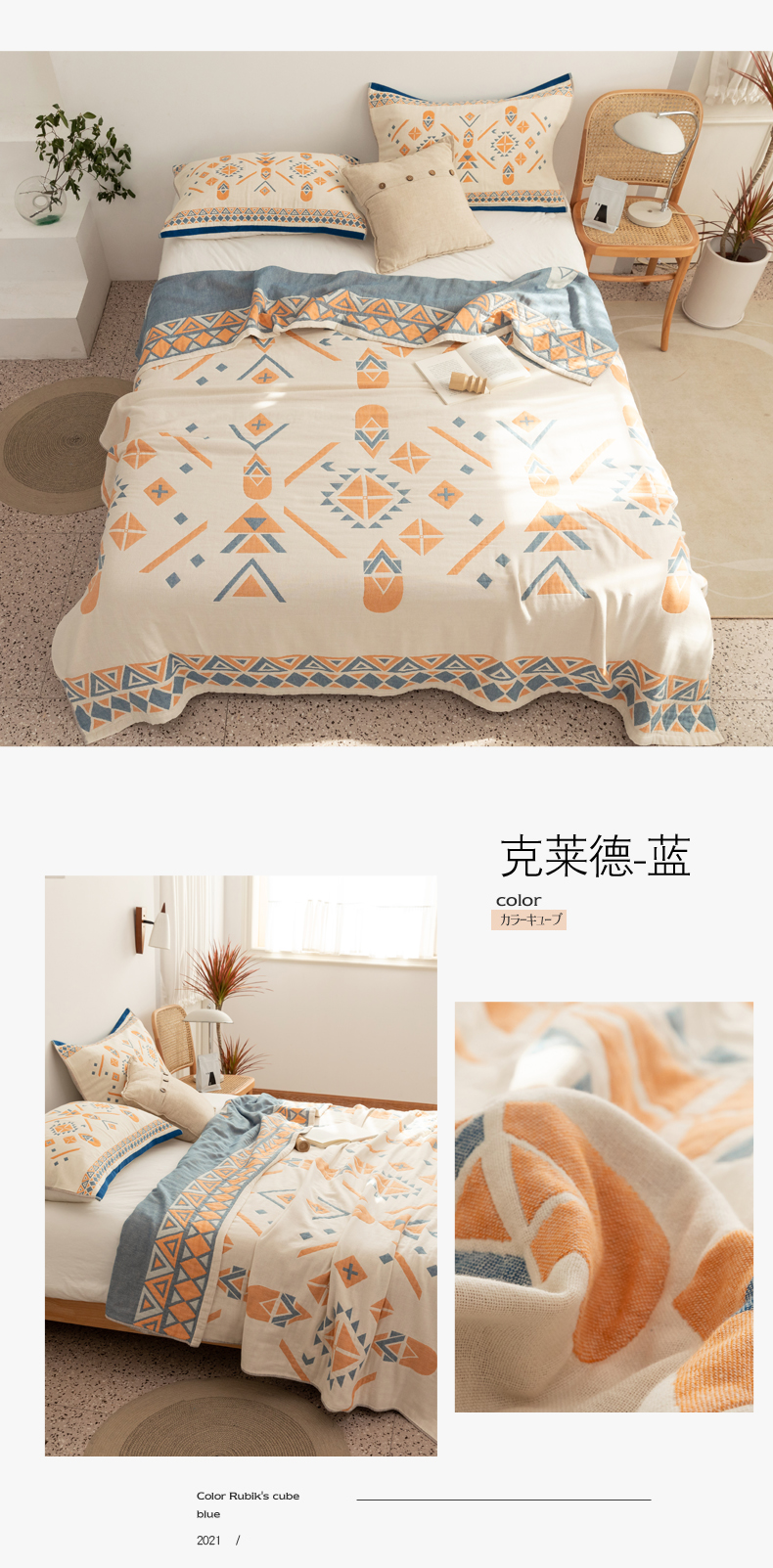 商品名称:朴尔家纺-毛巾被 2026新款波西米亚风全棉四层纱布毛巾被-朴尔经典款常年备货 克莱德-蓝