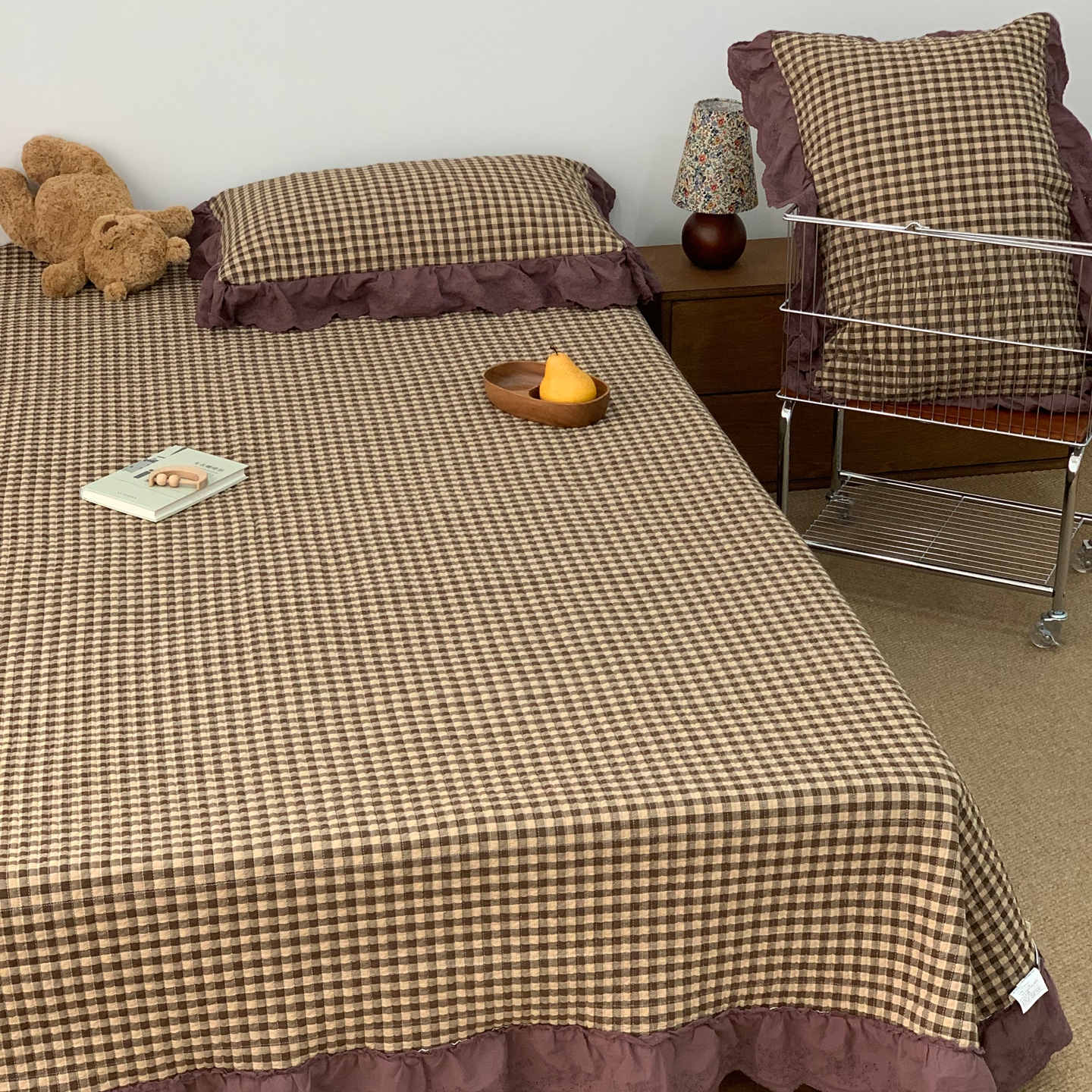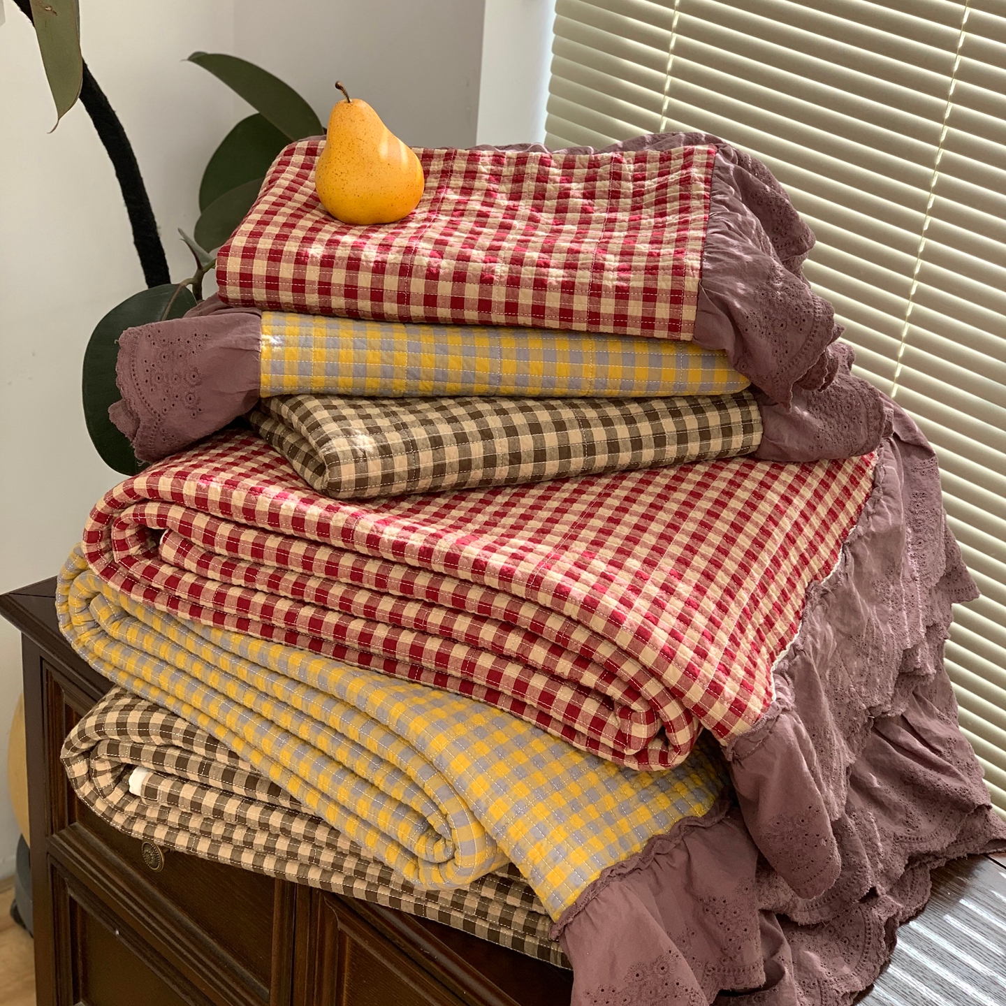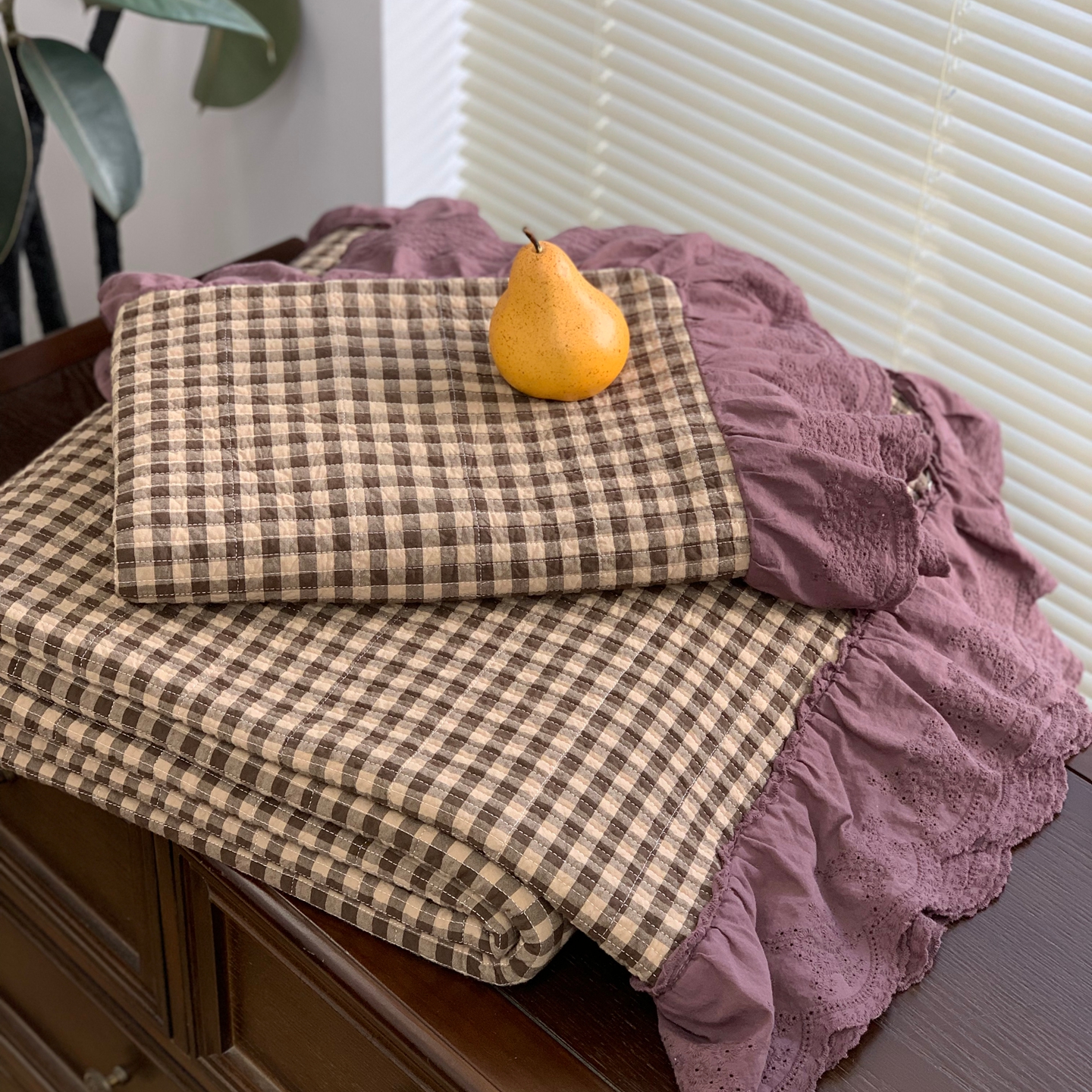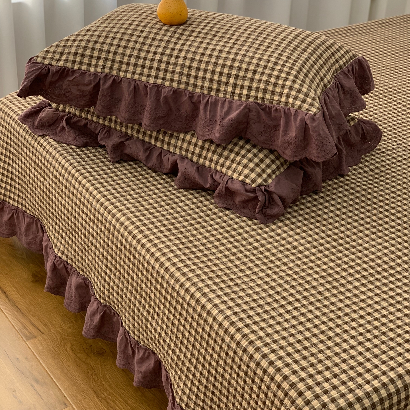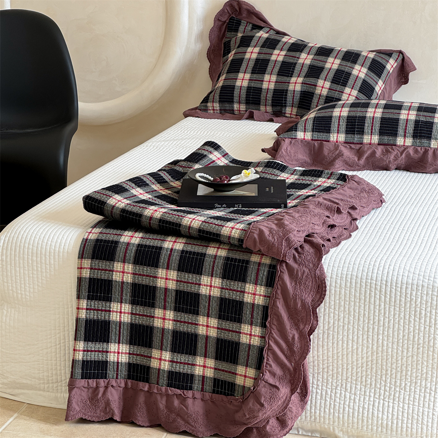 商品名称:床盖工厂店 2025新款双面全棉纯棉填充棉花花边款床盖三件套芸素 芸素 黑格