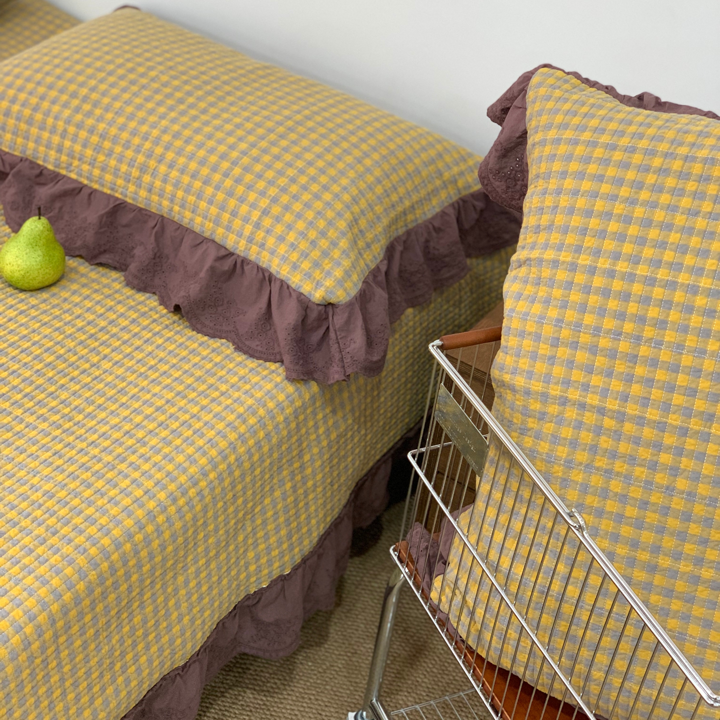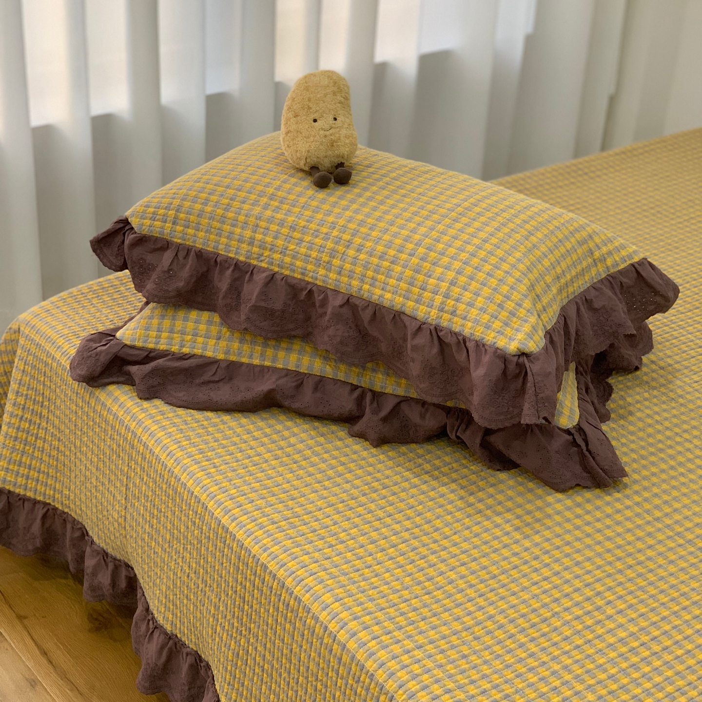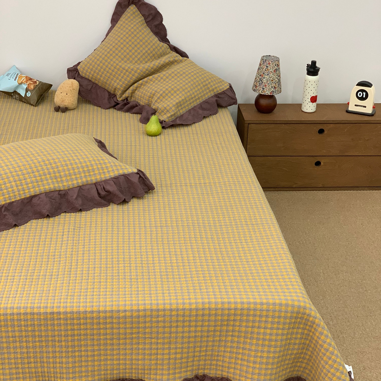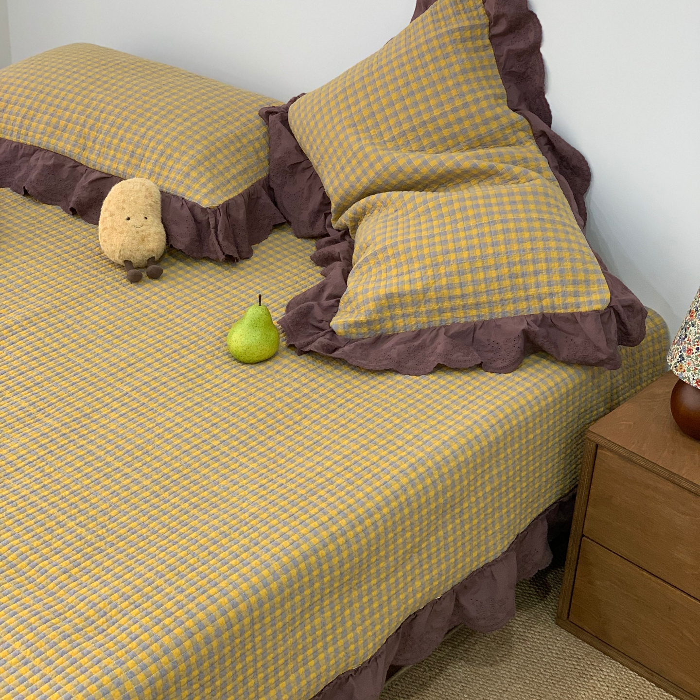 商品名称:床盖工厂店 2025新款双面全棉纯棉填充棉花花边款床盖三件套芸素 芸素 黑格