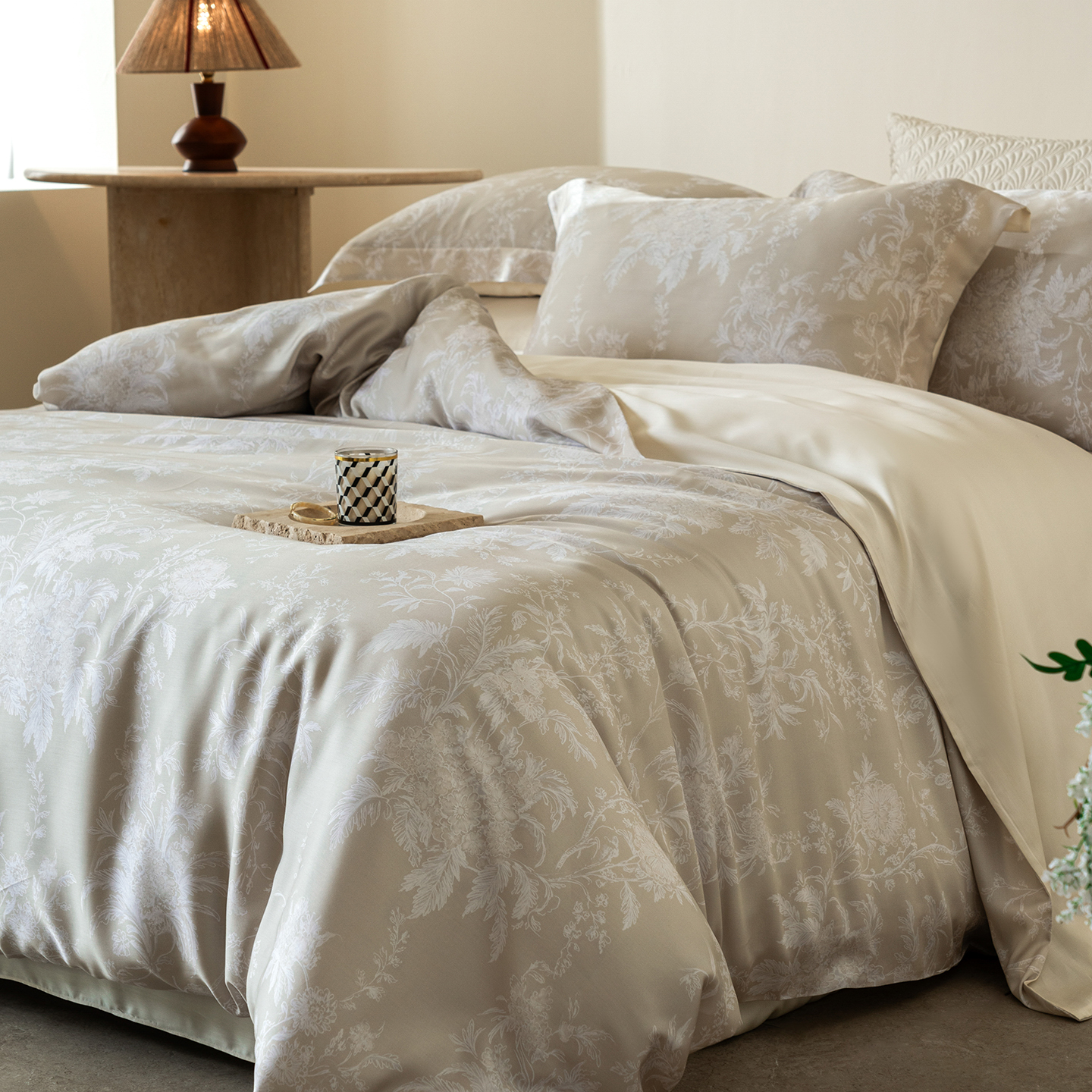 (总)佳汐蓝 2025春夏新品双层皱皱纱刺绣+织带+荷叶边四件套--白茶花,奶白,曲奇