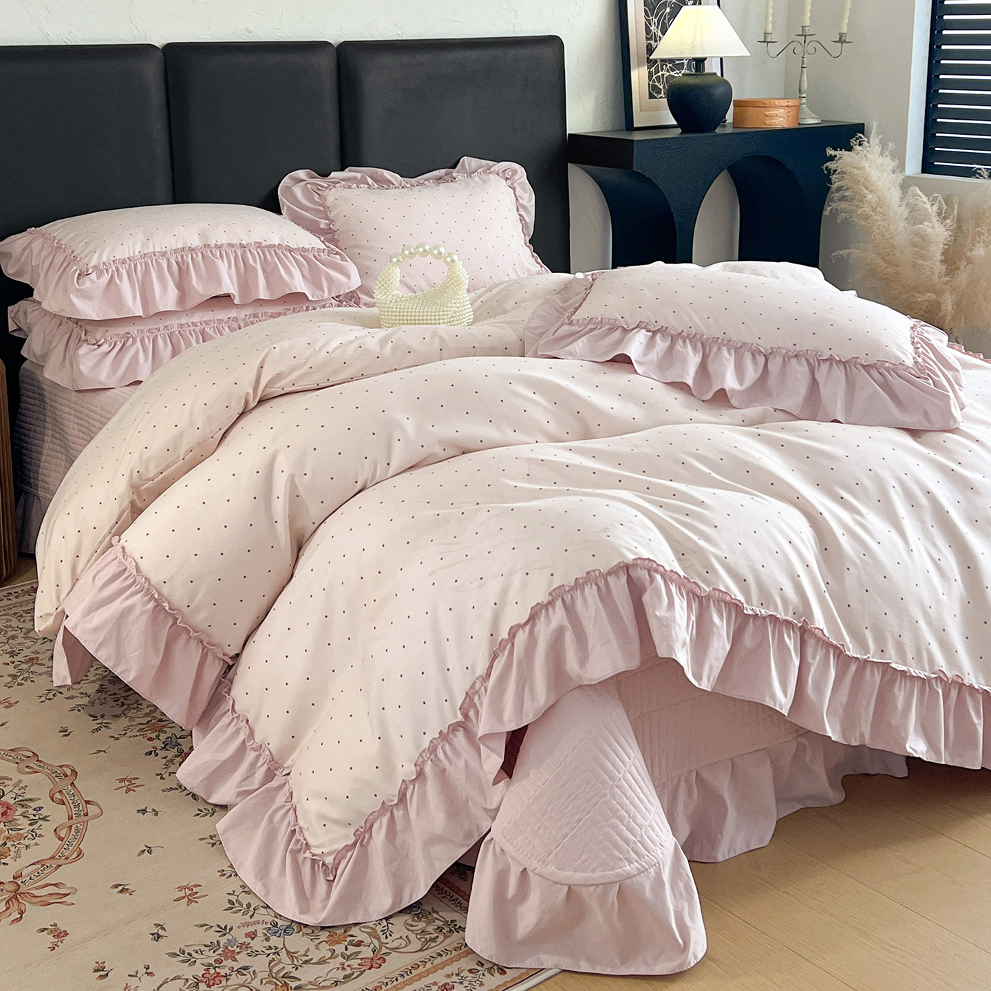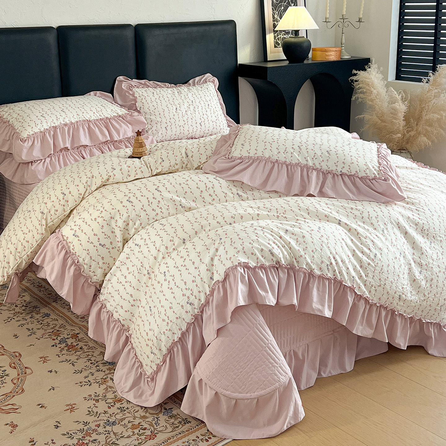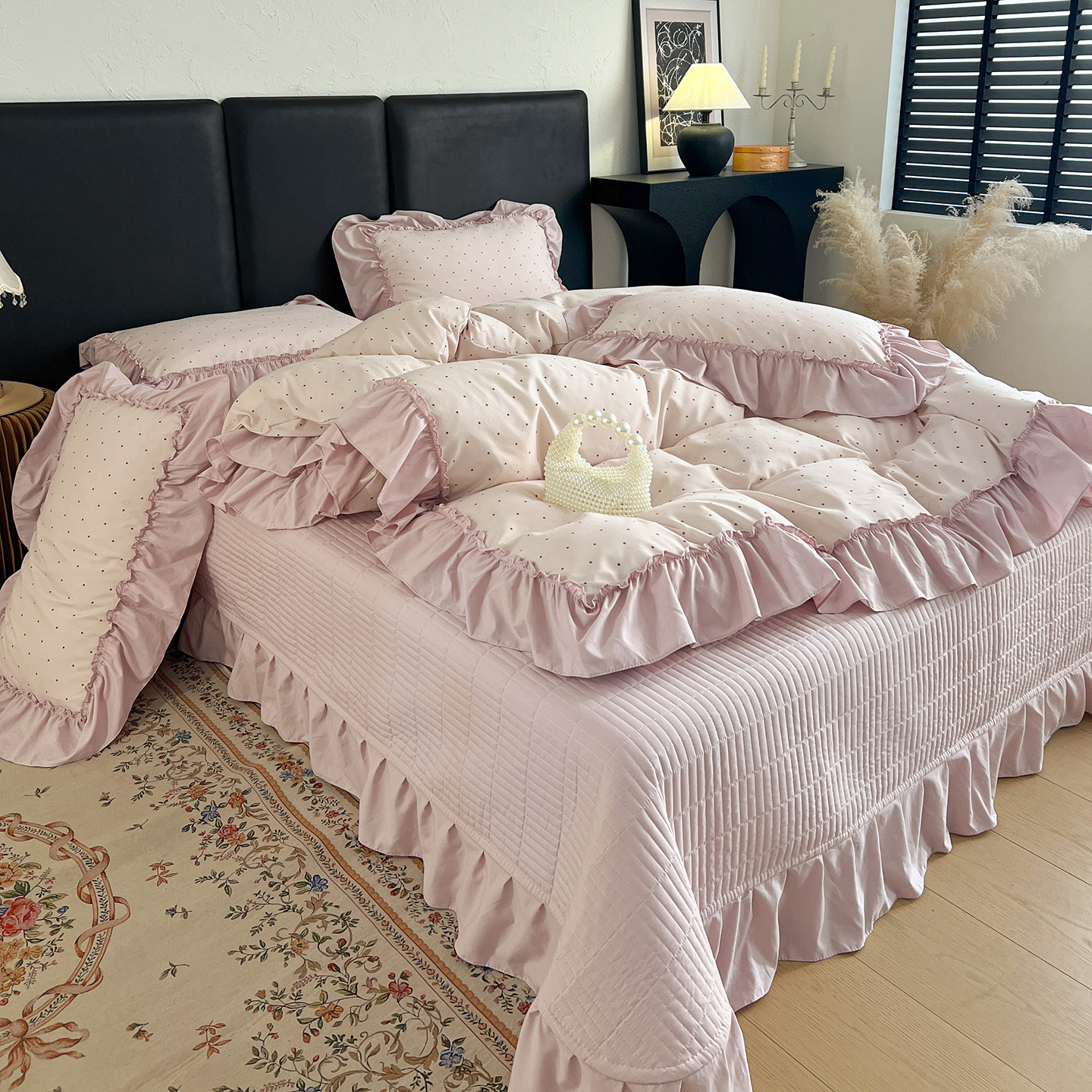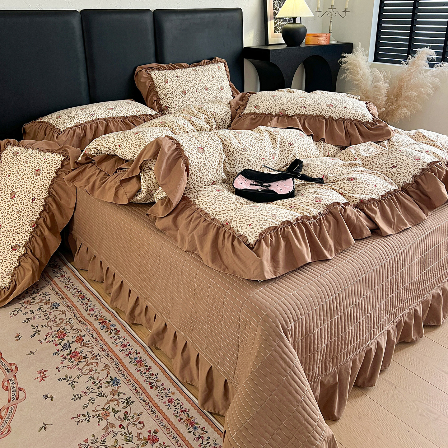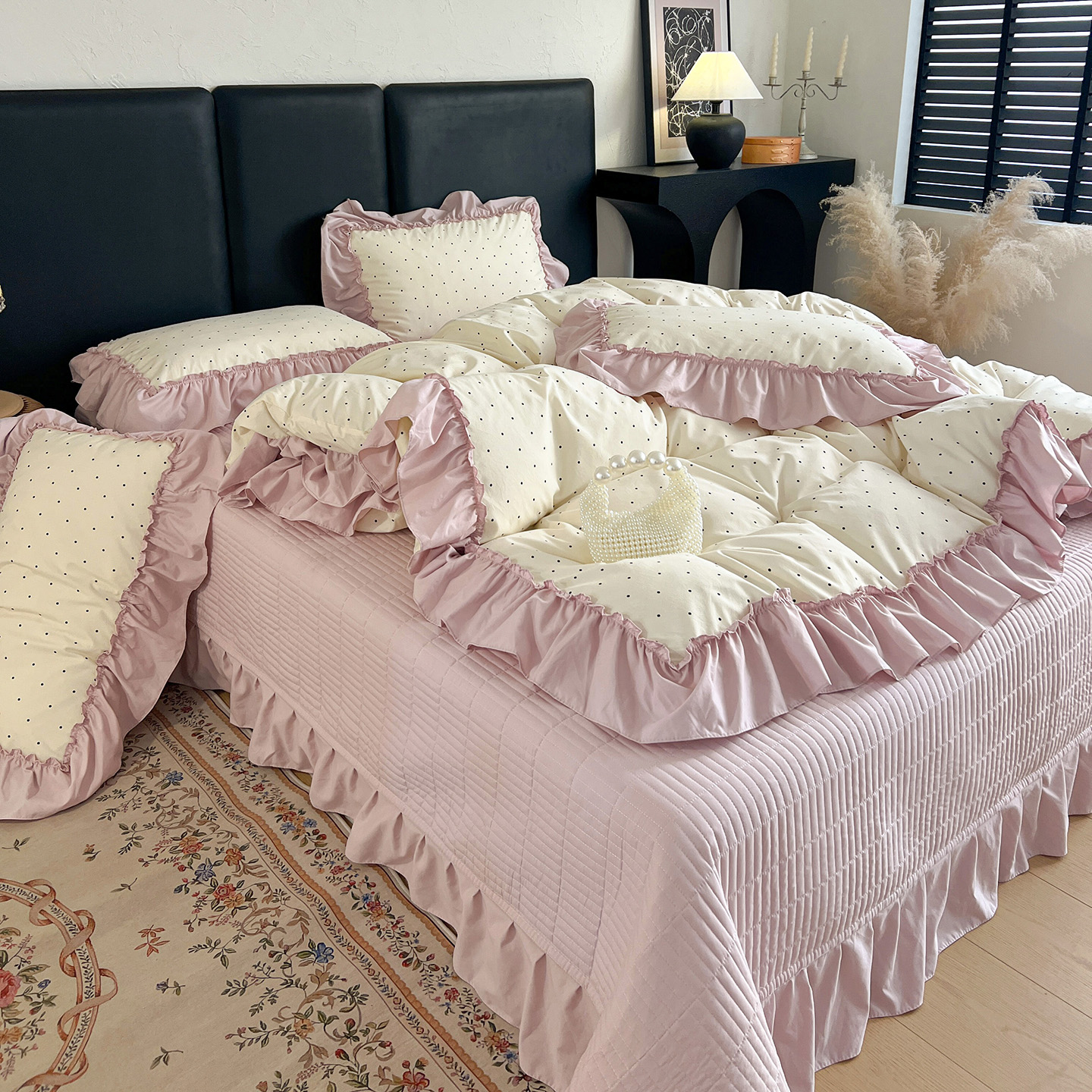 (总)梦莱斯 2026新款韩系古法韩国水洗棉云棉大布袋法式浪漫大花边床盖四件套,豹纹猫咪,草莓奶冻,粉雾波点,粉樱小碎花,红莓点点,黄油小熊派对,焦糖碎金,浪漫玫瑰,蜜桔小苍兰,奶白波点,奶茶碎花,奶灰蝴蝶结,奶咖小兔,雾蓝小雏菊,芋泥波波,组合图
