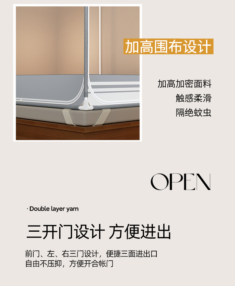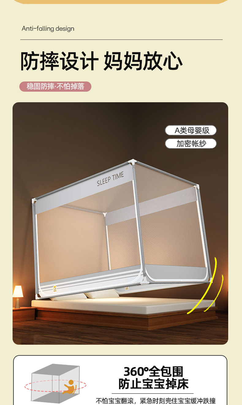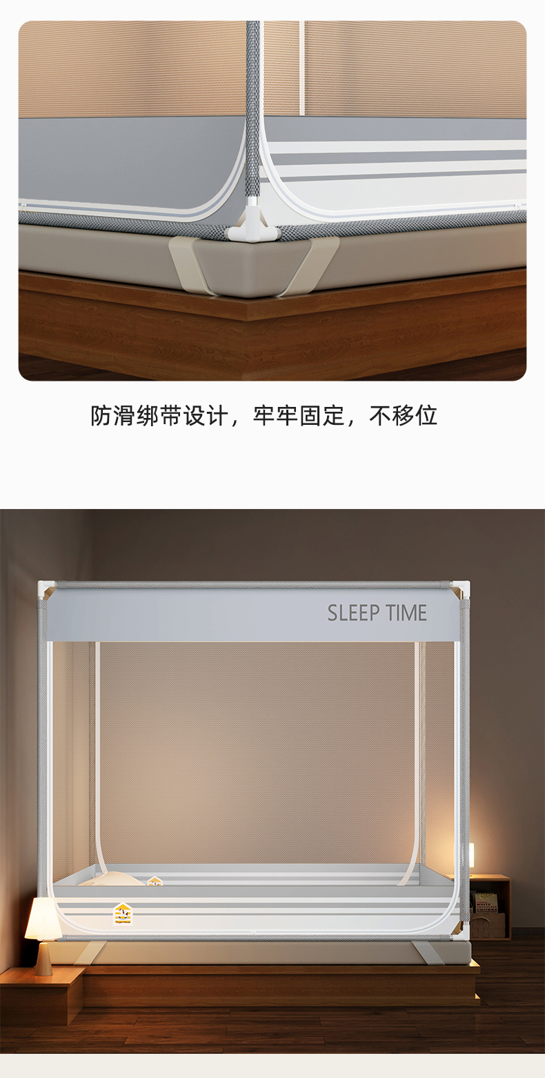商品名称:青竹苑 2026新款三门全底外穿坐床式蚊帐儿童防摔防蚊拉链方帐 大地灰