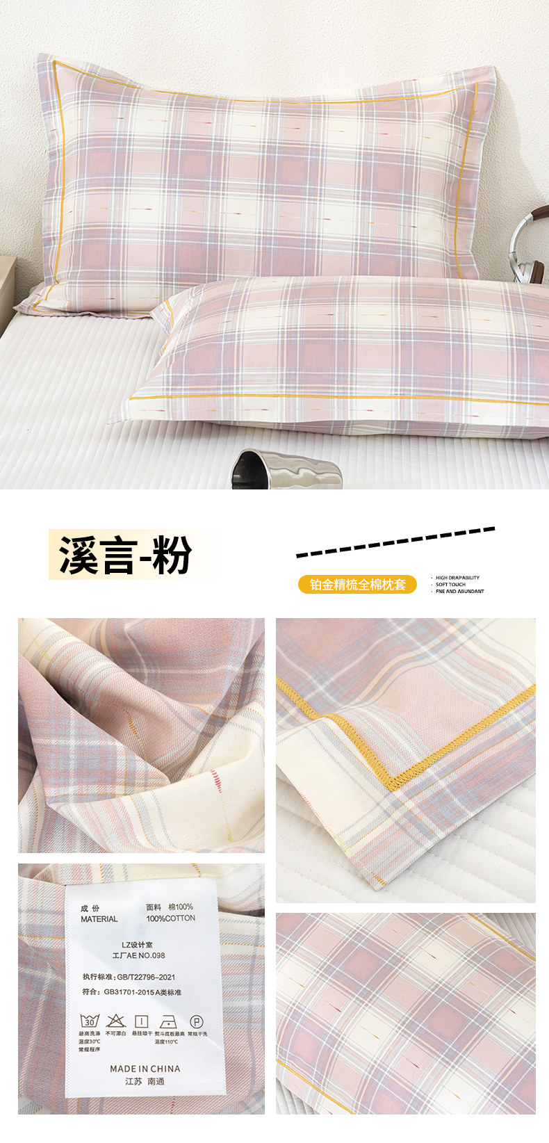 商品名称:良佐生活 2026新款40支铂金精梳全棉一字绣枕套 溪言-粉
