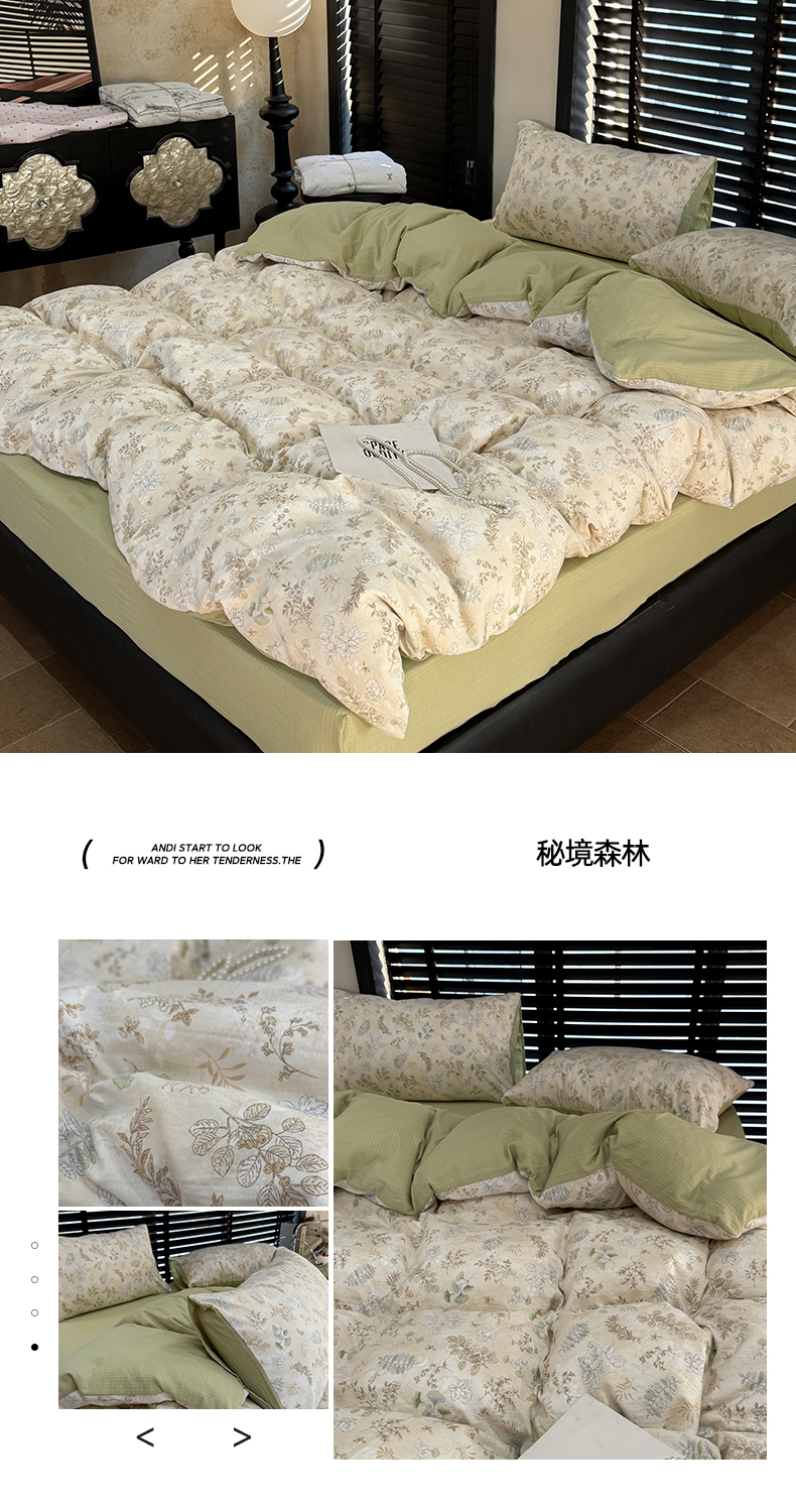 (总)美丽坊 2026新款韩系沐纱棉印花四件套,白茶,丛林喵,海盐纹,花与兔,可颂,兰茵,漫野,秘境森林,莫里,森林小熊,童趣粉,小月野