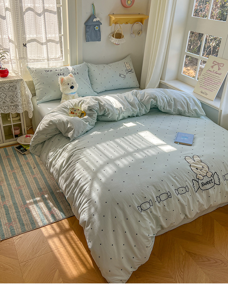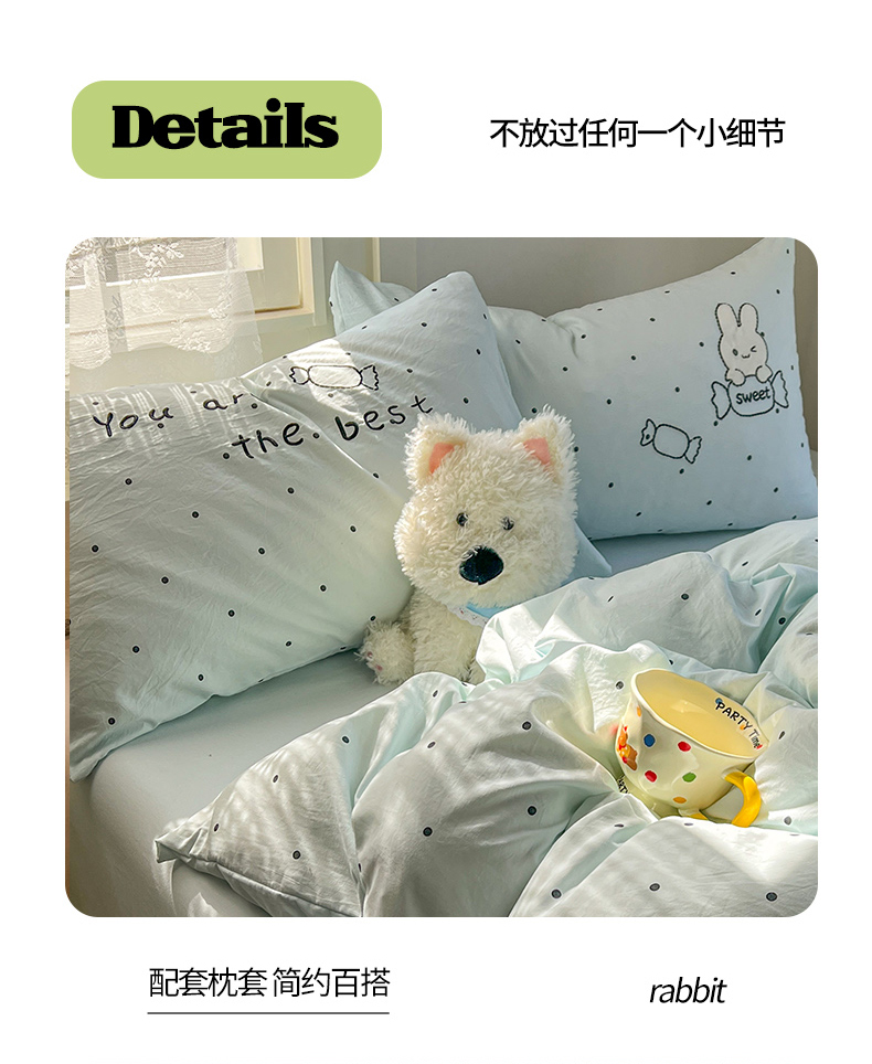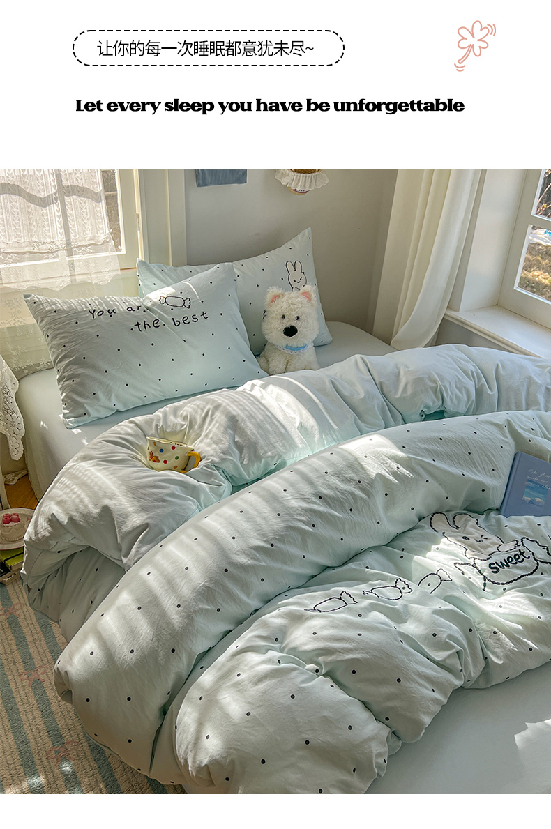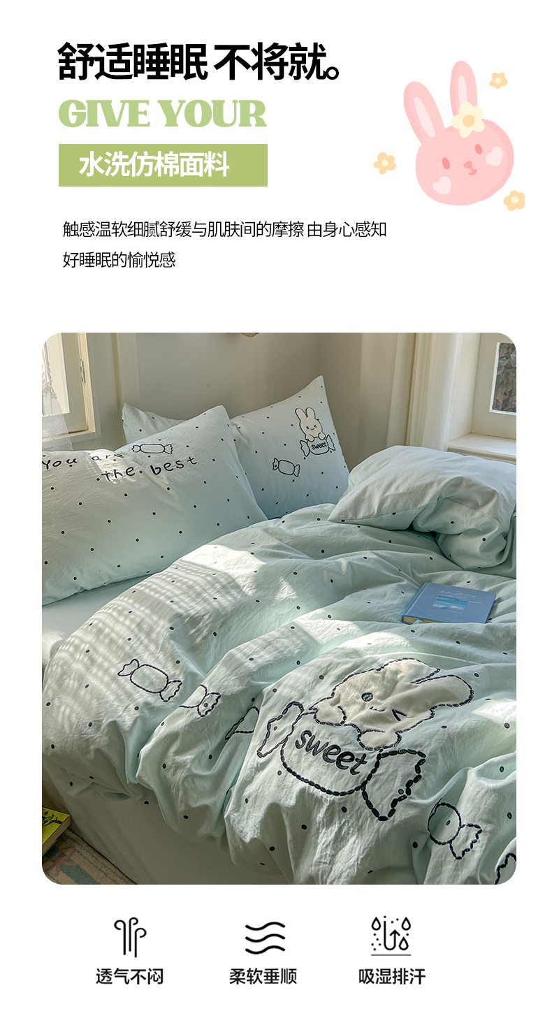 当前位置: 91家纺网 > 商品网购 > 床品套件 > 四件套 > 水洗棉四件套 > 贝凯瑞 2026新款仿棉木棉水洗棉绣花ins小清新床裙床单款四件套-糖果兔系列 糖果兔-天空蓝